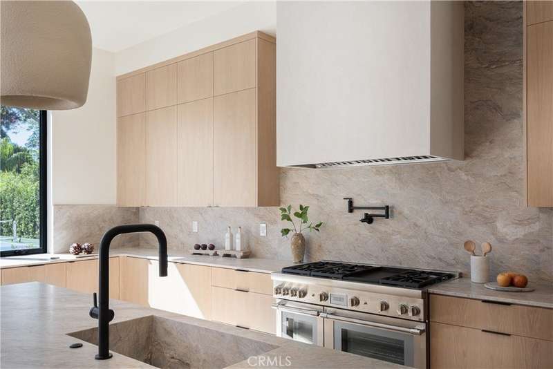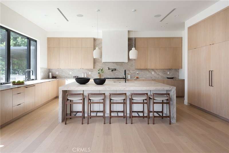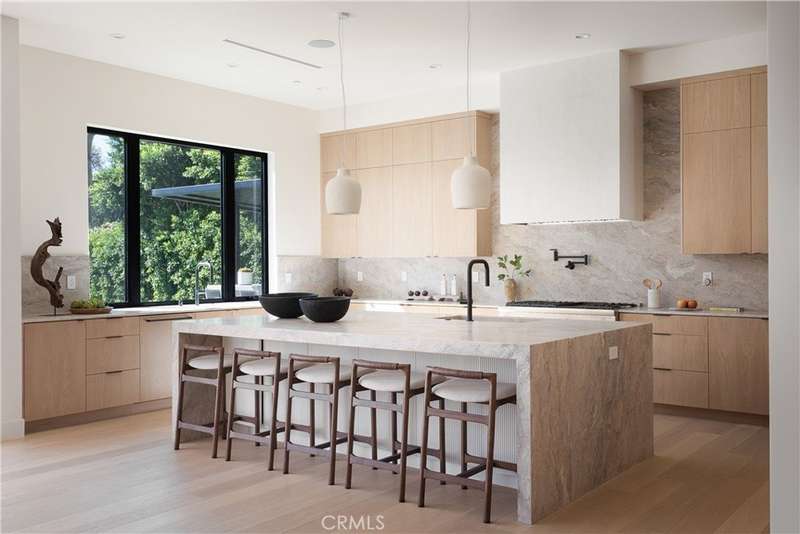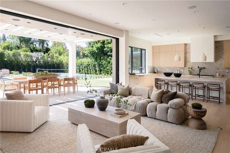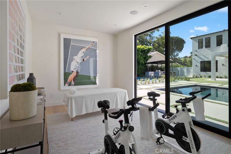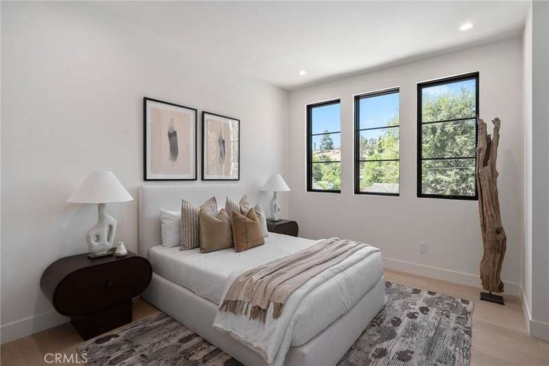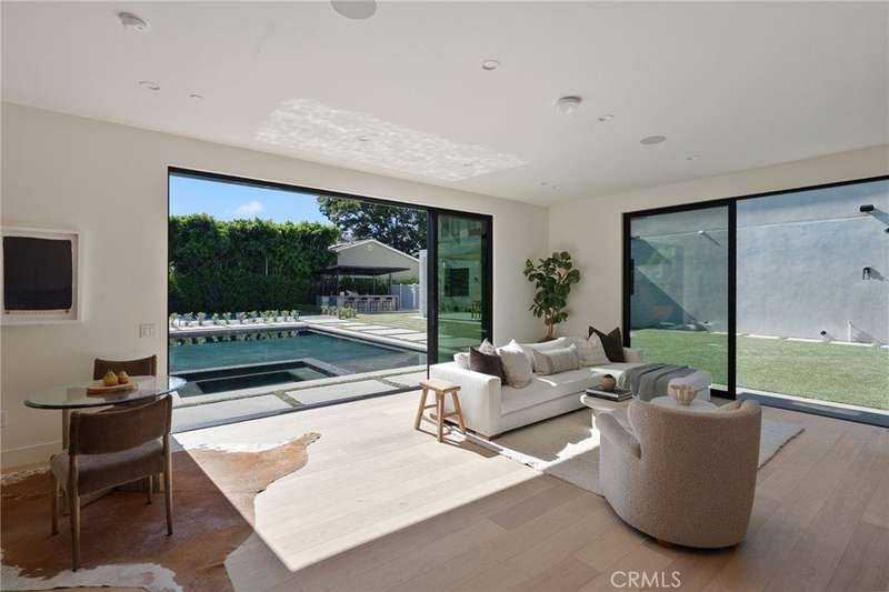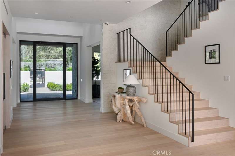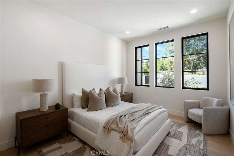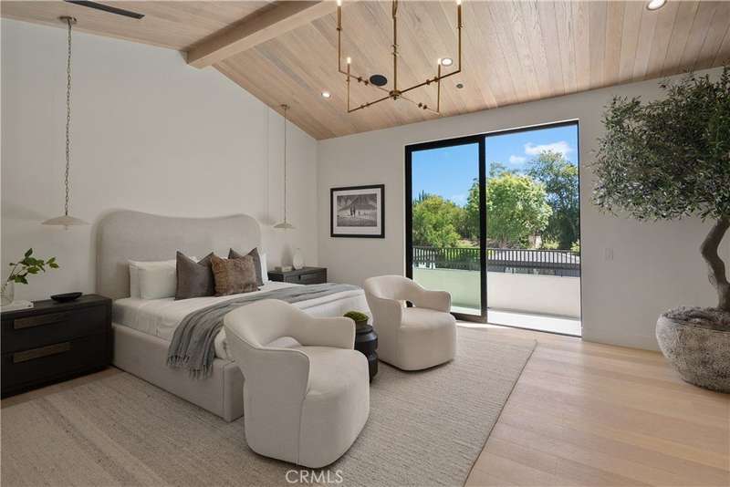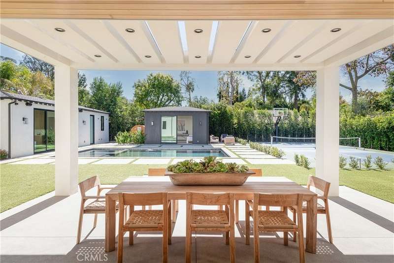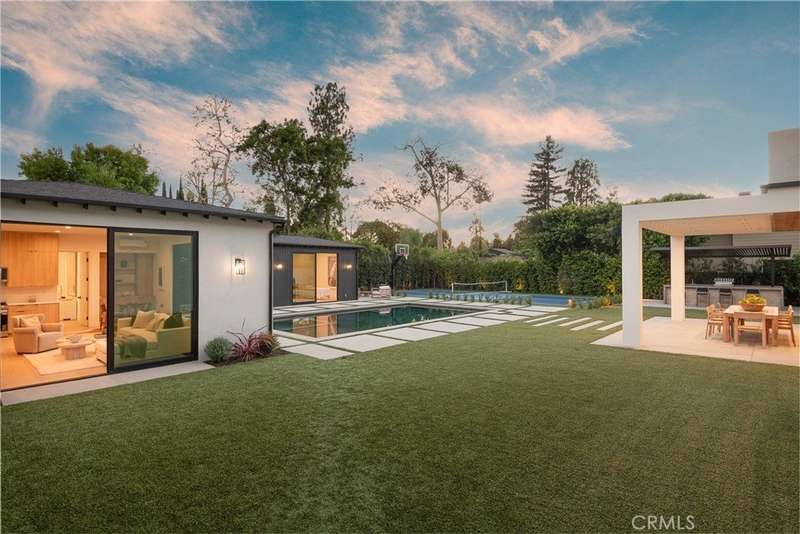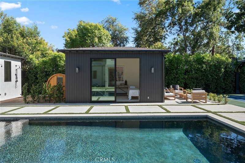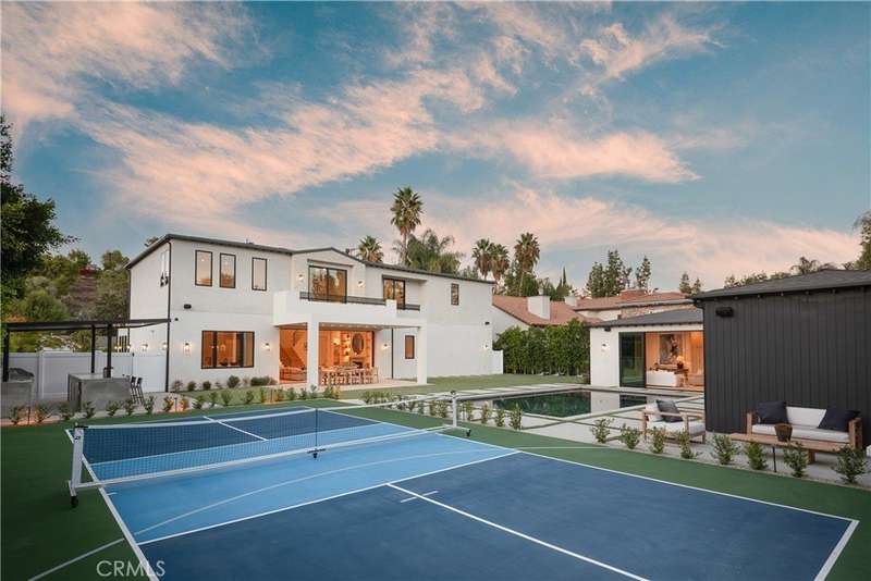Welcome to this exquisite gated estate located in Woodland Hills, Walnut Acres, on one of the quietest streets. This recently built luxury property offers 6,418 square feet of living space on an 18,338-square-foot lot, making it ideal for entertaining. The main residence spans 5,369 square feet and includes five bedrooms, each with its own en-suite bathroom, plus an additional guest bathroom. Other spaces include an office, a theater room, and convenient laundry facilities on both levels. Enjoy stunning balcony views from both the primary suite and the family room. Additionally, the property features an 830-square-foot guest house with a private large bedroom, en-suite bathroom, full kitchen, and laundry facilities. The expansive backyard perfect for entertaining includes a separate detached 219-square-foot gym, sauna, sports court, pickleball court, and a covered outdoor barbecue area, ideal for large gatherings.