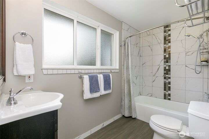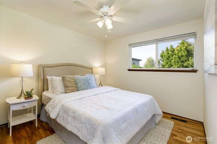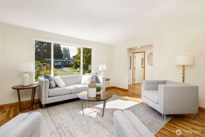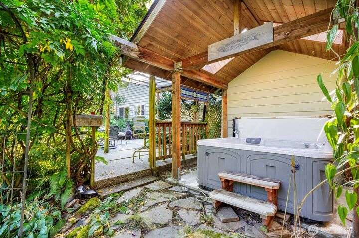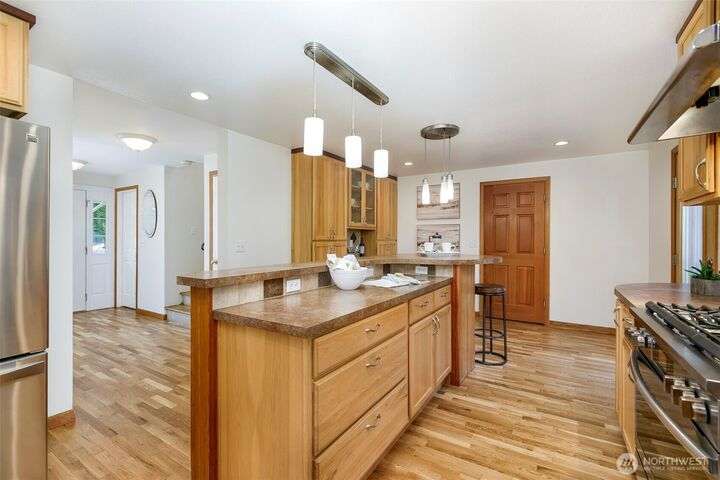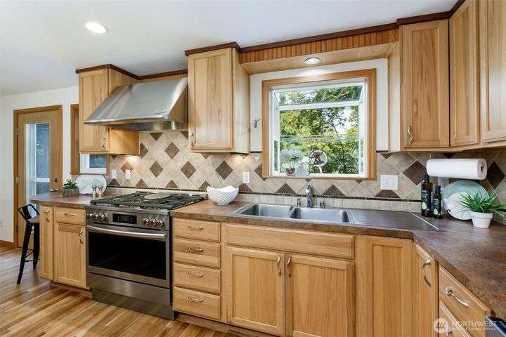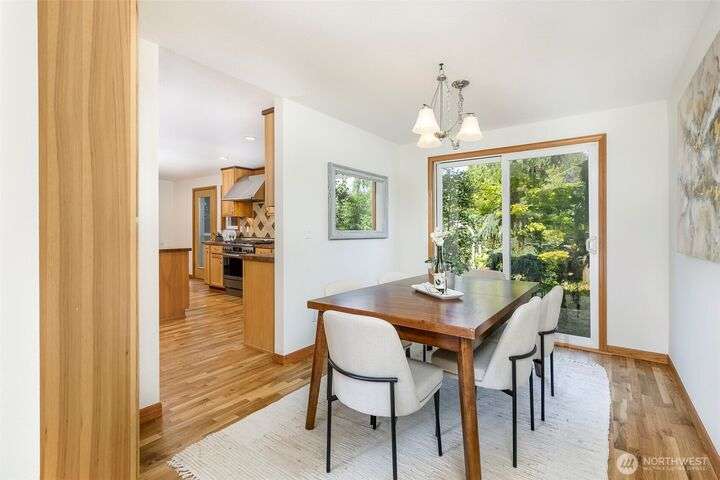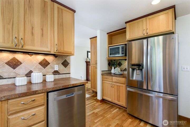 Unique 2-story home w/ refinished hardwood floors in most of home. Bright living room w/ custom marble-faced fireplace/woodstove & mantle. Dining room overlooks backyard & garden areas. Spacious kitchen w/ abundant Hickory cabinets, newer stainless appliances & great yard views. Side load staircase leads to large bonus room over garage + oversized closet area. Head upstairs to 3 bedrooms. 2-room primary suite w/ custom doors, closets & private, updated bath. Unique 2nd hallway to secondary bdrms. Fantastic yard w/ thoughtfully curated & sited trees & plantings to assure privacy + great seasonal colors & enjoyment. Fully fenced yard w/ 2 garden sheds. Looking for a real yard for great fun? This yard fits your needs. Pre-inspected & ready 4 U