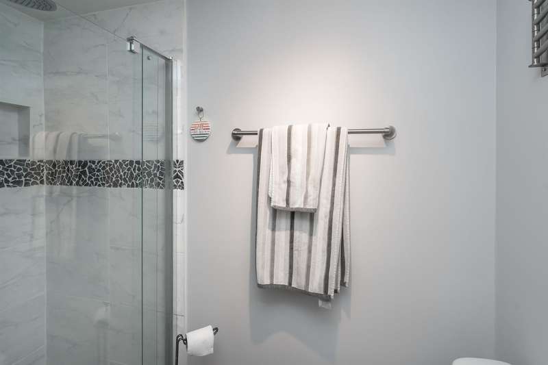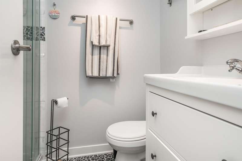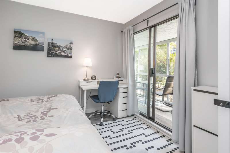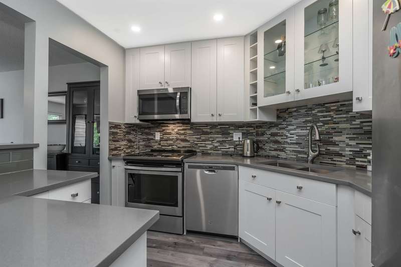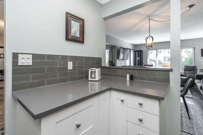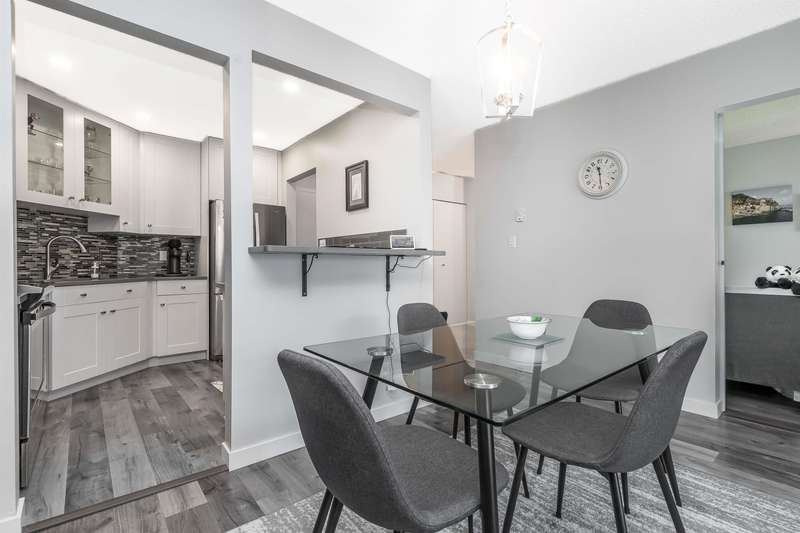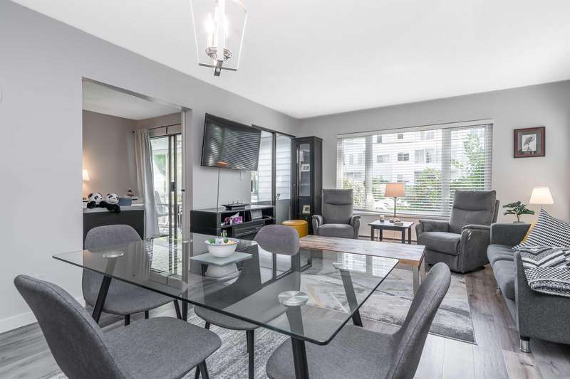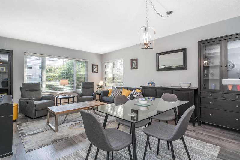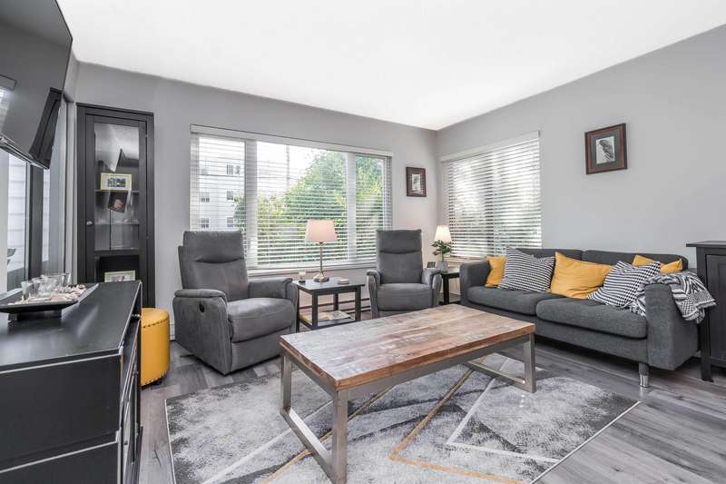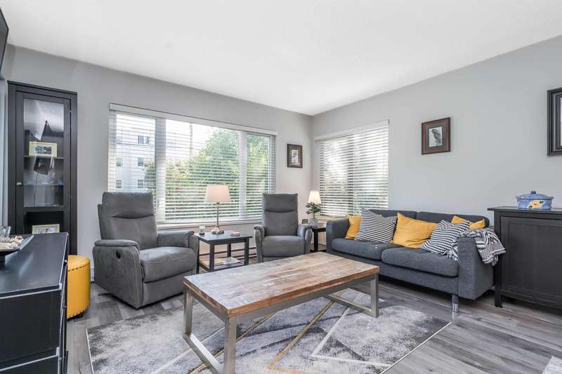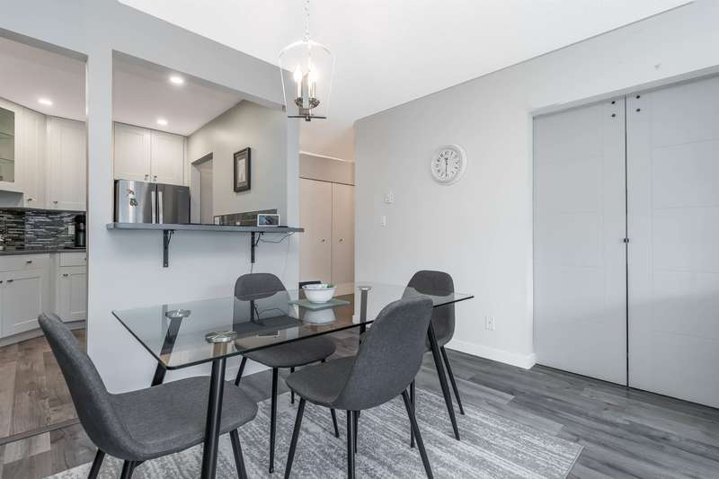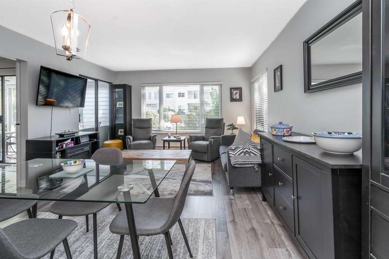 Summerhill. MOVE-IN READY! Furnished & beautifully updated 2 bed, 2 bath home in the heart of White Rock. Immaculate and well designed condo offers a modern kitchen with quartz countertops, white cabinetry, stainless steel appliances (new fridge) & double sinks. Designer colour scheme, stylish laminate flooring throughout with a bright spacious living room offering unique sliding barn doors leading into the 2nd bedroom. Primary bedroom has walk thru his/her closets & extra built in storages beside the bed. Enclosed sunroom (included in sq.ft.) with sliding glass doors & bonus storage! 1 parking stall & storage locker underground. Condo includes furniture. Centrally located within walking distance to White Rock town centre with its many shops & restaurants. 55+ age restriction & 1 cat ok.