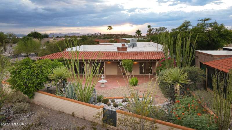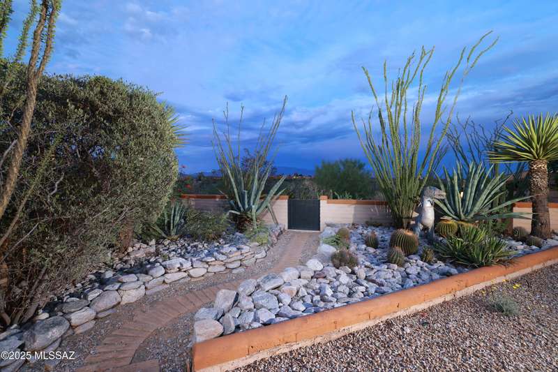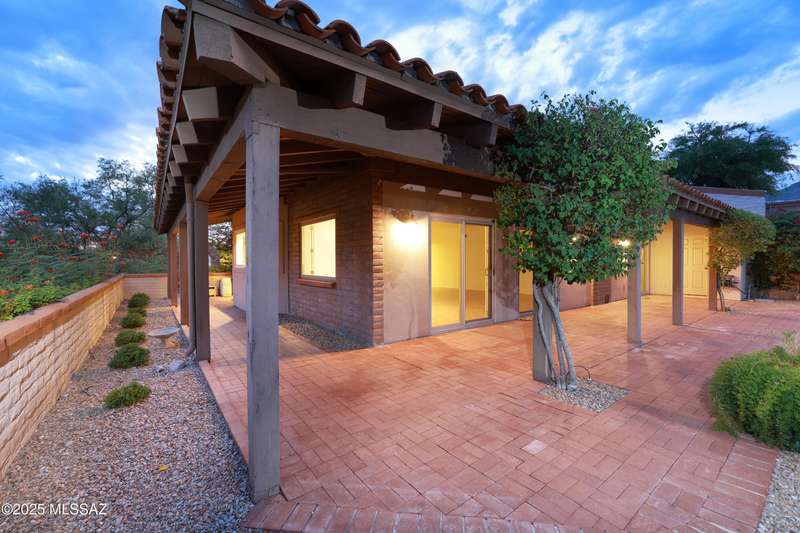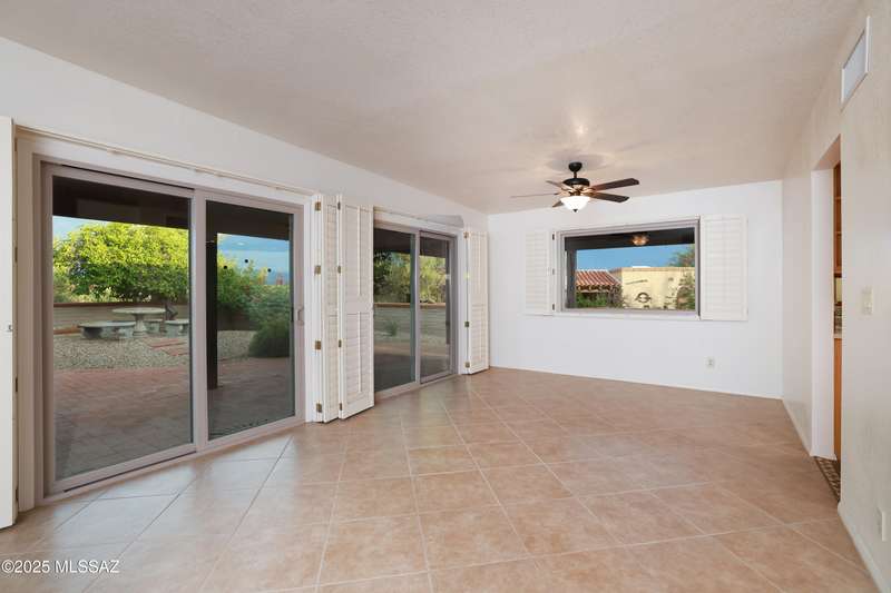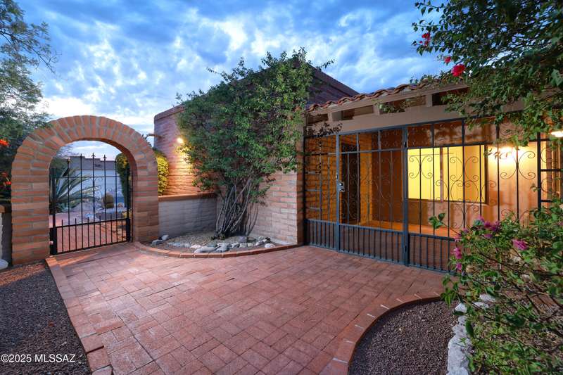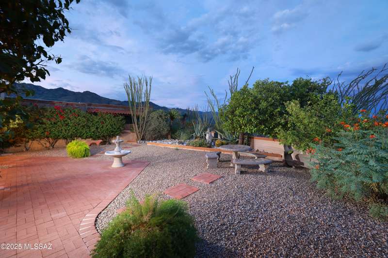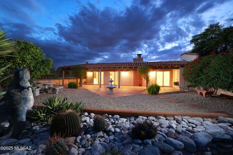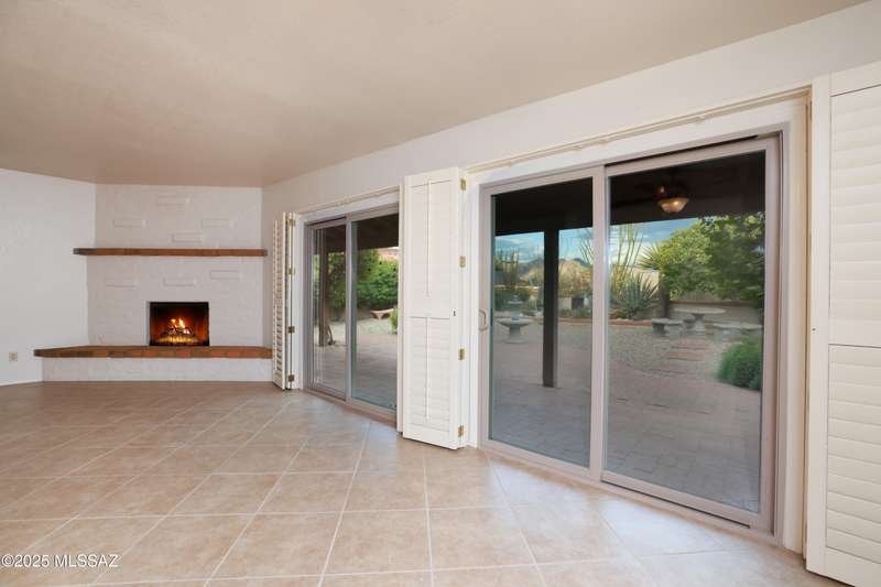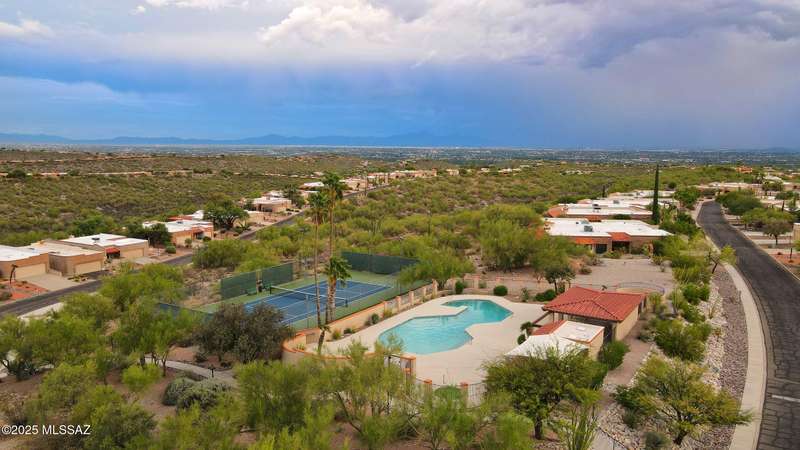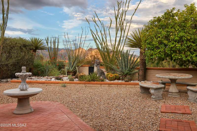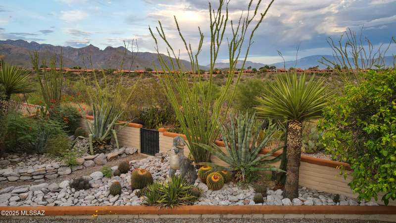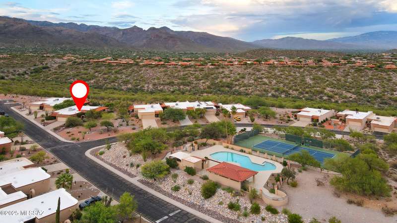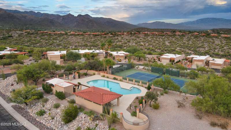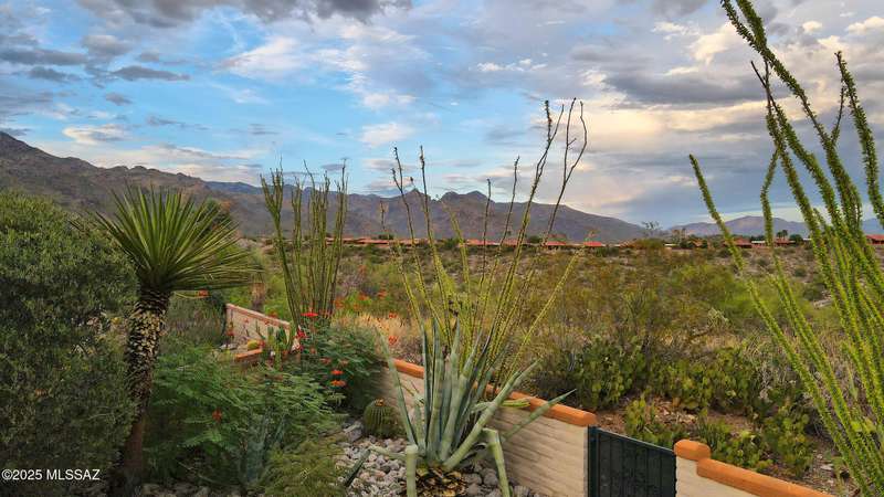Beautifully remodeled Miramar with a coveted east facing back yard with wrap around patio sitting atop one of Fairfield's highest ridges with unobstructed panoramic views of the natural desert canyon, Catalina and Rincon Mountains. A gated courtyard entry greets visitors, bright and cheerful natural light throughout, huge primary suite with gorgeous bath and patio access, open floor plan with a wood burning fireplace in great room, large eat-in kitchen with tons of storage, spacious garage with built-in storage. Located across the street from the community pool.