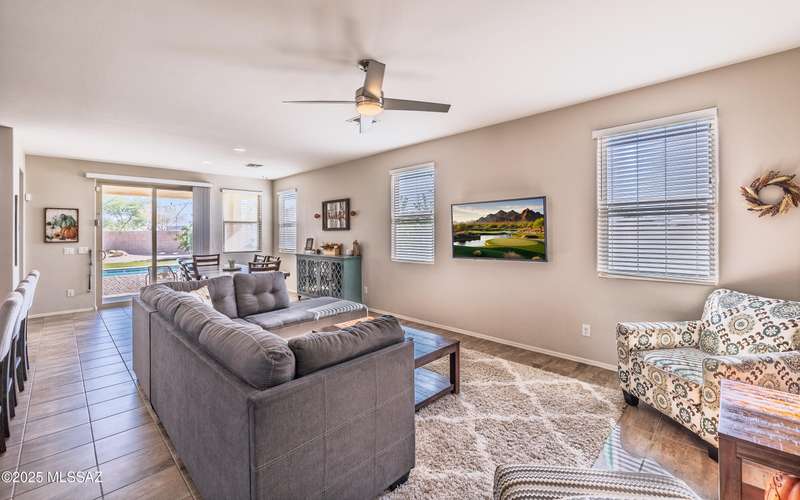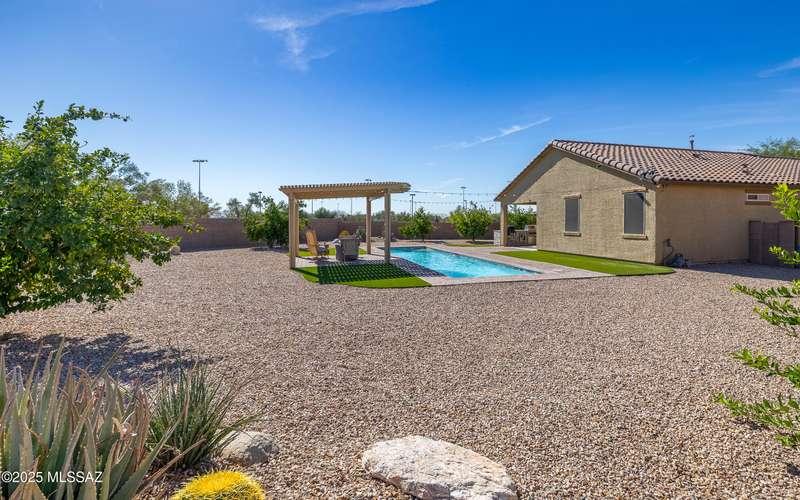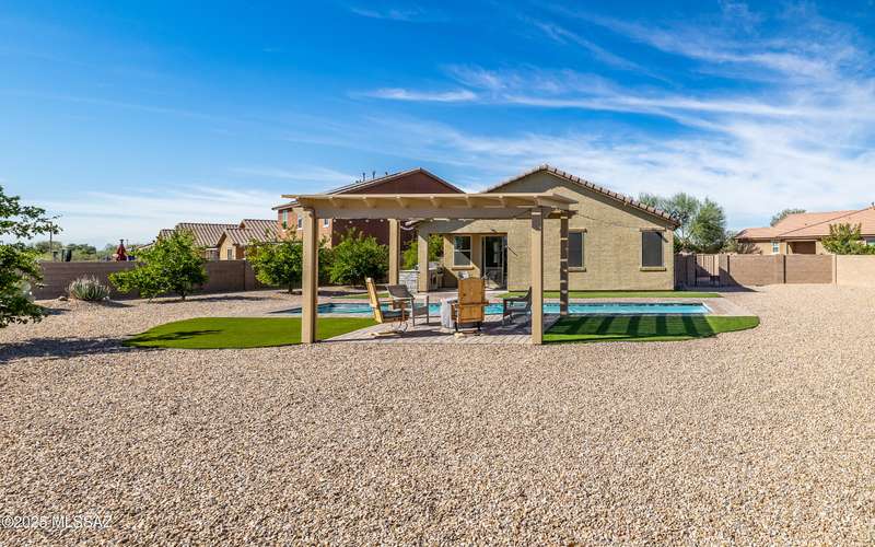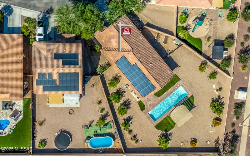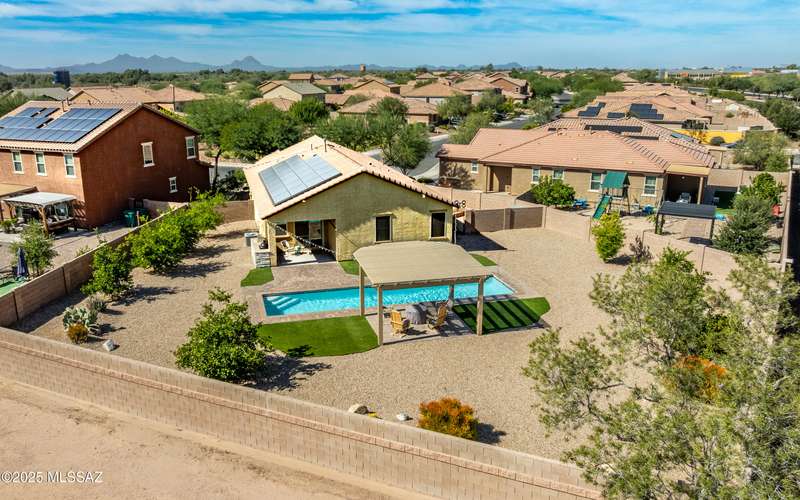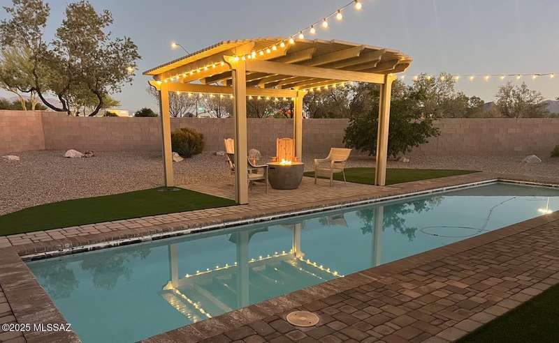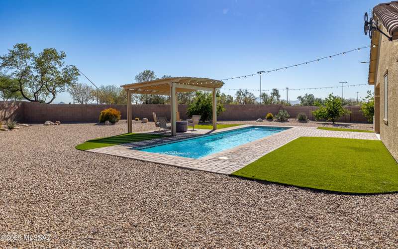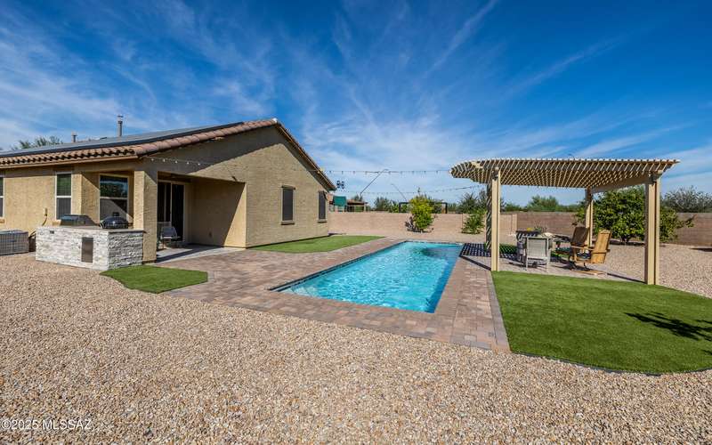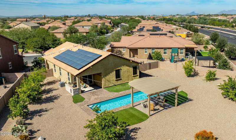 Resort style outdoor living awaits you. Rare and special lap pool centers your backyard surrounded by beautiful brick pavers and artificial turf. Pergola ramada relaxation next to pool. Newly installed outdoor BBQ grill kitchen station.It's all about the outdoors - relaxation & recreation! Property hosts fruit trees + has raised garden beds (which await your fall plantings). Extra bonus is owned outright solar! Utility savings and recreation highlights! All on a nicely oversized lot. Home is crisp & neat - inside and out. Lovely kitchen opens to spacious great room. There is an extra den/office to compliment the 3 bedrooms. All laundry & kitchen appliances convey w/accepted offer. Only carpet is in bedrooms. Garage has upper storage racks. Great location-outstanding yard-lovely home.+