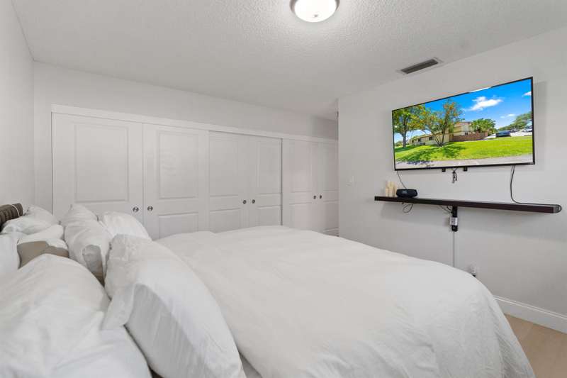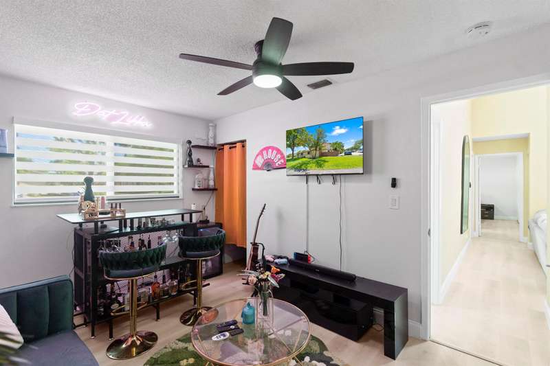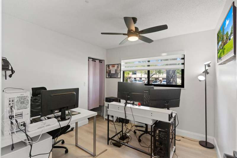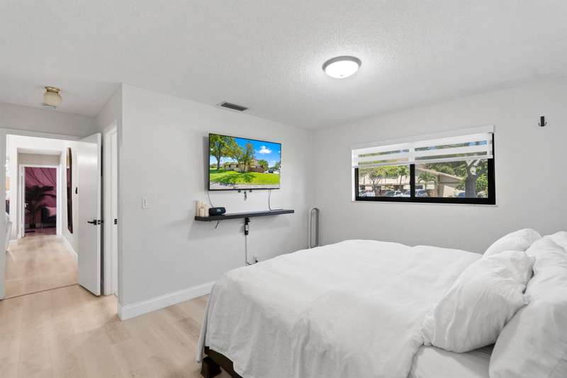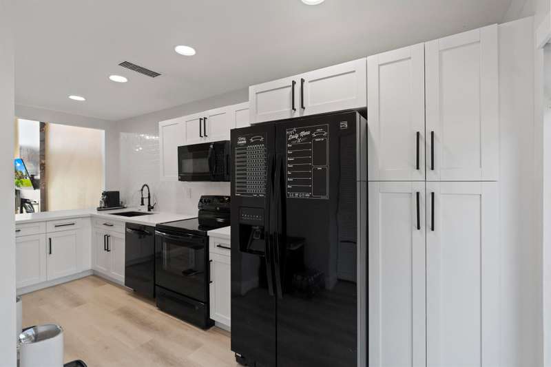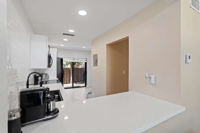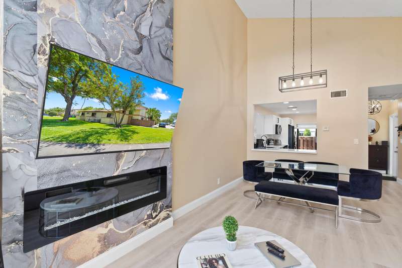 Come see this beautifully renovated, move-in ready, 3-bedroom, 2-bathroom corner townhome! This modern home offers an open floor plan, vaulted ceilings in the great room, and large windows with sliding glass doors that flood the space with natural light. Custom zebra blinds have been thoughtfully installed on the windows. The fully updated kitchen features wraparound quartz countertops, soft-close white cabinetry, subway tile backsplash, and a deep 10-inch black stainless steel sink with air-push disposal. The home boasts stylish waterproof grey-toned laminate flooring, updated lighting, remodeled bathrooms, and a cozy electric fireplace for added ambiance. Enjoy peace of mind with brand-new roof, newer water heater, impact windows and doors, and a full-size washer and dryer.