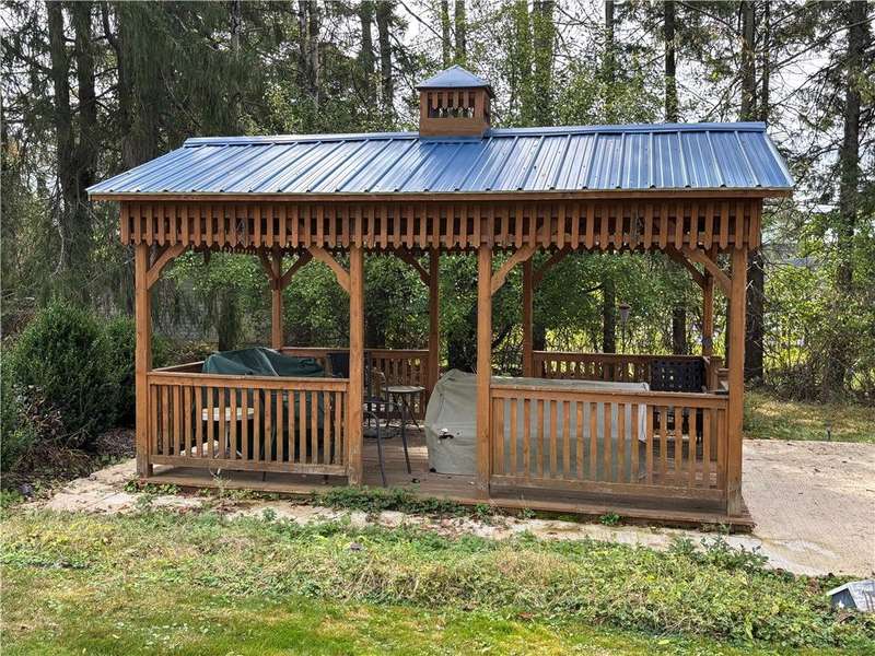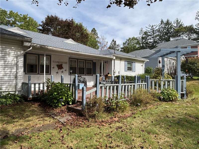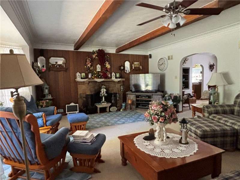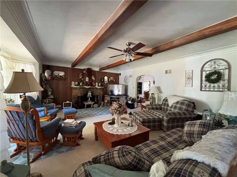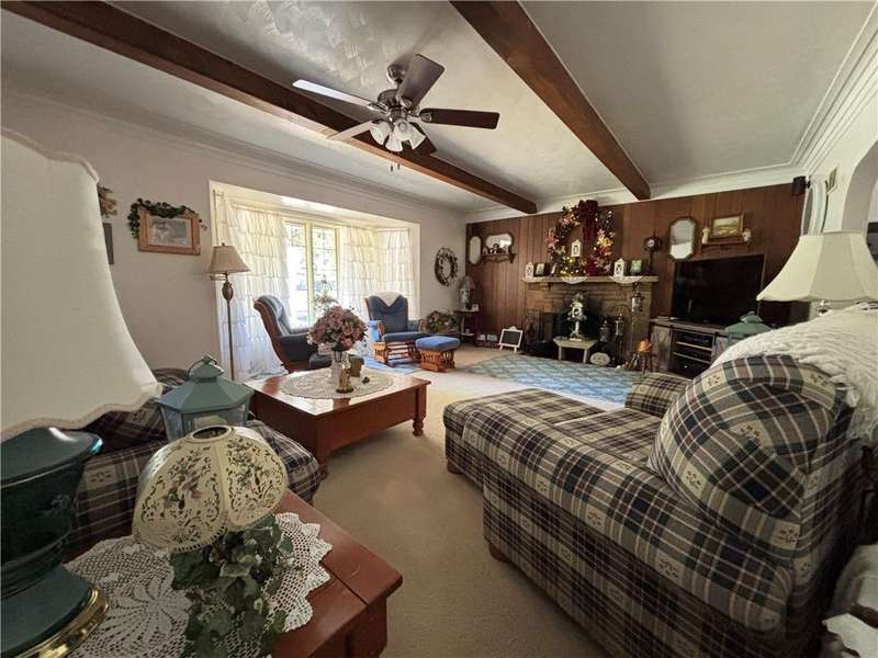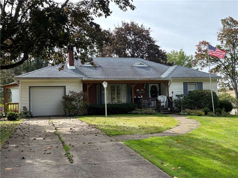 FABULOUS LOCATION WITH A STUNNING PARK VIEW! This charming one-story ranch features 3 bedrooms, 1 bath, and sits on just under an acre right across the street from Evergreen Park. There is an attached one-car garage plus a detached garage. The home boasts an oversized kitchen with ample cupboard space and includes all appliances: electric cooktop, built-in wall oven, microwave, refrigerator, and washer/dryer combo. The spacious living room has a cozy wood-burning fireplace and a picture window overlooking the park. The dining room offers built-in shelves and a lovely view of the backyard. All three bedrooms are generously sized with closets. The huge basement provides great potential for additional living space. Outside, enjoy a large deck, a pavilion, and a concrete pad with a firepit?perfect for entertaining!