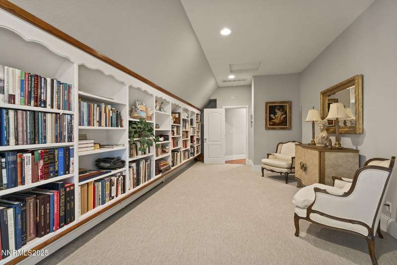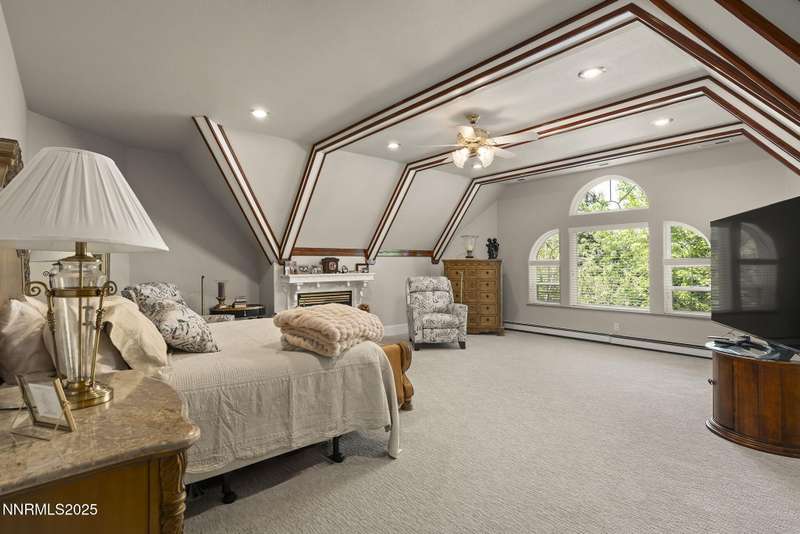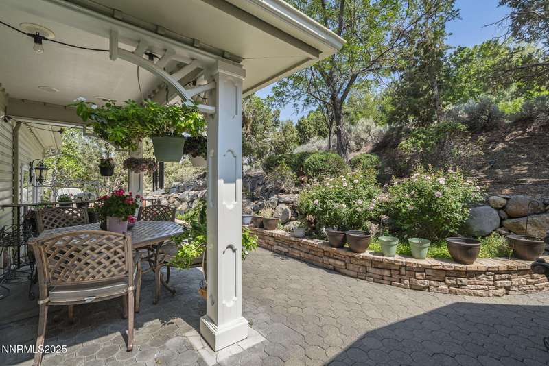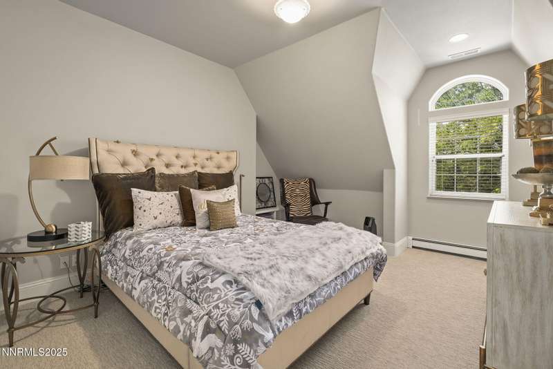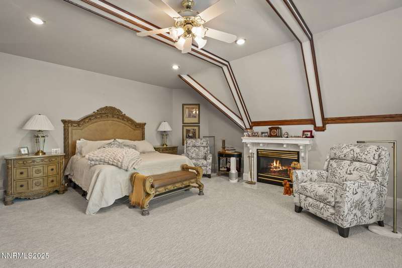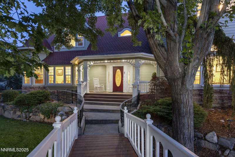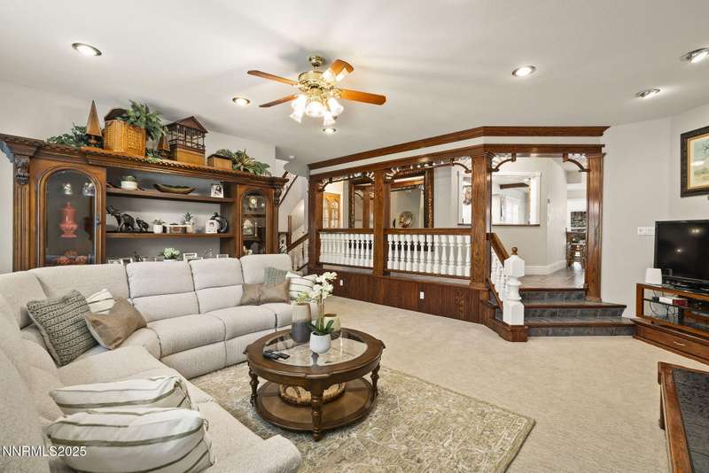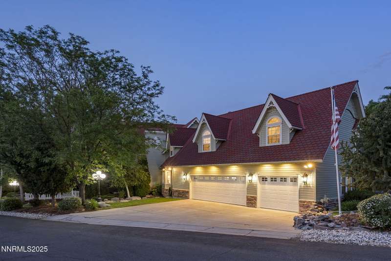 A true Victorian-inspired, custom-built home in the coveted neighborhood between Caughlin Ranch and Juniper Ridge. Enjoy the private road, without the restrictions of an HOA. This home exudes timeless charm, craftsmanship, and functionality on a beautifully landscaped 1-acre lot with mature shade trees, beautiful flower beds and true curb appeal. A quaint bridge and welcoming front porch set the tone for the warmth and character found inside. Step into a grand oak parquet entry and be greeted by handcrafted woodwork throughout, including two dramatic spiral staircases with hand-turned banisters, ornate fireplace mantles, and custom millwork. On the main level, you'll find a formal parlor, ideal as a music room or formal sitting area with a welcoming bay window seat. The entry flows into a large living room anchored by a gas fireplace and window seating, perfect for cozy gatherings. The kitchen is a chef's haven, featuring a peninsula, island cooktop, walk-in pantry, durable tile floors, and high-end, 3yr-old KitchenAid appliances, including a built-in refrigerator and oven with warming drawer. The adjacent breakfast nook opens to a covered atrium with skylights and handcrafted wood artwork, creating space for year-round gardening. Host in style with the elegant formal dining room and a connected wet bar with mini-fridge, crystal cabinetry, and ample space for entertaining—with french doors opening directly to a covered patio for effortless flow. Upstairs, the expansive primary suite is a private retreat, featuring its own staircase leading to a cozy anteroom with built-in bookshelves, private balcony, fireplace, luxurious jetted bath, walk-in closet, and a bonus flex room perfect for a nursery, home gym, or office. Three additional bedrooms offer spacious closets and comfort for family or guests. A full-sized laundry room is conveniently located upstairs with built in cabinetry for plenty of storage. Additional highlights include a 3-car epoxied garage, with one bay converted to a functional workshop. 220V power is available. The water heater and boiler are just 5 yrs old and recently serviced. This home is on septic, but city sewer runs in front of the home, creating the option to connect, if desired. The location can't be beat with proximity to the nearby Caughlin Ranch trails, the Steamboat ditch trail, Mayberry Landing, and some of the highest-rated schools within the district. Whether you're drawn to its craftsmanship, elegance, or hosting potential, this one-of-a-kind residence offers a rare combination of artistry and livability in one of Reno's most desirable locations. Schedule your private tour today!