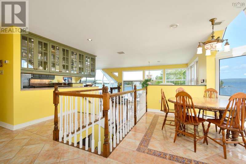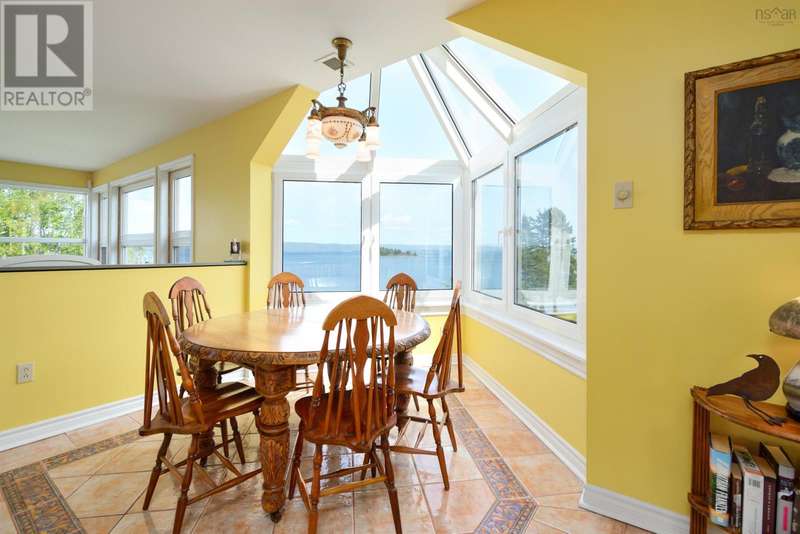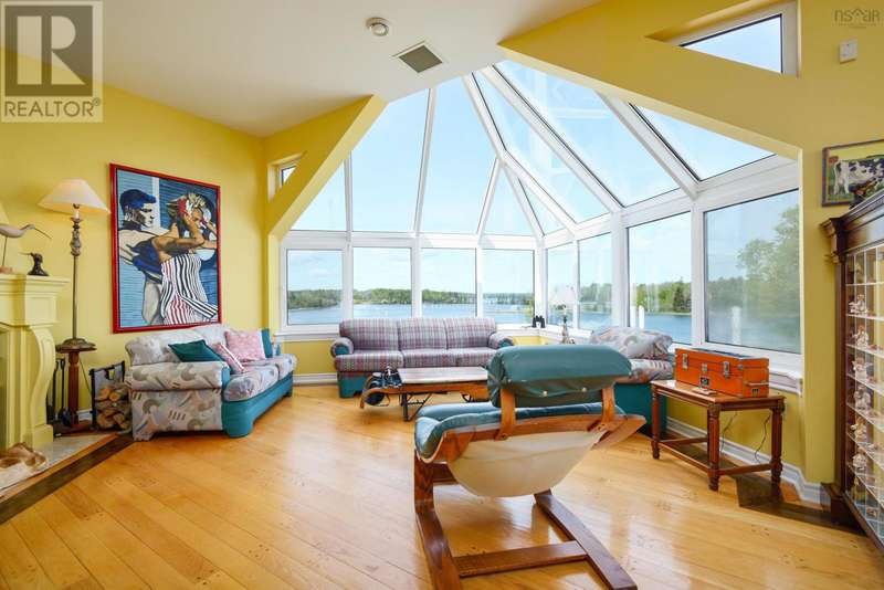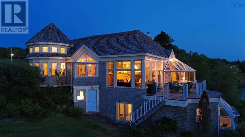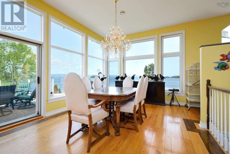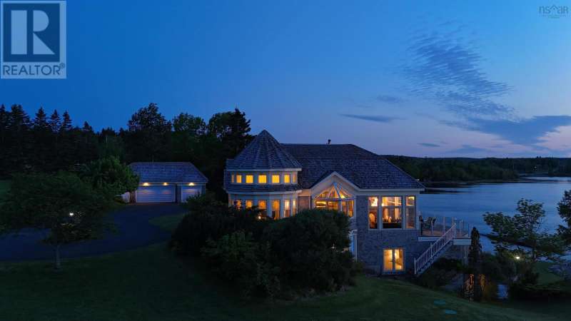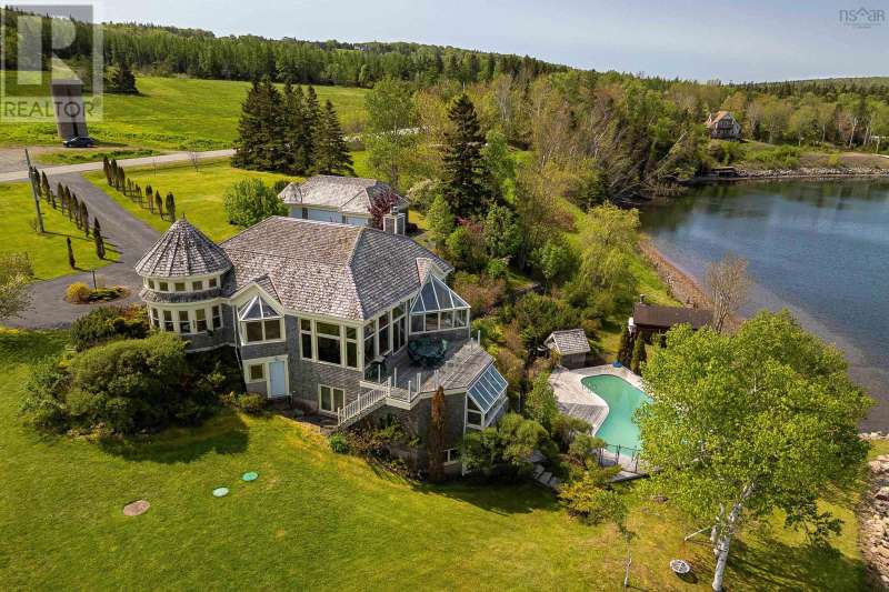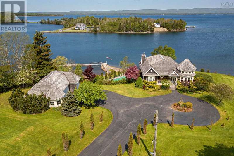 Welcome to a truly extraordinary waterfront retreat in Dundee, NSdirectly across from the renowned Dundee Golf Course and fronting on the majestic Bras dOr Lake, the worlds largest inland saltwater fjord which offers some of the finest sailing in the world. This 2.33-acre estate offers nearly 500 feet of pristine shoreline and a private pier, perfect for mooring your sailboat just steps from home. The property has striking curb appeal with a circular paved driveway, turret with stained glass, manicured gardens, and a detached three-car garage. Whats not visible from the road is the architectural gem cascading down the hillsidethree glass-faced levels offering spectacular lake views from every floor, designed to blend with the landscape and project the image of a glass ship at sea. Inside, the home features 5 bedrooms and 4.5 bathrooms, a living room with fireplace, dining room, family room, games room, and a chefs kitchen featuring a Heartland Classic Range and Built-in Double Ovenblending heritage design with modern performance, including nickel trim, warming drawer, and vintage-style details. A 36" Swarovski-Strass crystal chandelier with 24 candlelight bulbs is a focal point and adds a timeless elegance. Known for their exceptional clarity and brilliance, every crystal is laser etched with the Swarovski logo. This premium crystal masterpiece scatters rainbows in the morning sun, and flares with incredible colours at sunset. Hurricane-rated solarium windows connect you to the outdoors year-round, and the inground saltwater pool, with its private setting, completes the resort-like experience. A separate log cabin serves as a cozy guest house, perfect for visitors. The entire property enjoys a sheltered microclimate created by the surrounding mountains, offering four distinct and beautiful seasons.This property is a rare and elegant coastal haven in one of Nova Scotias most coveted locations. Sail, golf, enjoy celtic music & East Coast lifest (id:2494)