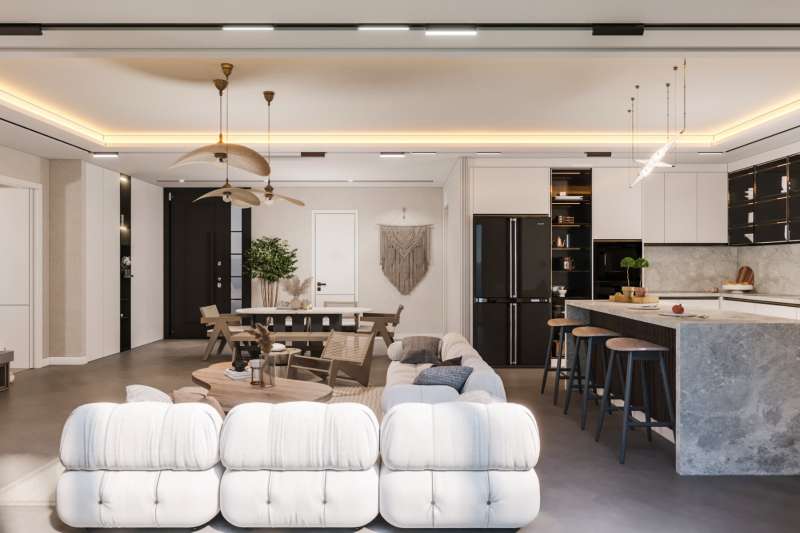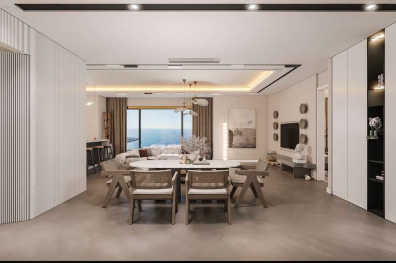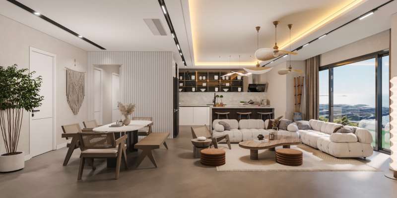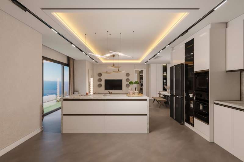 There are four and six-bedroom villa options in the complex. The four-bedroom villas have a living room, an open-plan kitchen, three bathrooms, and a balcony, while six-bedroom villas have a living room, an open-plan kitchen, five bathrooms, and a spacious terrace. The villas with outbuilding options consist of a living room, a bedroom, and a bathroom as an extra. In the interior design of the villas, top-quality materials and thermal insulation are used. There are five pieces of kitchen appliances and built-in wardrobes in the villas.