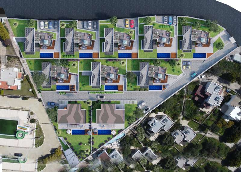 The complex, built on 6.500 sqm of land, consists of ten detached villas. The villas have private pools, spacious gardens, outdoor car parking areas, underfloor heating, and a VRF air conditioning system.
