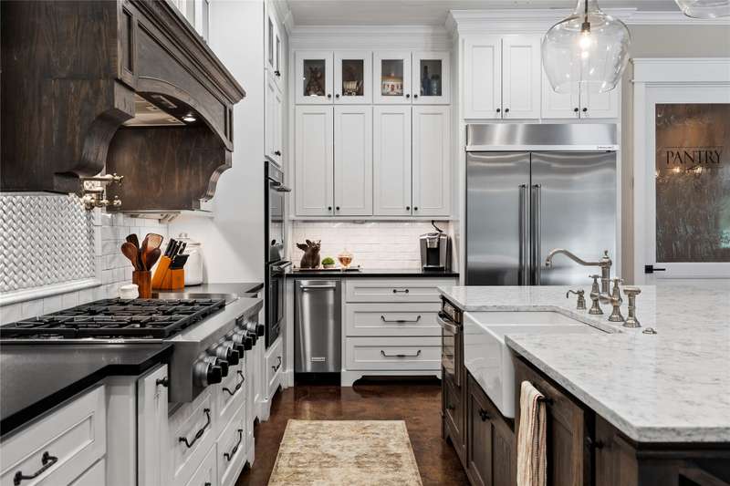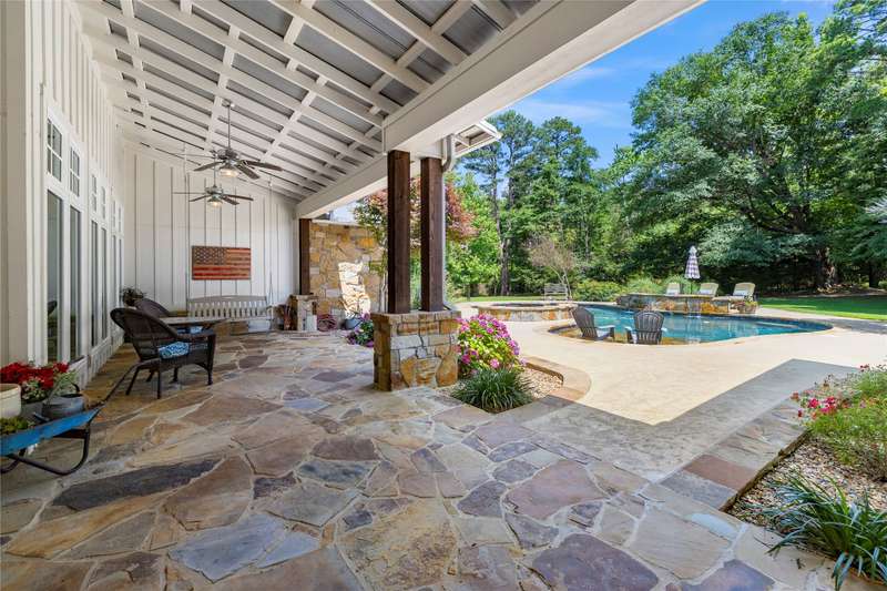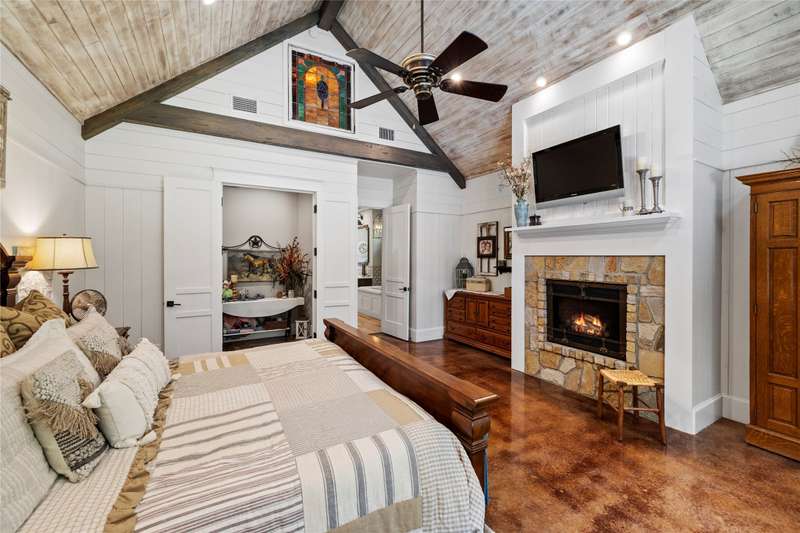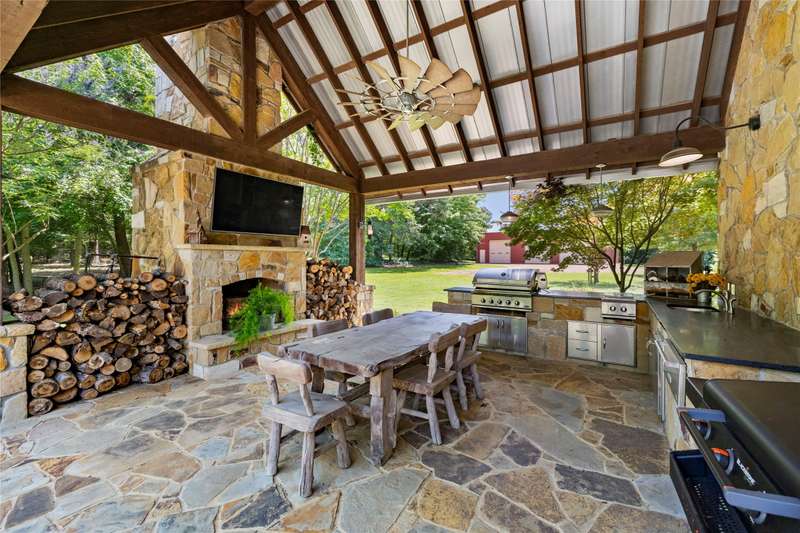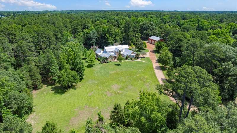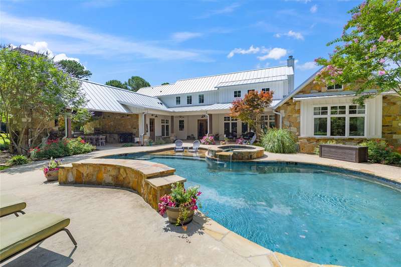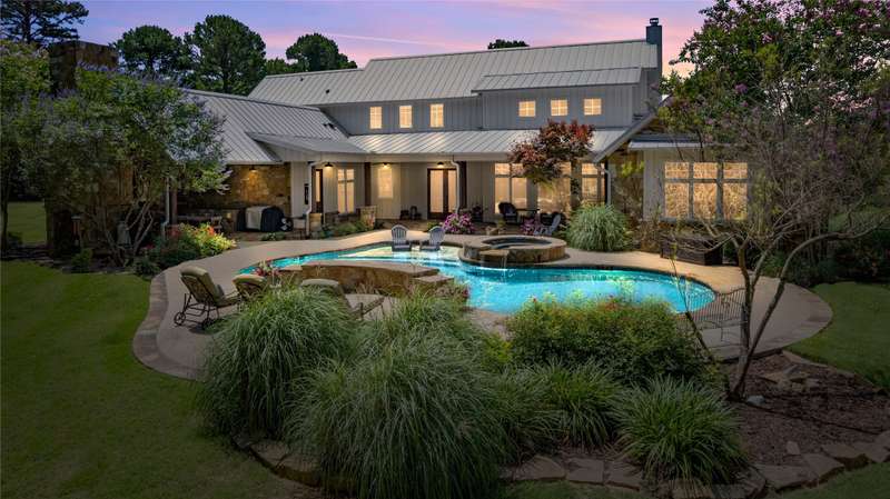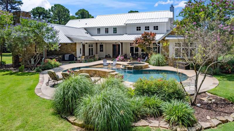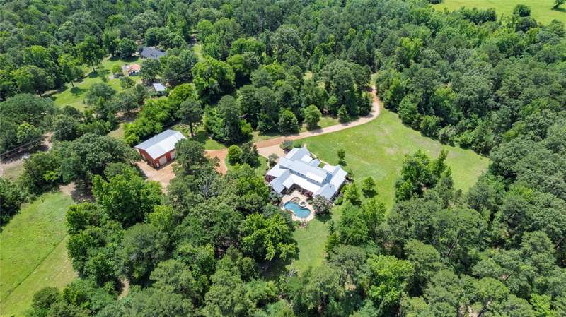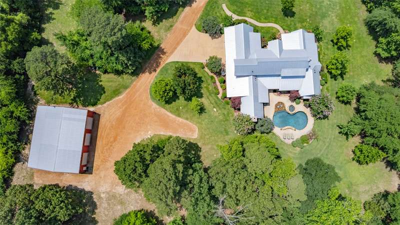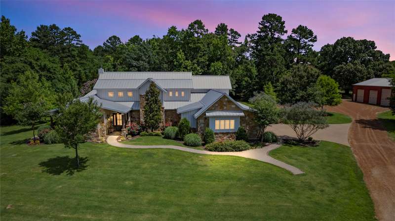Located less than 2 hours from the DFW area, this thoughtfully designed, custom home is set on 41, mostly wooded, acres--tailor made for recreation, hunting or grazing a small herd. A winding drive brings you to the charming facade of this ultimate modern farmhouse. Step inside to a soaring great room crowned by a a vaulted ceiling and anchored by a floor-ceiling stone fireplace. A wall of windows overlooks the stunning resort style pool. The heart of the home is a chef's kitchen stocked with high end appliances and a large walk-in pantry that keeps everything organized for large-scale entertaining. Step outside, just beyond the main living area, to an expansive covered patio and outdoor kitchen that extends your entertaining and living space. Inside, the game room, complete with kitchenette and half bath makes movie night or game day effortless and provides easy access to the pool. The amazing primary suite features a sitting area with stone fireplace and vaulted ceiling. The ensuite bath boasts separate vanities, walk-in shower, jetted tub, water closet an extra large walk-in closet with built-in dressers. 2 additional guest bedrooms and full bathrooms, along with an office, a mudroom and utility room complete the lower level of the home. A second primary suite located on the upper level could easily be converted to a bunk room perfect for weekend guests or mutligenerational living. The 3 car garage includes extra storage space and a built-in safe room. The property also features a 40 x 60 metal building with 4 overhead doors, a full bath and RV electrical and direct septic hookups. This property truly has something for everyone!! Call today to schedule your private showing of this amazing home!