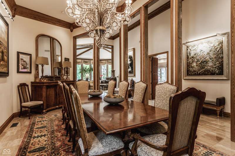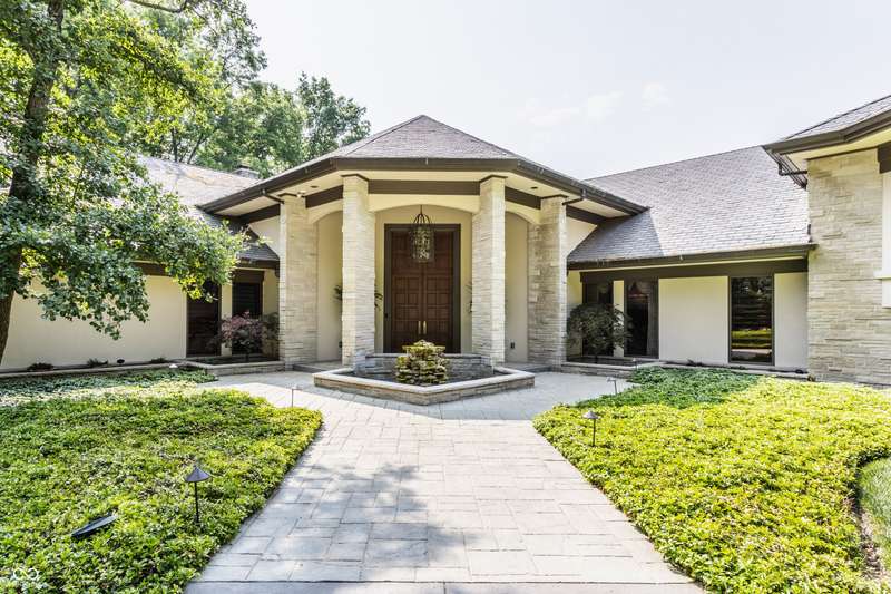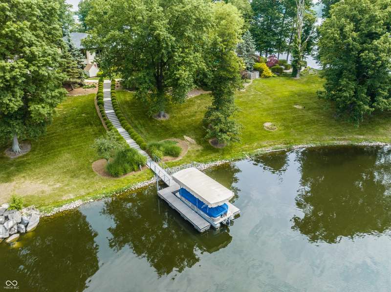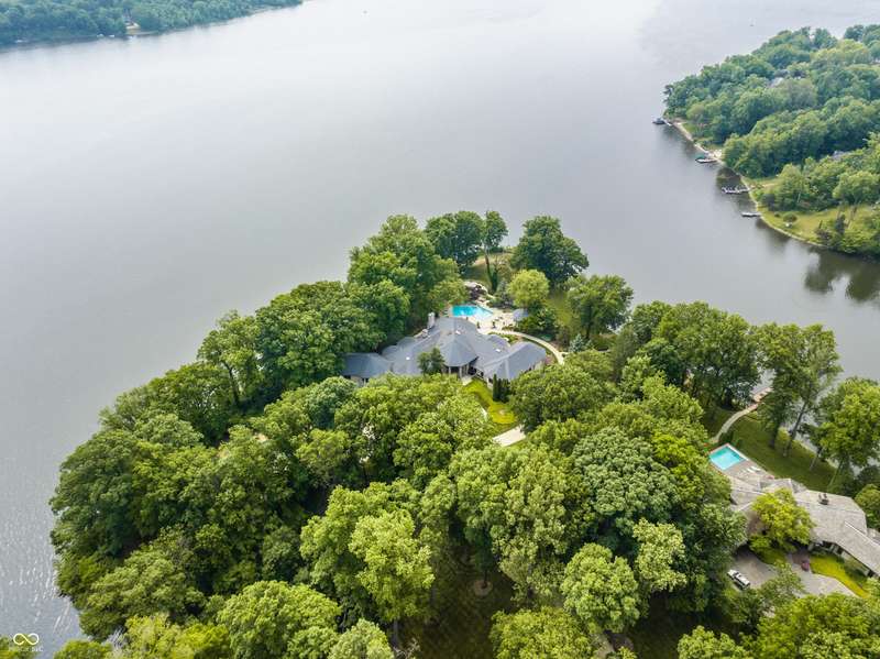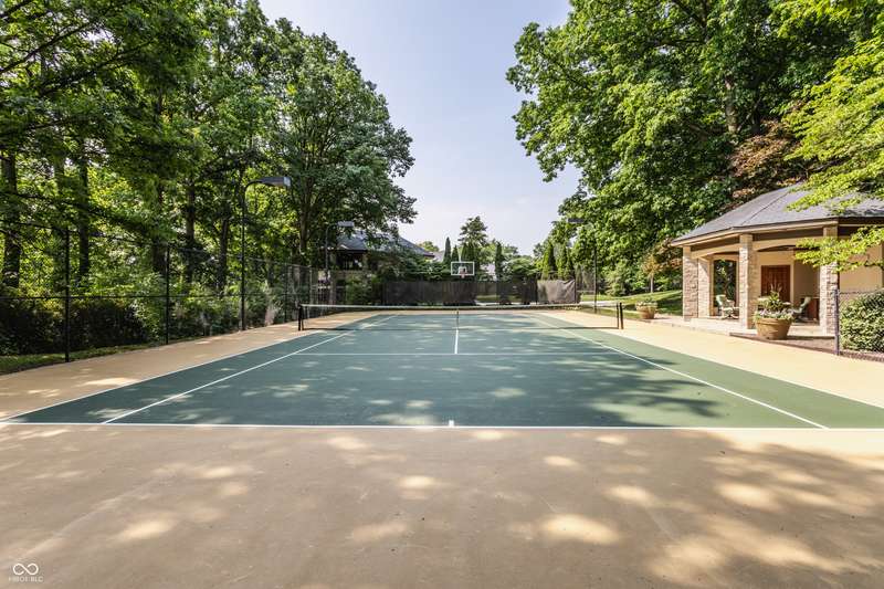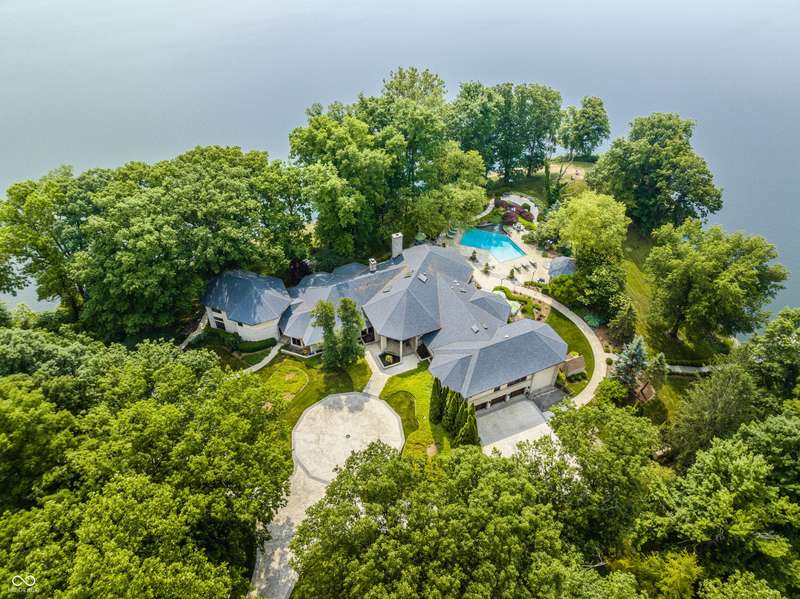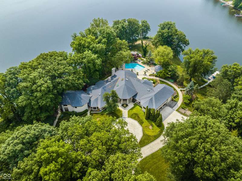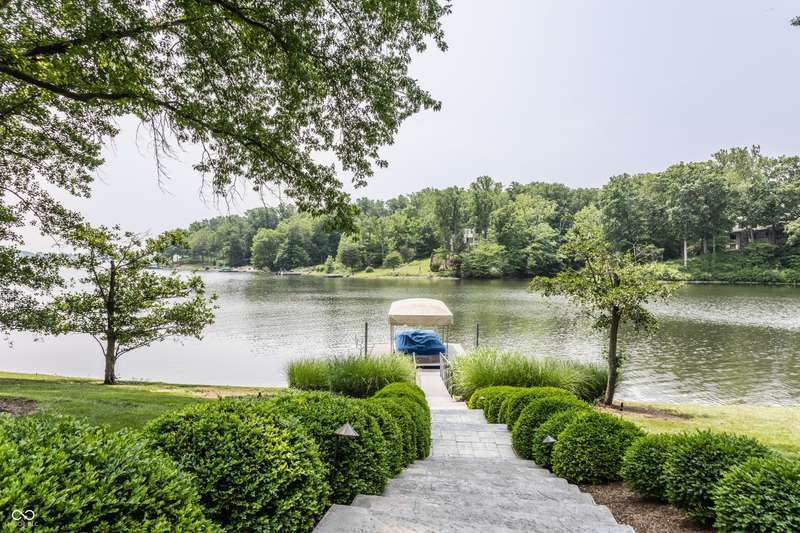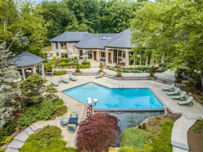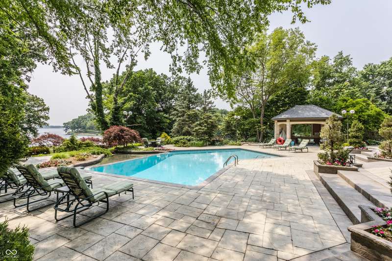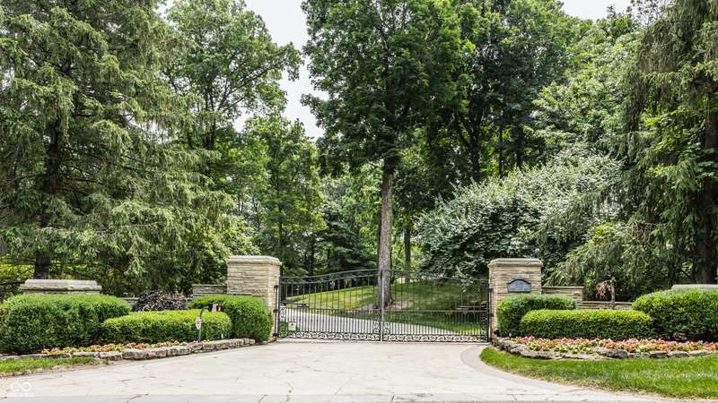 Exclusivity at its finest, this gated estate expands over 5.5 acres & is perfectly situated to capture breathtaking, panoramic views w/1250 ft of water frontage on Eagle Creek Reservoir. The lush oasis creates the feeling of a serene, private sanctuary featuring a koi pond that spans the back of the home, Gunite swimming pool & spa w/cabana & tennis court w/cabana. A spacious great room welcomes guests w/expansive bay windows that brighten the room, which also features a vaulted ceiling w/exposed wooden beams, built-in aquarium, fireplace & adjoining bar area with access to the backyard retreat. Cozy den embellished with wood-paneled walls, built-ins & marble fireplace. Gourmet kitchen boats upscale appliances and sunwashed breakfast area.
