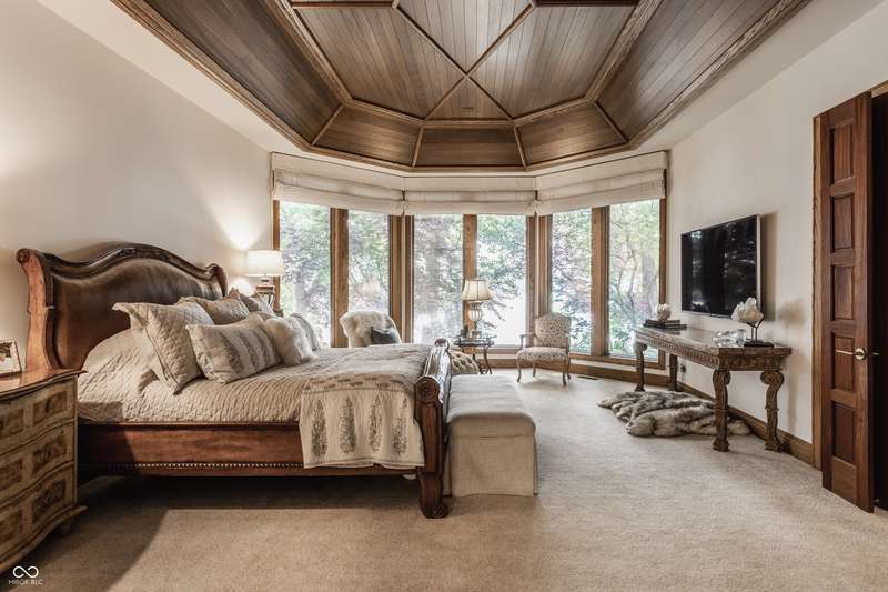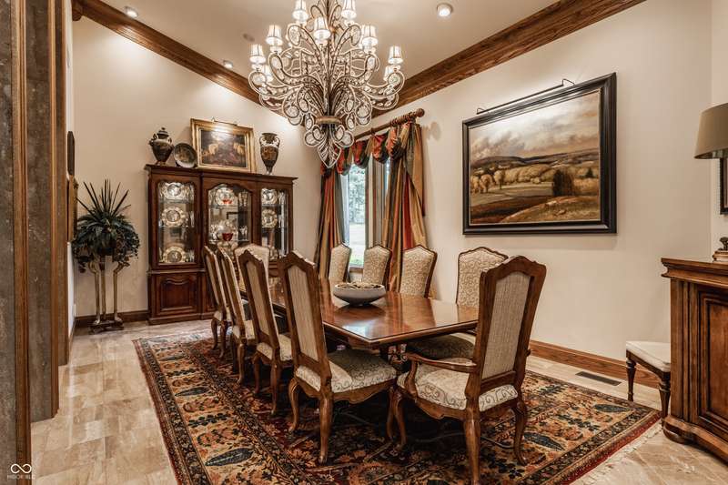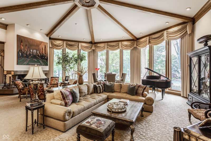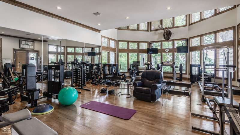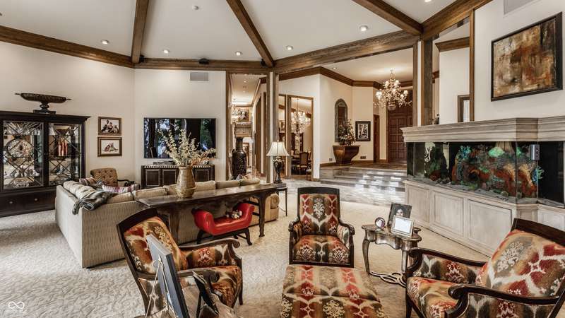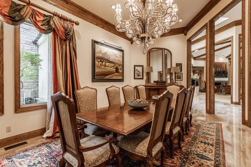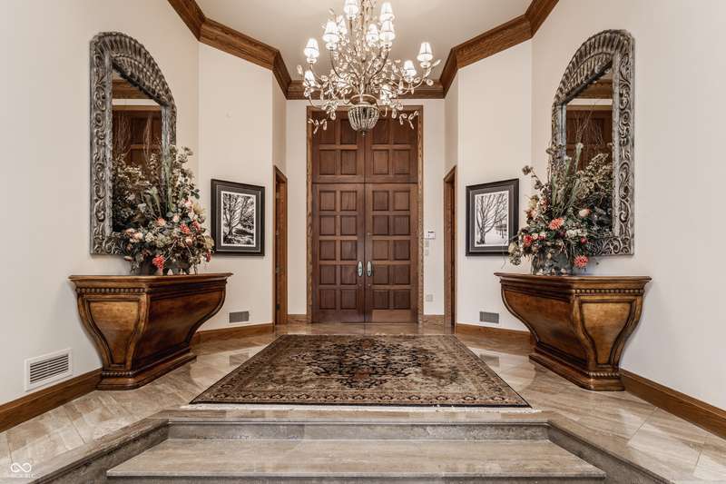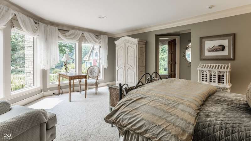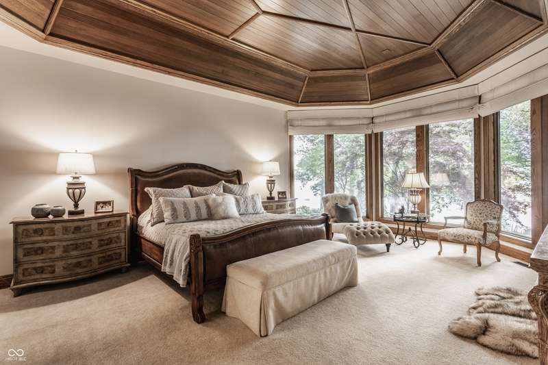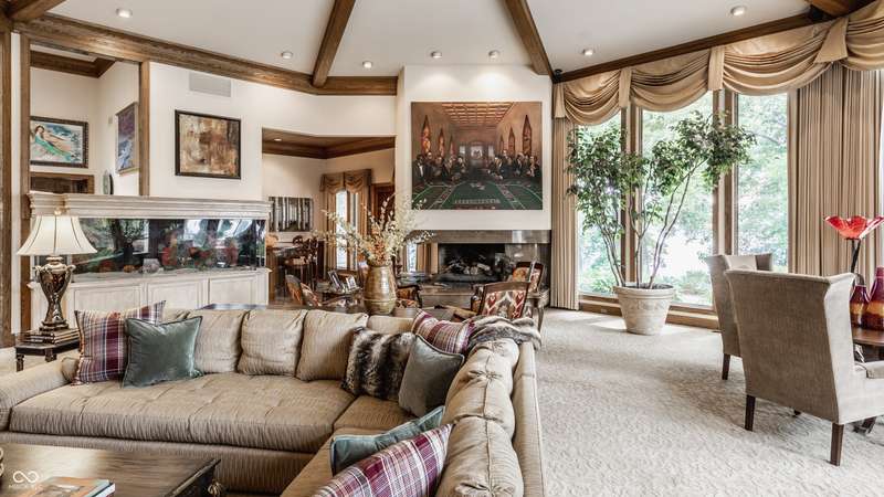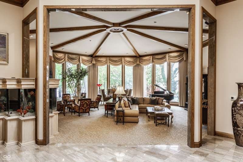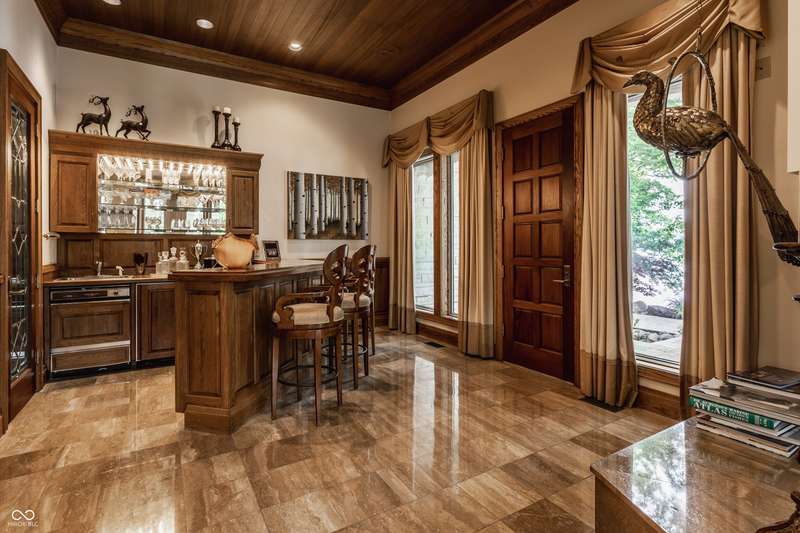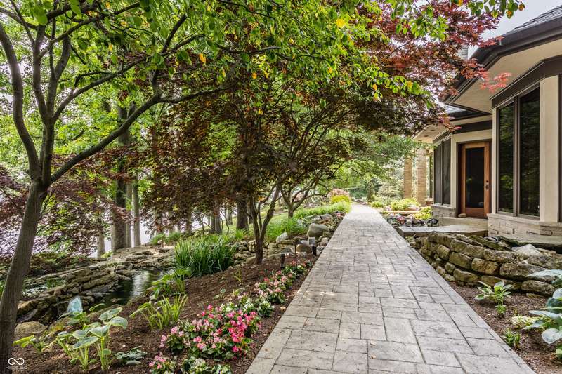 Exclusivity at its finest, this gated estate expands over 5.5 acres & is perfectly situated to capture breathtaking, panoramic views w/1250 ft of water frontage on Eagle Creek Reservoir. The lush oasis creates the feeling of a serene, private sanctuary featuring a koi pond that spans the back of the home, Gunite swimming pool & spa w/cabana & tennis court w/cabana. A spacious great room welcomes guests w/expansive bay windows that brighten the room, which also features a vaulted ceiling w/exposed wooden beams, built-in aquarium, fireplace & adjoining bar area with access to the backyard retreat. Cozy den embellished with wood-paneled walls, built-ins & marble fireplace. Gourmet kitchen boats upscale appliances and sunwashed breakfast area.
