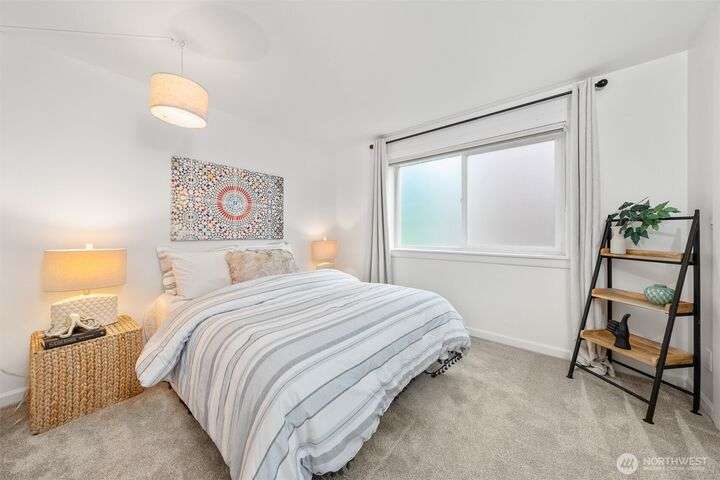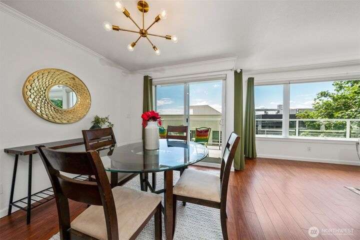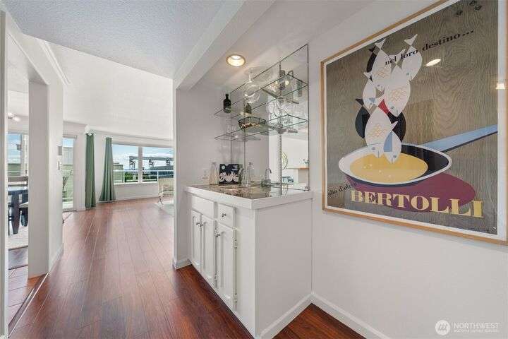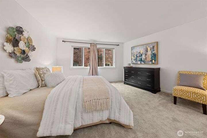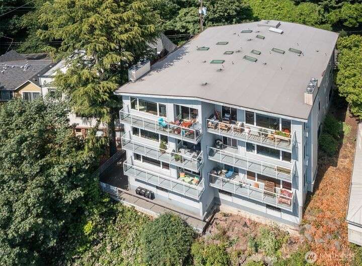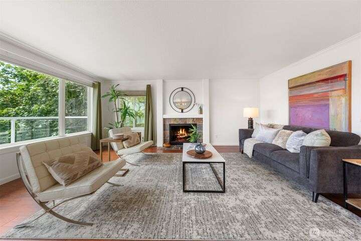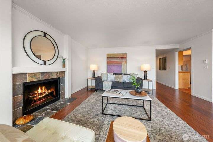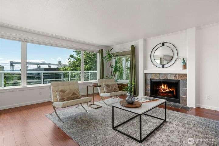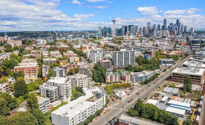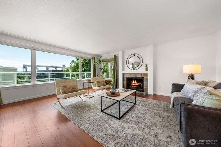 This utterly charming 6 unit, boutique building on Lower Queen Anne will check all your boxes for a new condo to call home. Over 1300 square feet w/big West facing views from Mount Rainier to Magnolia & beyond. Shiny & nearly new laminate hardwood floors flow through the main living spaces w/a true wood burning fireplace & wet bar. Well appointed kitchen has ample cabinets, granite counter tops, eating bar & stainless appls. Freshly painted primary bedroom, large enough for a California King bed w/walk-in closet & 3/4 bath. 2nd bedroom is also decent sized. Utility room is large enough to full sized W/D. 1 car secured covered parking & 2 storage units. Low HOA dues & self-managed building. Super close location to the top of QA & Ballard