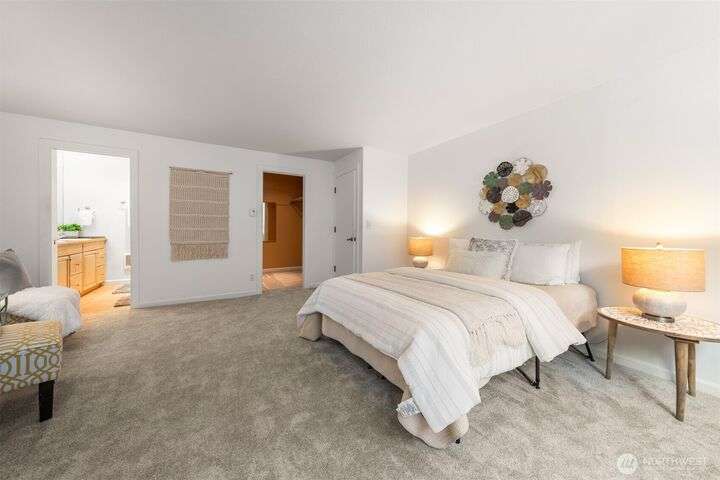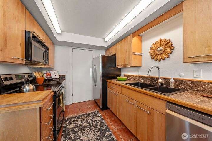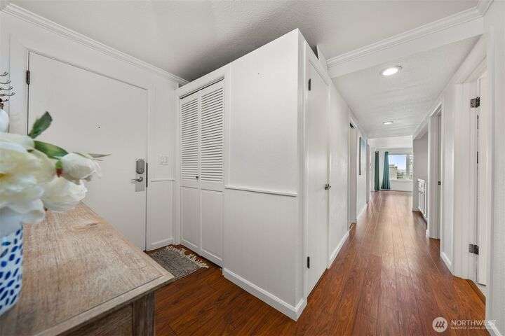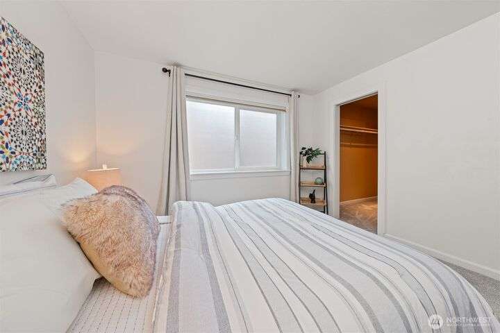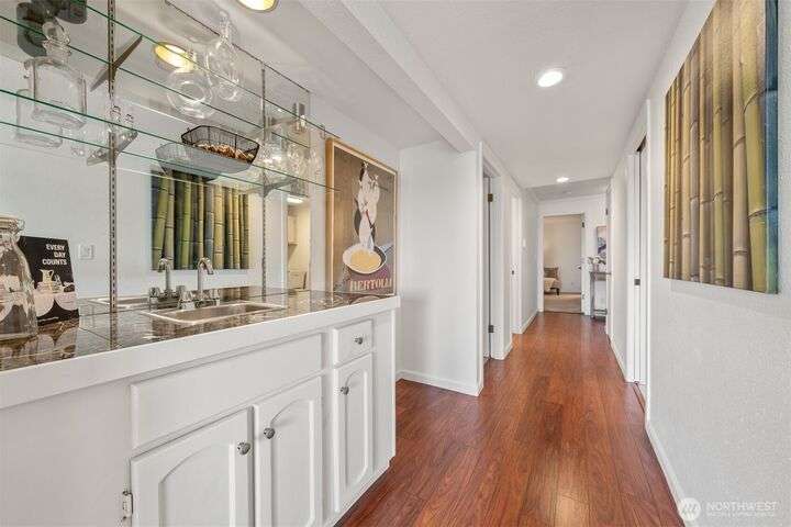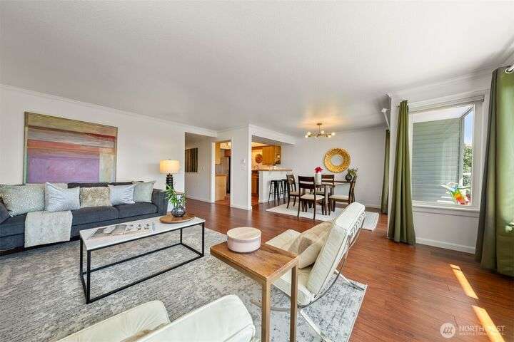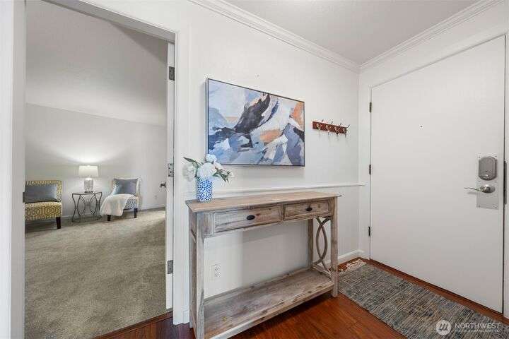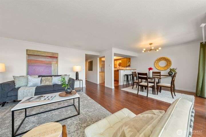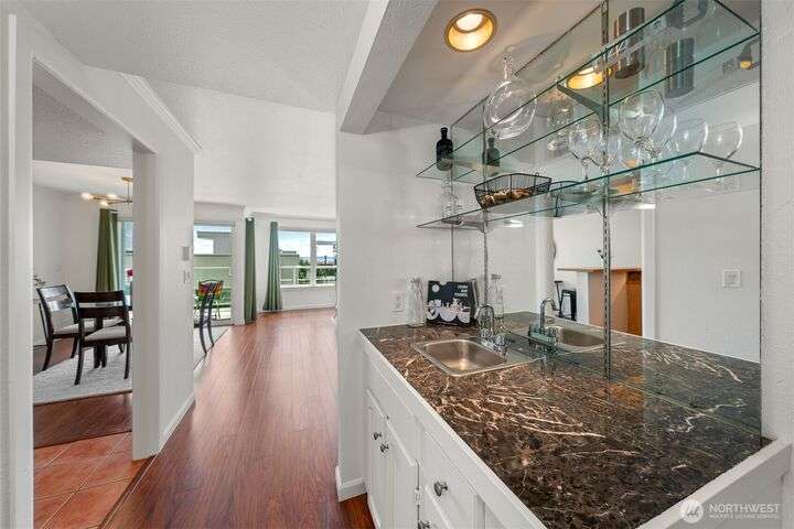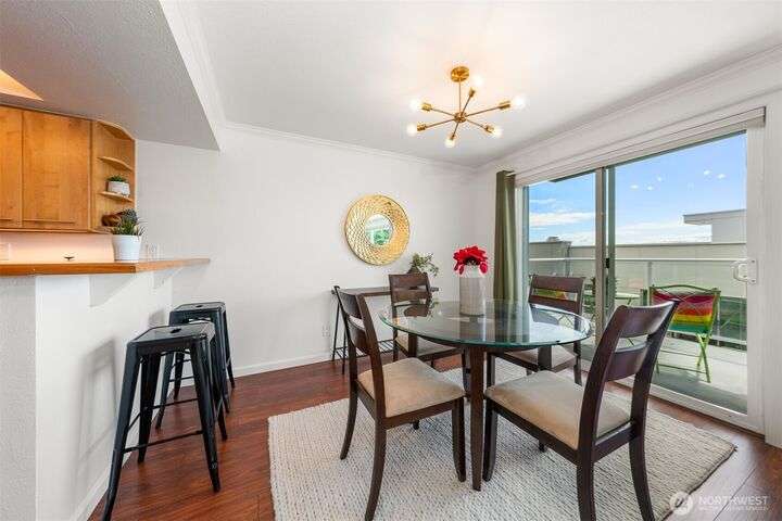 This utterly charming 6 unit, boutique building on Lower Queen Anne will check all your boxes for a new condo to call home. Over 1300 square feet w/big West facing views from Mount Rainier to Magnolia & beyond. Shiny & nearly new laminate hardwood floors flow through the main living spaces w/a true wood burning fireplace & wet bar. Well appointed kitchen has ample cabinets, granite counter tops, eating bar & stainless appls. Freshly painted primary bedroom, large enough for a California King bed w/walk-in closet & 3/4 bath. 2nd bedroom is also decent sized. Utility room is large enough to full sized W/D. 1 car secured covered parking & 2 storage units. Low HOA dues & self-managed building. Super close location to the top of QA & Ballard