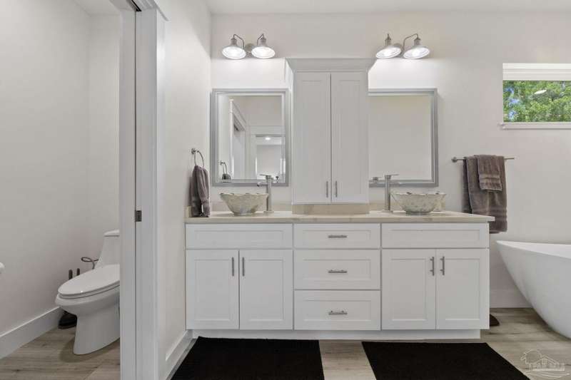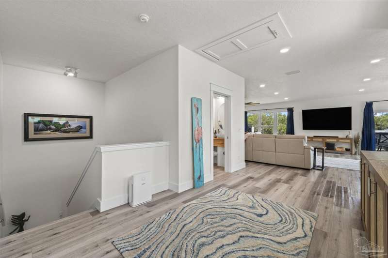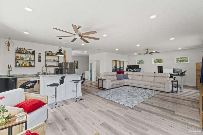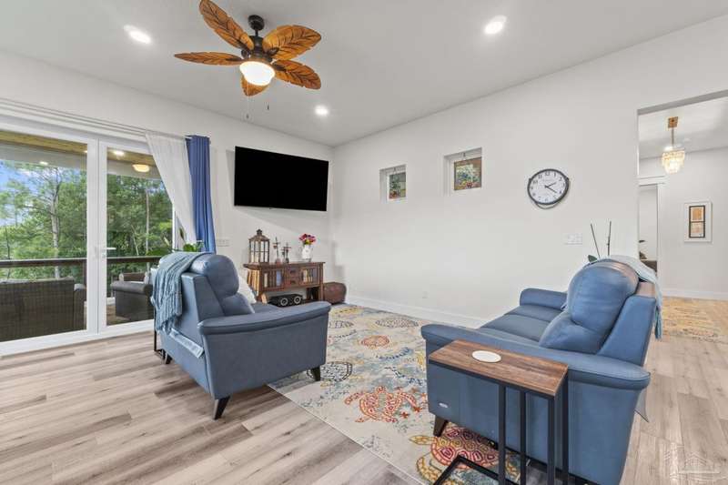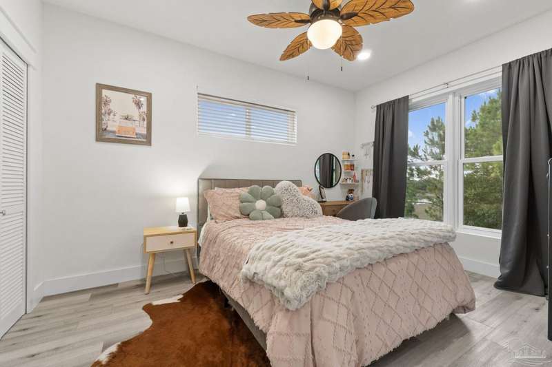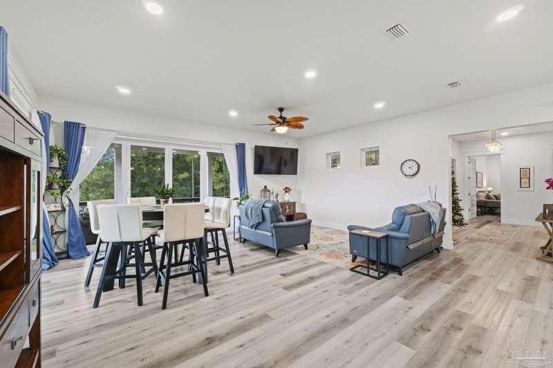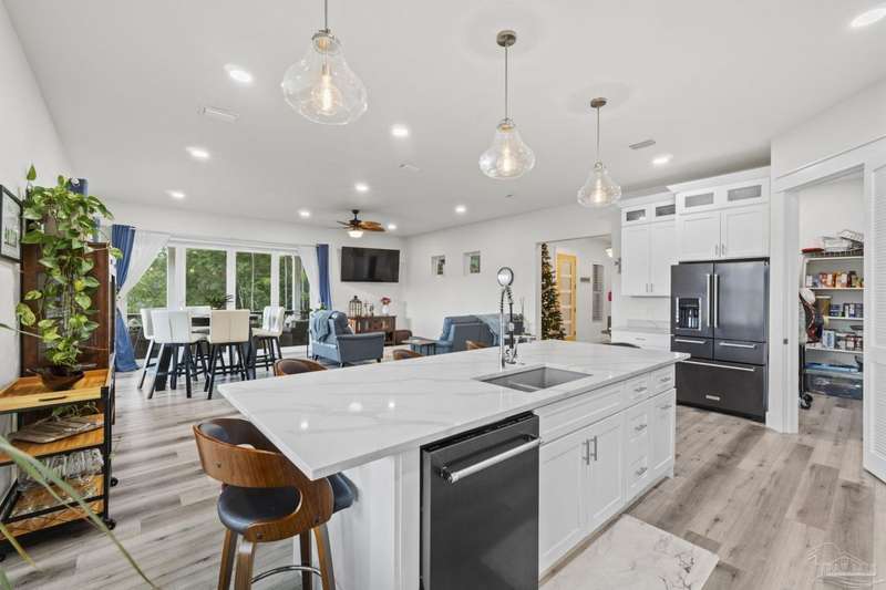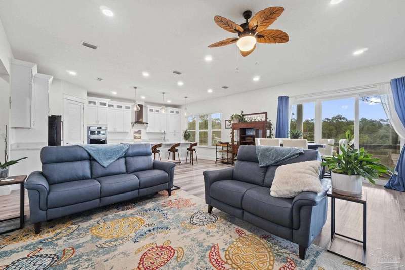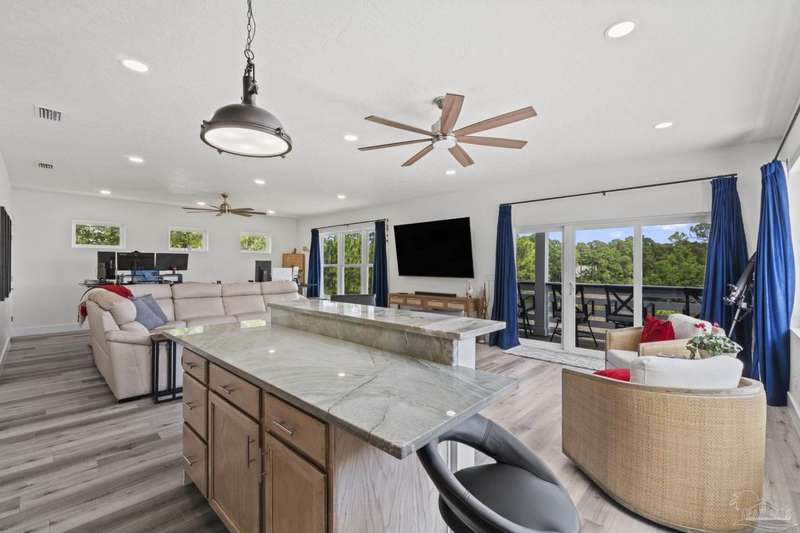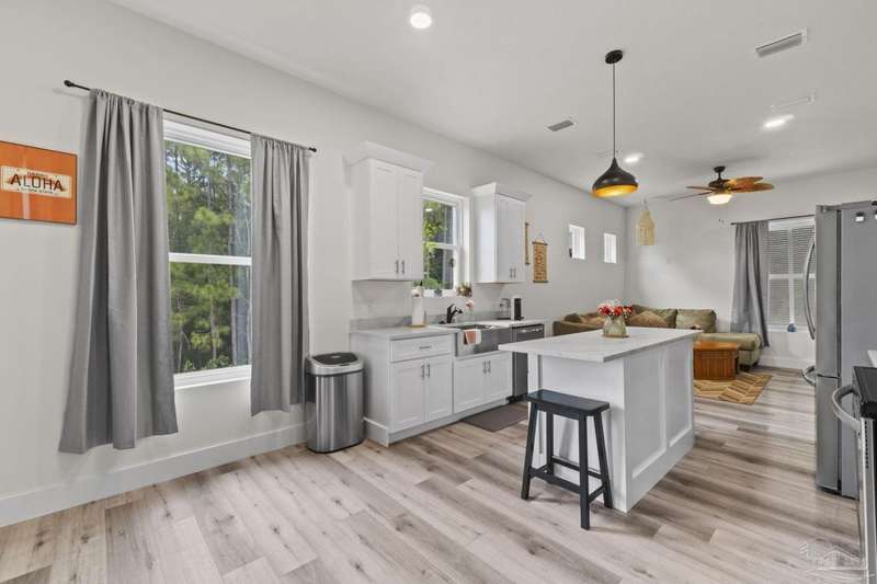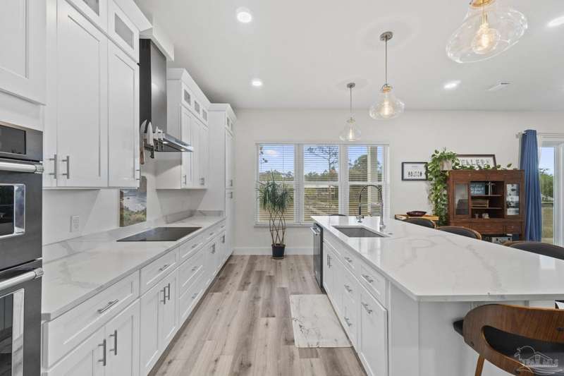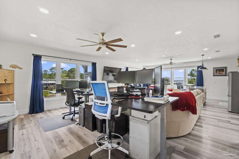 Experience effortless waterfront living in this custom, 2023-built residence set on nearly an acre along tranquil Trout Bayou, with protected boat access to Escambia Bay and a community launch just steps away. The main home offers 2 bedrooms, 2.5 baths, and airy, view-focused living spaces: a chef's kitchen with an oversized island opens to the second-floor living area and a full-width covered porch, while the third-floor entertaining level-framed by sweeping bayou vistas-features a wet bar and a dedicated office that can easily be converted to a third bedroom with the simple addition of sheetrock (wiring and lighting already in place). Below, you'll find a large garage plus covered storage for all your boating and outdoor gear. Built for efficiency and durability, the home includes spray-foam attic insulation with dehumidifiers, impact-rated windows and doors, steel-rod structural framing, and a metal roof; fresh sod blankets the expansive yard. A breezeway connects the guest cottage, which offers 2 additional bedrooms, 1.5 baths, and a private washer/dryer-ideal for extended family or visitors. Enjoy your own dock on protected water, plus the convenience of being just 20 minutes to Downtown Pensacola and 25 minutes to Gulf-front beaches. This is a rare, turnkey opportunity for peaceful Gulf Coast living with every modern comfort. Buyer to verify all measurements and information.