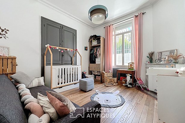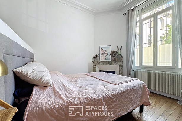 Bright and airy, it offers a beautiful 50 sqm south-facing living room, where an open kitchen, high ceilings, and antique details harmoniously complement a contemporary renovation. The garden, bathed in light, lends itself to summer meals as well as relaxing moments by the pool. On the night side, two large bedrooms overlooking the street retain their old-world charm with original parquet floors, moldings, and fireplaces. A third bedroom on the second floor completes the ensemble, as well as a bathroom with a bathtub and shower, a separate toilet, a laundry room, and well-designed storage. A 24 sqm cellar, directly accessible from the living room, completes this unique property, rare in the heart of the city.