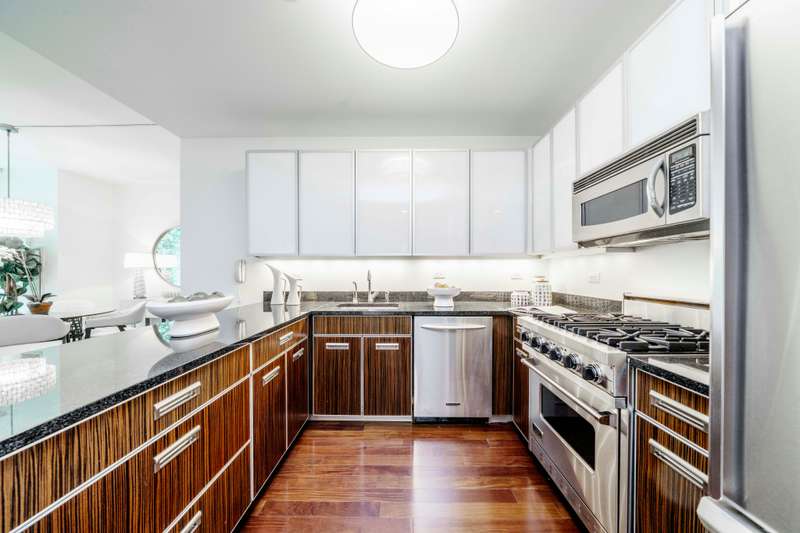 The first thing you'll notice is the dramatic, floor-to-ceiling, south-facing wall of windows, offering serene views of lush ivy just beyond the glass-visible from nearly everywhere in the apartment. Your entry foyer features a wall of coat and utility closets stretching over ten feet. The expansive living room and dining alcove benefit from the verdant views and tall ceilings. The open-concept kitchen has top-of-the-line stainless steel appliances, plenty of working granite counter space, and more than enough cabinets.