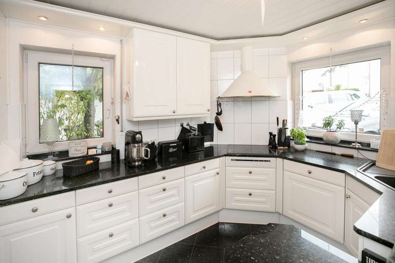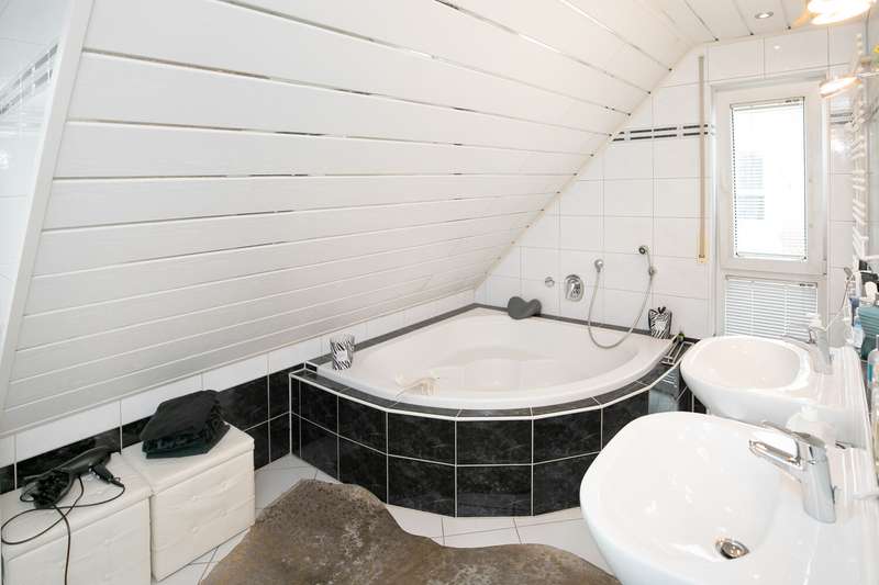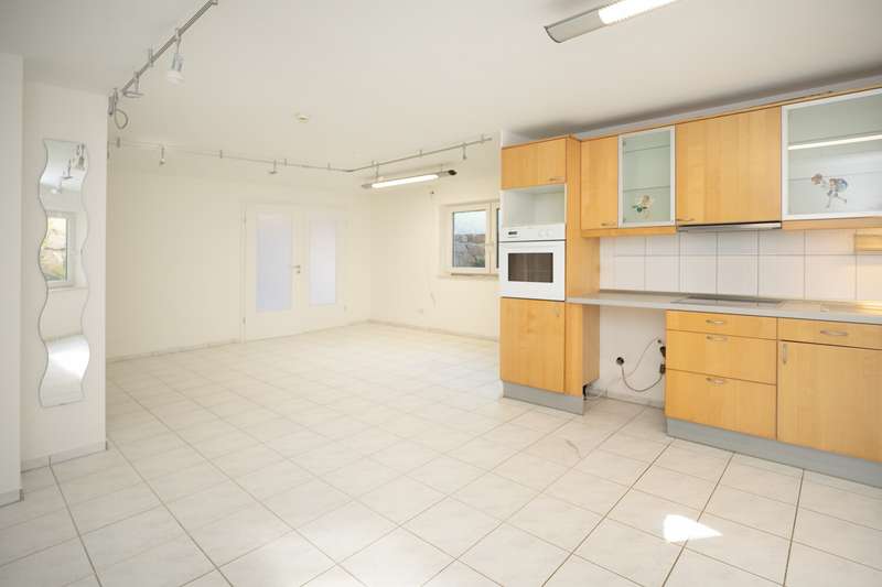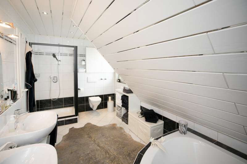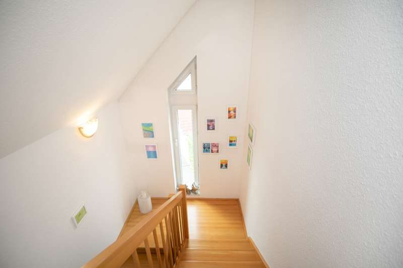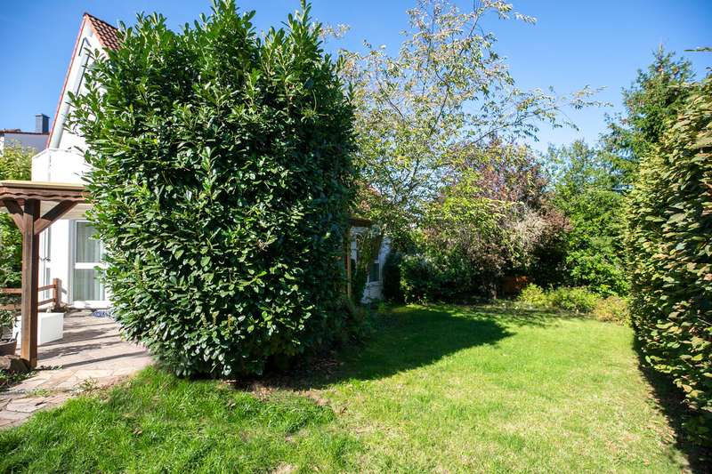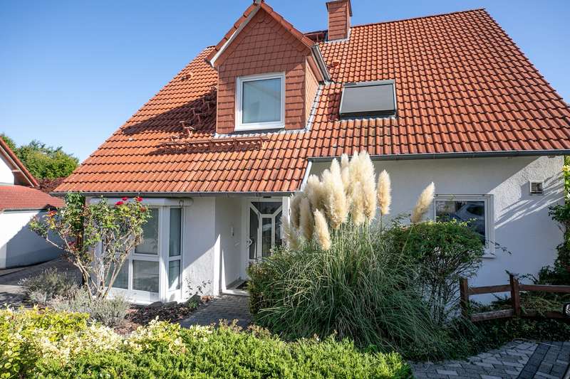 The spacious, detached family home is located in a quiet cul-de-sac and on the edge of a field. Nevertheless, a wide range of shopping facilities and the S-Bahn station are within walking distance. You enter the house through an entrance hall and from there into the large living room with dining area. Floor-to-ceiling windows provide plenty of light and a wood-burning stove provides pleasant warmth in the colder months. The living/dining area also provides access to the covered terrace and the beautifully landscaped garden. The highlight is the recently renovated outdoor pool. Another, smaller and level covered terrace by the garage can be used very well as a barbecue terrace. The hallway leads to the separate kitchen, which has further access to the dining area. A further room, which can be used as a study or guest room, and a guest bathroom with shower round off the space on the first floor. Upstairs there are three bedrooms and a large daylight bathroom with corner bath and shower. The largest of the three bedrooms has access to a balcony with a view of the garden. The top floor consists of a living studio and a daylight shower room. The basement has a cellar room, a heating and laundry cellar and the granny apartment. The approx. 58 sqm granny apartment can be reached via a separate entrance from the outside. If required, it can also be accessed from the house by simple means. It consists of an open-plan living/dining area with kitchenette, a shower room and a bedroom. The daylight windows open out onto the garden and provide pleasant daylight. There is a garage with a covered gable roof on the property, which has the advantage that you can not only park your car safely there, but also use the additional storage space in the garage attic. There are also two further parking spaces, one in front of the garage and a separate parking space in front of the entrance to the granny apartment.