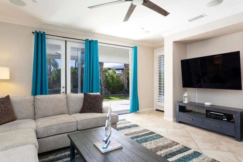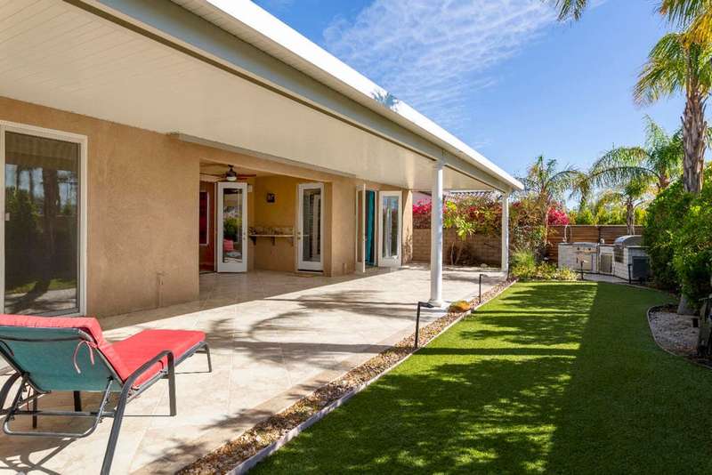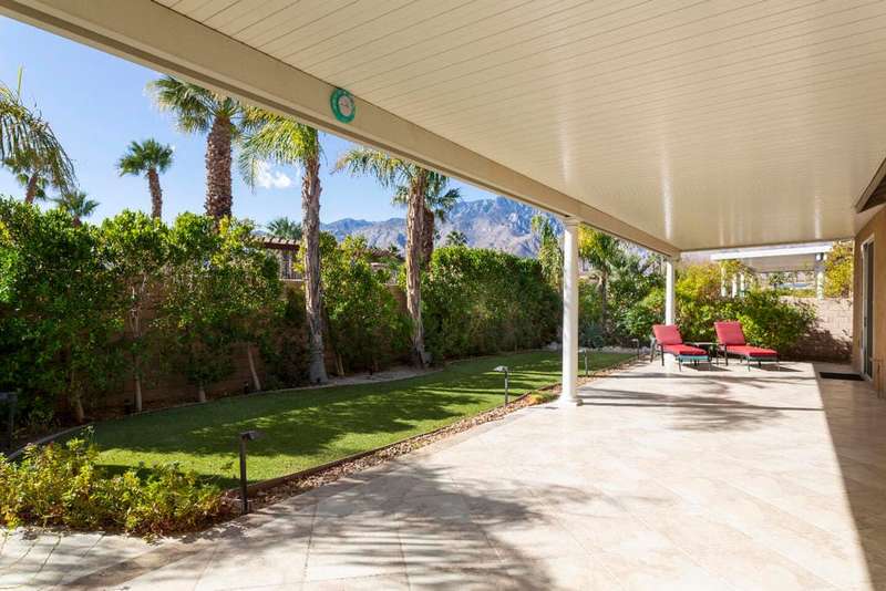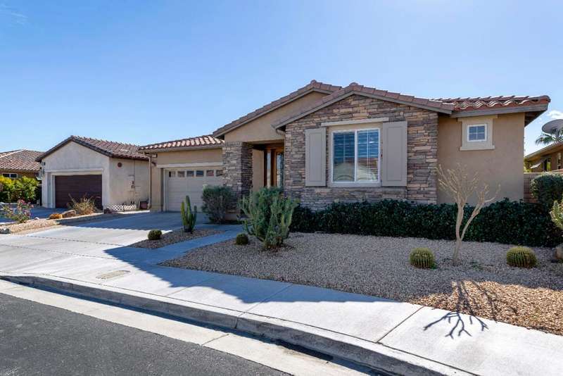 Discover this upgraded Mediterranean-style home in Four Seasons, Palm Springs' premier 55+ community, offering stunning mountain views, owned solar, and an ideal location near the clubhouse. This immaculate 2,825 sqft, 2 bedroom, 3 bath home is perfect for those seeking move-in ready luxury that is both comfortable and provides the benefits of living in an active adult lifestyle neighborhood.Designed for both formal and casual living, the open floor plan features a vaulted dining room and a spacious main living area. French doors open to the covered backyard patio, which boasts mountain views, an artificial lawn, and a BBQ station.The chef's kitchen includes a large prep island, bar area, pantry, and high-end finishes like slab granite counters, wood cabinetry, and a stainless steel appliance package. It is open to the family room, which features a stacked-stone gas fireplace and additional access to the backyard patio.There are two en-suite bedrooms. The rear, primary bedroom has backyard access, a gas fireplace, two walk-in closets, and a spa-style bath with a soaking tub. The front bedroom suite is adjacent to a den/media room, offering the flexibility to be used as a casita-style retreat. The den could potentially be converted into a third bedroom, with the en-suite bath becoming a Jack-and-Jill layout. The home also has built-in speakers, 2 newer HVAC systems that were installed in 2021, a hot water heater installed in 2020, and a water re-circulator.