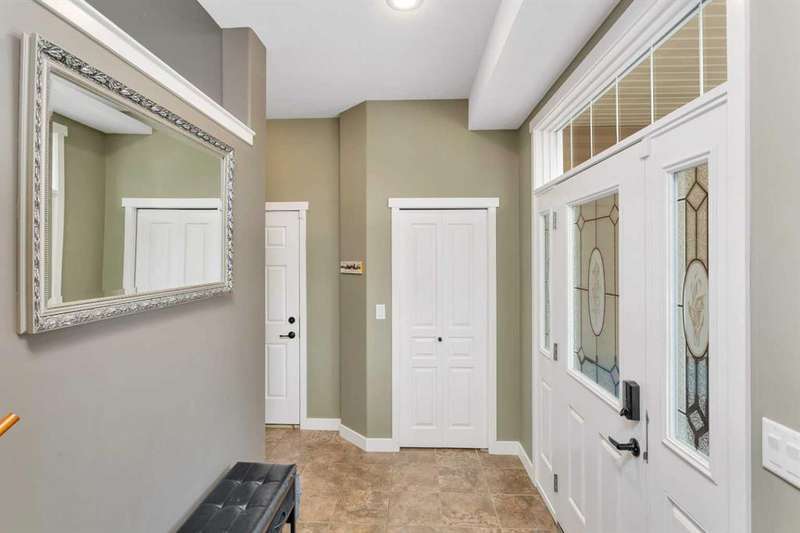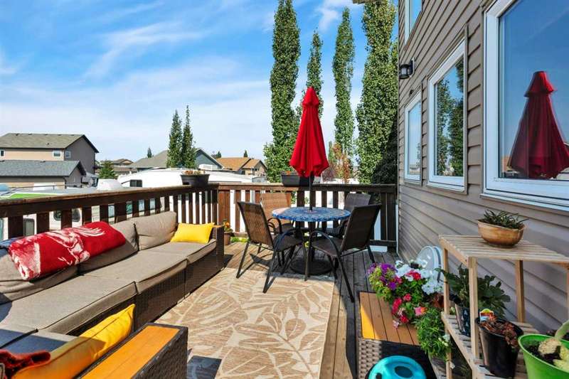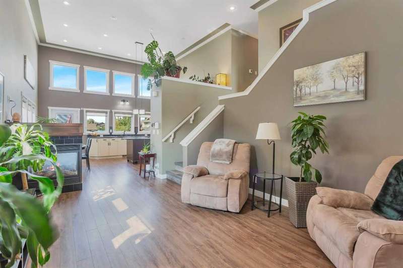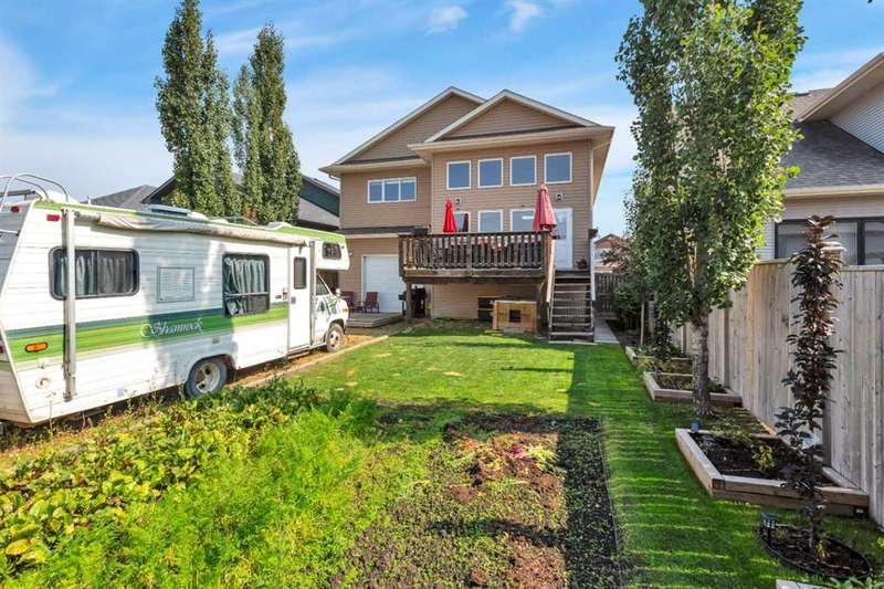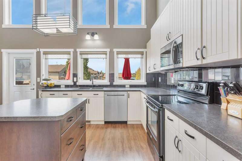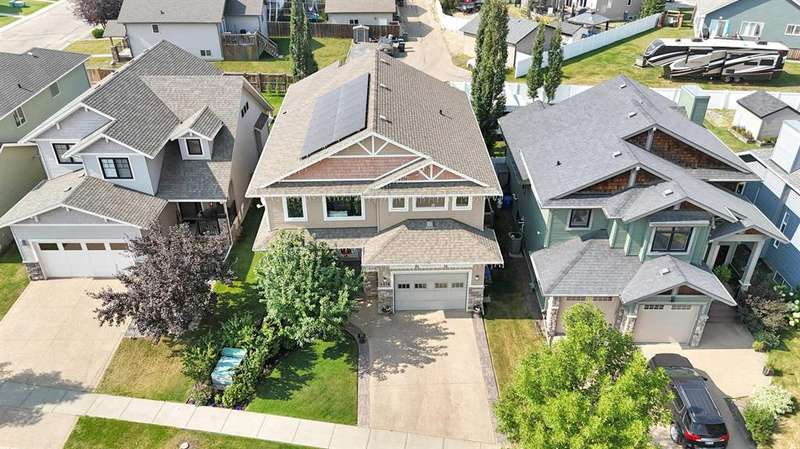 This a truly exceptional home that blends character, comfort, and smart living. Step onto the spacious front veranda, perfect for morning coffee or evening sunsets, and head inside to discover an open and airy layout with soaring 14 ft ceilings and stunning west-facing windows that bathe the home in natural light. The open-concept main floor offers seamless flow, and with no carpet anywhere, it's as functional as it is stylish. A mid-level bonus room offers the perfect flex space for working from home, relaxing, or creating a kids’ zone. One of the home's standout features is the fully installed solar panel system, providing exceptional energy efficiency and dramatically reduced electricity costs. Over the course of a year, seasonal usage and production balance out—making it practically net-zero when it comes to power bills. It's the kind of savings that make a lasting impact, especially as energy prices continue to rise. Other highlights include a spacious primary bedroom with a steam shower retreat, a versatile drive-through garage that serves as an extended living space, and a vibrant yet peaceful community. Located in the heart of Ryders Ridge, you're surrounded by walking trails, and within walking distance to groceries, shops, restaurants, and more. Plus, Sylvan Lake’s popular beach and activity zone is just a 20-minute walk or bike ride away—close enough to enjoy the fun, yet far enough for everyday tranquility.