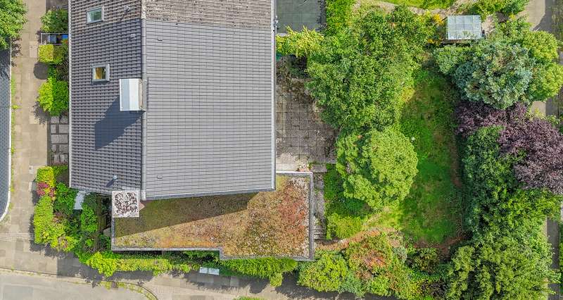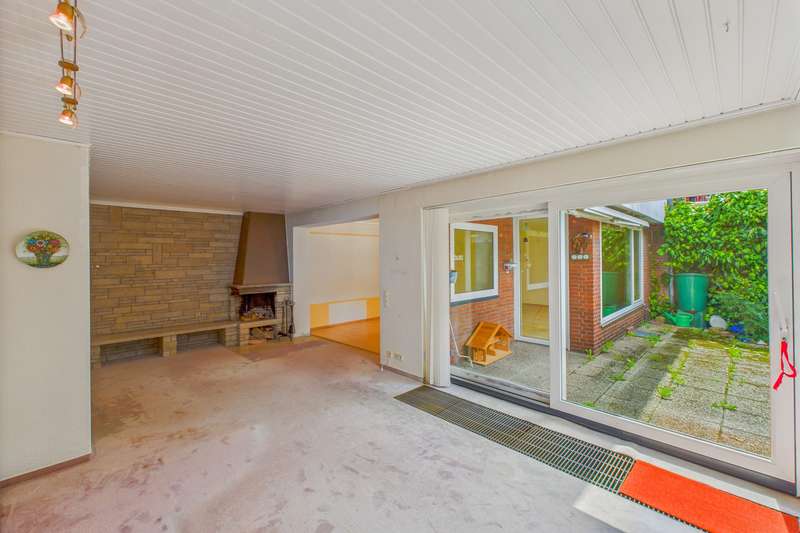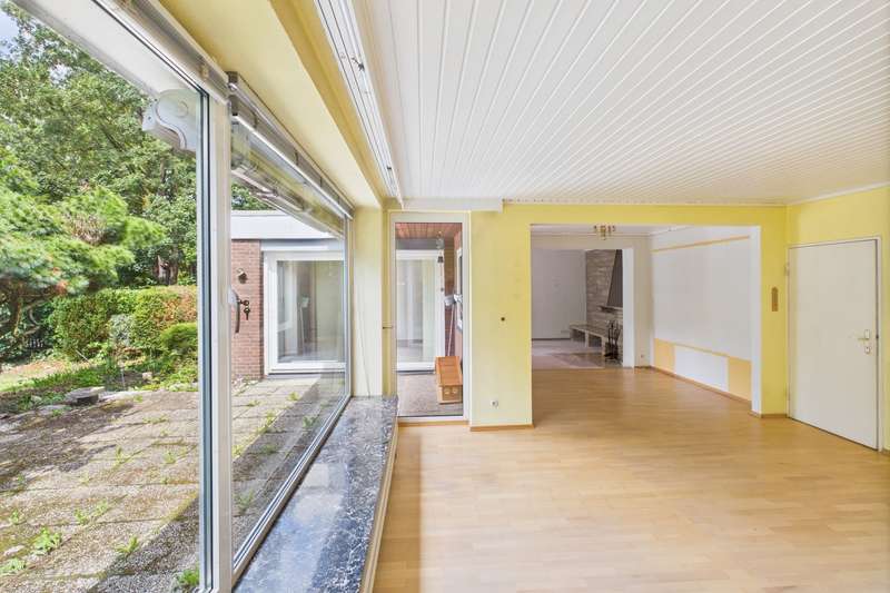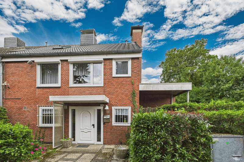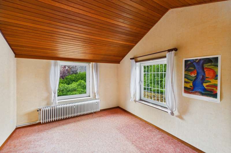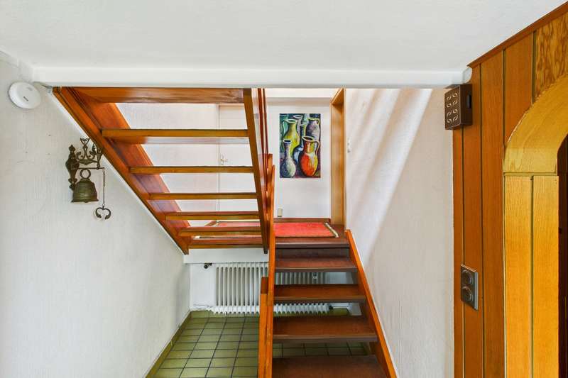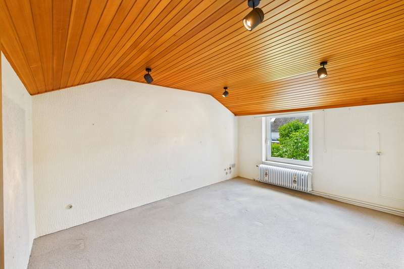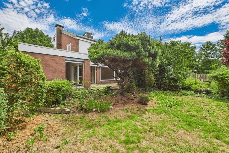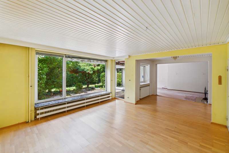 This well-kept end-terrace house combines generous space with well thought-out architecture and a sun-drenched garden, resulting in a very special feel-good ambience. The property was built around 1963 and extended around ten years later. The house has a total of six rooms, at least three of which can be used as bedrooms. A newly tiled roof on the main building (approx. four years old) and four large, modernized living room windows from approx. 1997 underline the solid structural condition. From the entrance area, you enter a room measuring approx. 14 m², which was originally used as a kitchen and is now ideal for a home office, hobbies or as a kitchen. A storage room opposite was last used as a checkroom. A half staircase leads to the spacious living/dining room measuring approx. 55 m². It boasts a bright design, an open fireplace and access to the approx. 30 m² terrace with awning and the garden facing south-west. Connections for a kitchen are already available in the living area, allowing for a new, modern and open kitchen solution. An interior guest WC, which is accessible from the staircase, completes this level. Tiles, carpet and parquet flooring are the main floor coverings. On the floors above there are three bedrooms measuring between approx. 14 and 19 m² as well as a further room that could be used as an office, for example. It has approx. 6 m² plus slope and additional usable space. There are two daylight bathrooms, one of which is equipped with a bathtub and the other with a shower. The living rooms are mainly carpeted. The sanitary rooms are tiled. The room layout follows the split-level principle, whereby each level is clearly structured yet harmoniously connected. A crawl space with a ceiling height of approx. 1.55 to 1.88 meters and a connection for the washing machine offers additional storage space. The offer also includes an open, covered storage area in front of the extension and a garage in a garage yard. The property is ideal for families or couples with space requirements who are looking for a solid house with potential in a quiet but well-connected location. It presents itself in a solid condition, but requires refurbishment on the inside. The bathrooms and parts of the building services in particular no longer meet today's standards and offer scope for individual modernization.