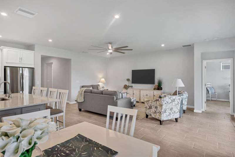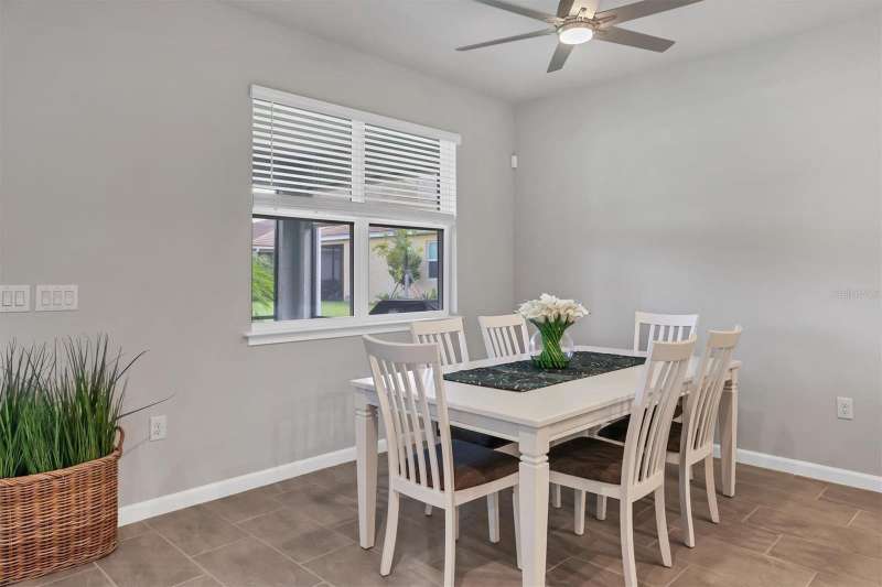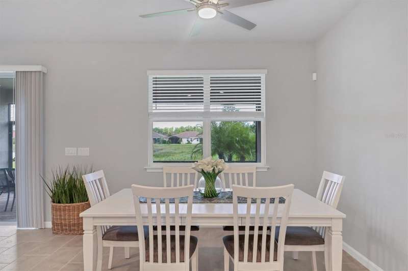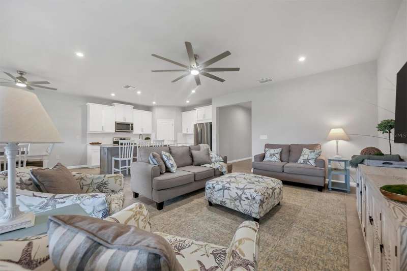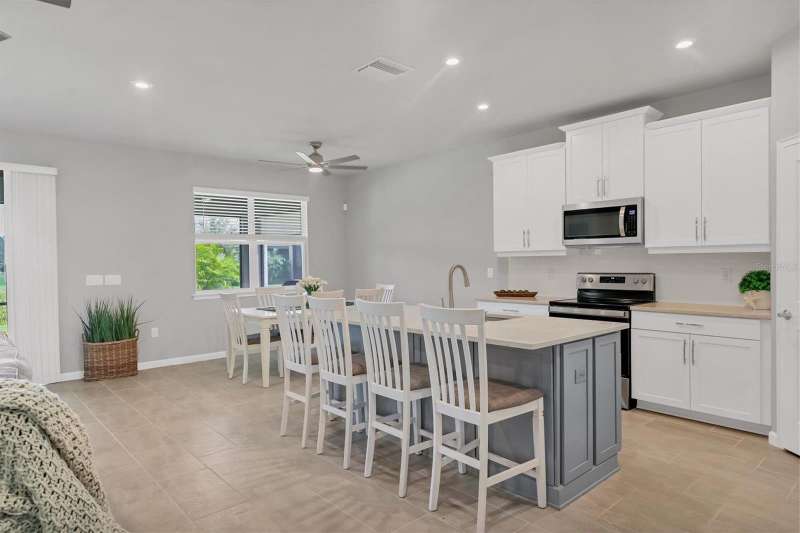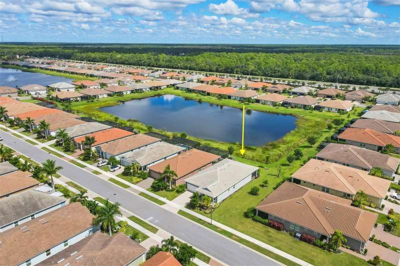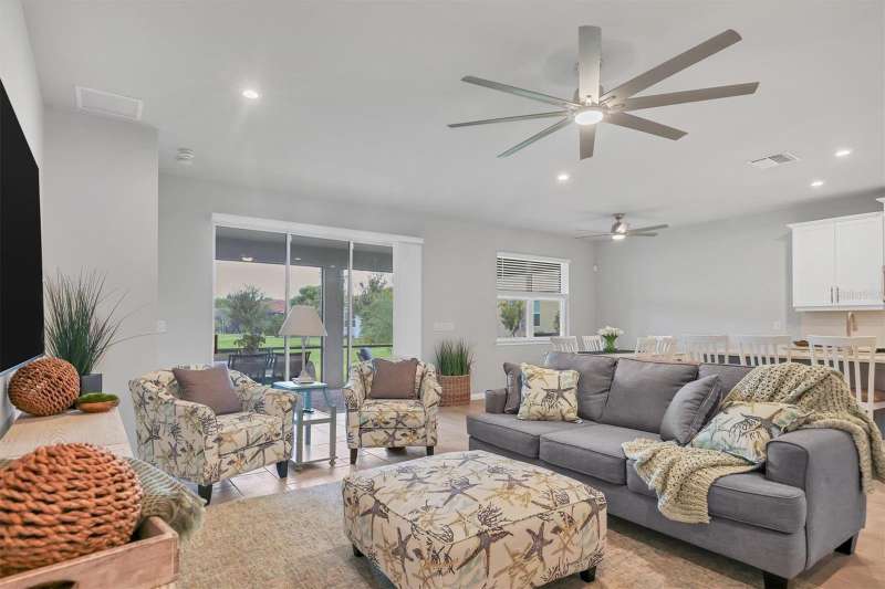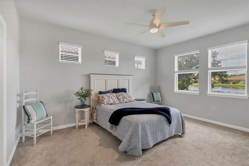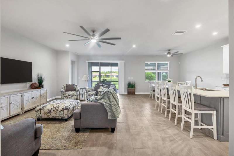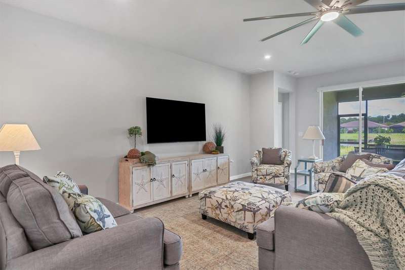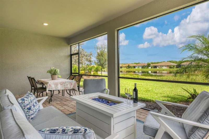 This stunning home offers modern living at its finest and feels like new, with a perfect blend of modern elegance and serene comfort. An appealing front porch welcomes you to the home and provides a great spot to relax. Step inside to discover elegant tile flooring throughout the foyer and the main areas, with carpet in the bedrooms, all presented in a soothing natural color palette. The kitchen is a chef’s delight, showcasing sleek white cabinets and a spacious island with gray cabinets. The beautiful quartz countertops, and convenient corner pantry provide ample space whether for yourself or while entertaining. This home has 3 spacious bedrooms, plus a versatile flex room, perfect for an office, workout space, or playroom. The primary ensuite bedroom and bathroom features a walk-in shower, double sink vanity, and a spacious walk-in closet. The sliders and windows in the living and dining room provide light to the great room and access to the screened lanai, which is the perfect place for coffee in the morning and cocktails in the afternoon while overlooking a lake. Plus, the backyard has room for a pool. Furniture is all available making your move easy, just bring your toothbrush! Located in the desirable Renaissance community, residents enjoy access to fantastic amenities, including a community pool, gym, and pickleball courts. Also, the HOA takes care of the lawn and landscape for you. Enjoy nearby Downtown Wellen Park with daily entertainment, shopping and restaurants, along with walking paths and bike trails. Enjoy relaxing beside the large lake or on it with a kayak or paddleboard. And fishing is allowed. The Cool Today Park is within two miles... this is the spring training stadium for the Atlanta Braves, plus has additional featured entertainment year long. No need to travel far for shopping, there’s a Publix Plaza, Costco Warehouse, and more in Wellen Park. Schools and future medical facilities are in construction now. Motivated seller, bring an offer.