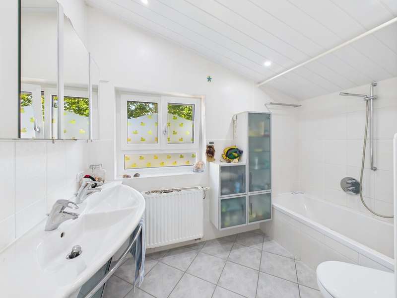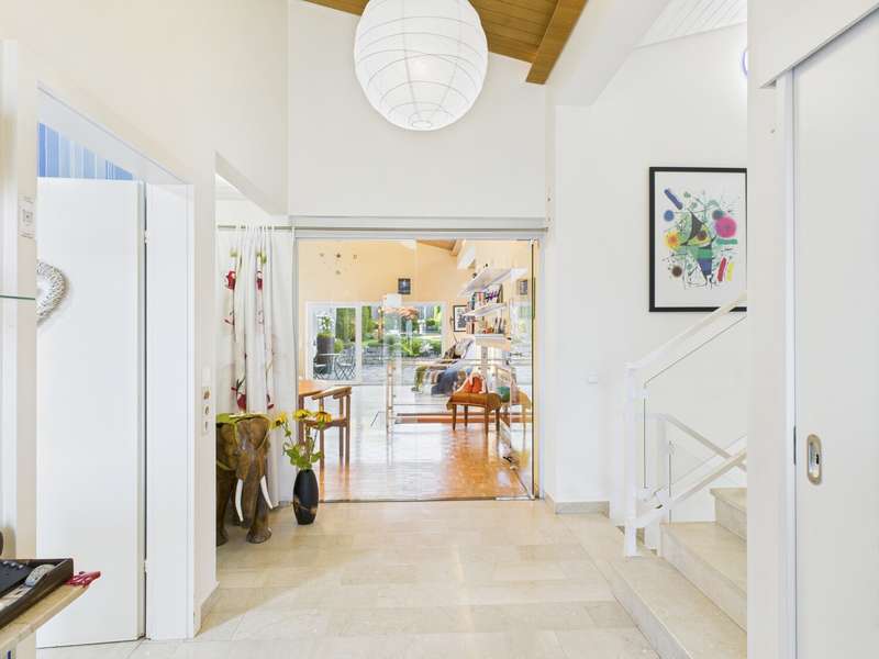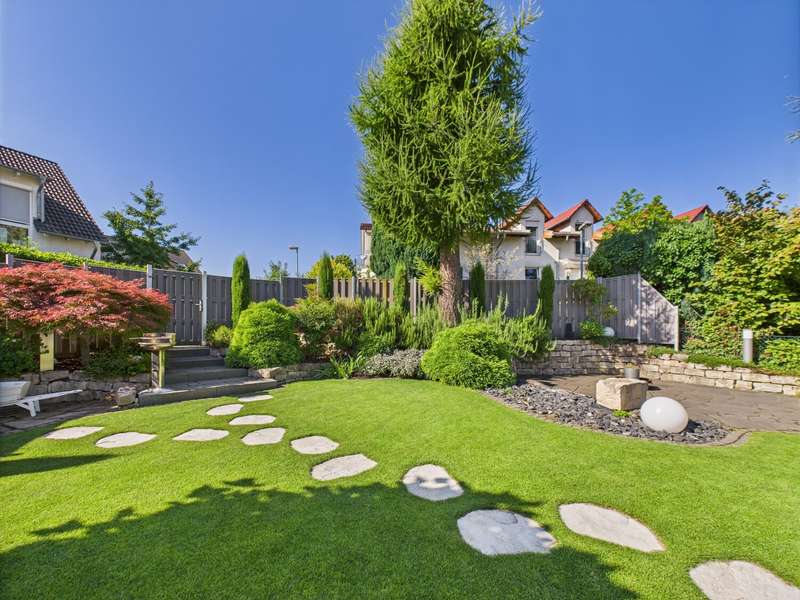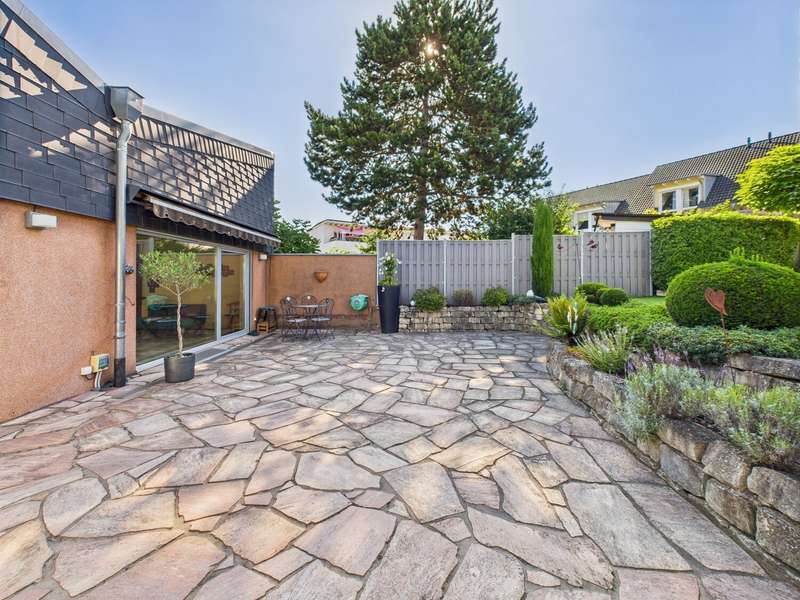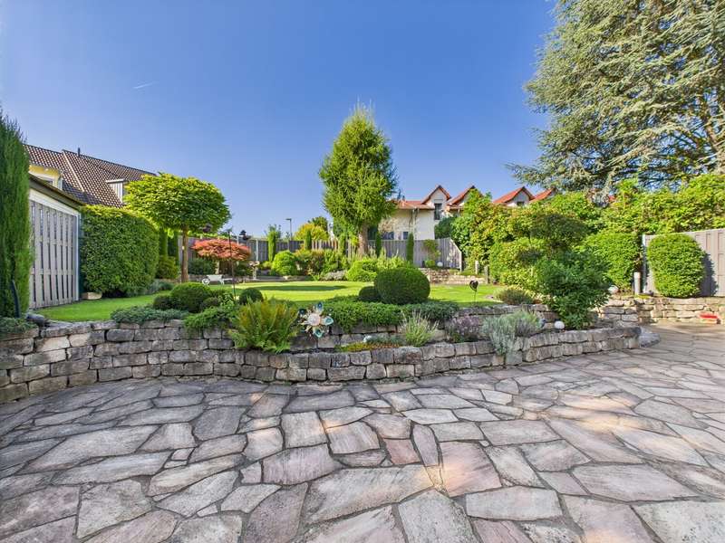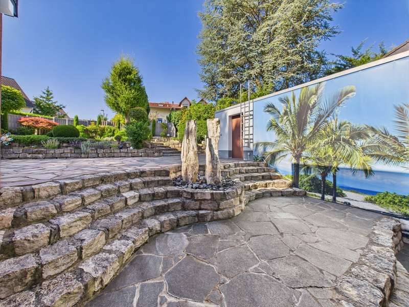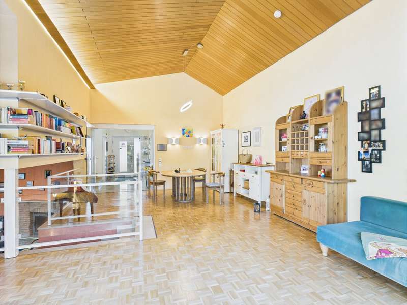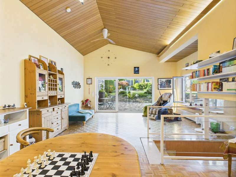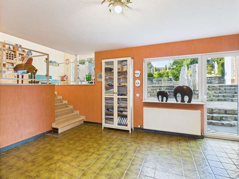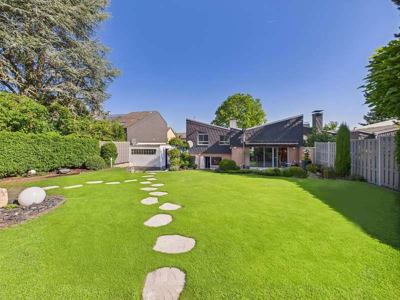 This exceptional detached house from 1977 is situated on a plot of approx. 581 m² and impresses with its timeless architecture and special living concept. The living space of around 146 m² creates a harmonious feeling of openness, light and security. From the entrance area, you are greeted by a friendly ambience that reflects the character of the house: spacious, bright and well thought-out. From here, the spacious living and dining area with approx. 38 m², high ceilings and floor-to-ceiling windows opens up. The view leads directly onto the terrace and the lovingly landscaped garden - ideal for sociable evenings or relaxing hours in the countryside. The bright kitchen with adjoining pantry is functionally designed and offers a beautiful view of the front garden. In the lower living area, reached via a staircase, the fireplace room with access to the second terrace invites you to spend cozy hours by the fire. The upper floor accommodates three well-designed rooms that can be used flexibly as bedrooms, children's rooms or studies. Two bathrooms - a bright daylight bathroom with bathtub and an interior shower room - guarantee comfort for the whole family. A guest WC in the entrance area completes the offer. There is a further room on the first basement floor, which is ideal as a guest room or study. Adjacent to this is a practical storage room with access to the terrace, which offers additional storage space and enhances the living comfort. A spacious laundry room with space for laundry and washing machines completes this level. The second basement level has a usable area of approx. 57 m². A large hobby room, a storage room and the boiler room are available here - plenty of space for organization, hobbies or individual design. The spacious outdoor area delights with two terraces and a stepped garden. Stylish planting, an impressive natural stone fountain, garden lighting and an irrigation system create a feel-good atmosphere and make the garden a real highlight. The offer is rounded off by two parking spaces and a double garage with direct access to the garden. This house is more than just a place to live - it is a home full of charm, spaciousness and a special atmosphere. Perfect for families who are looking for something out of the ordinary and want to enjoy both privacy and togetherness. Be inspired by this unique property and arrange a viewing.