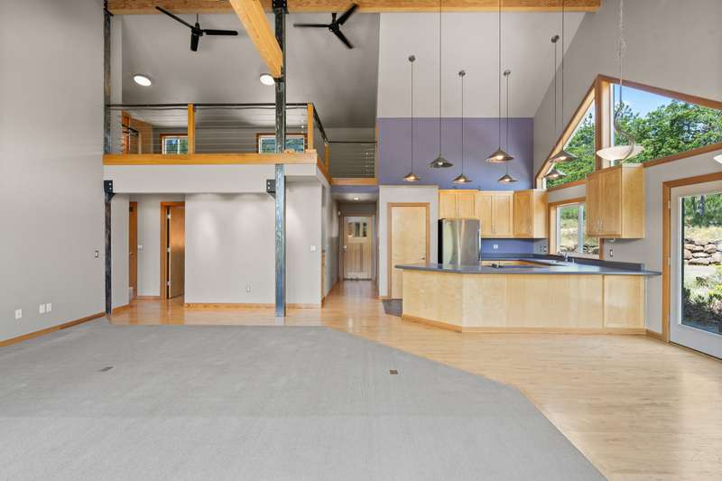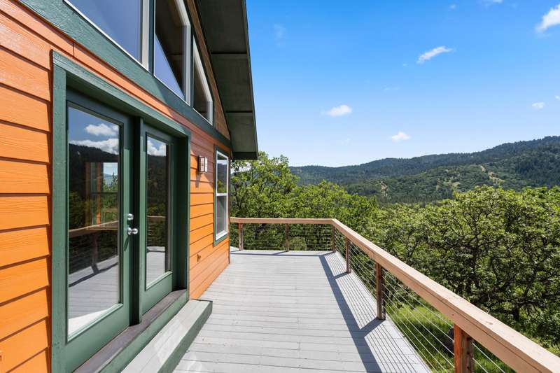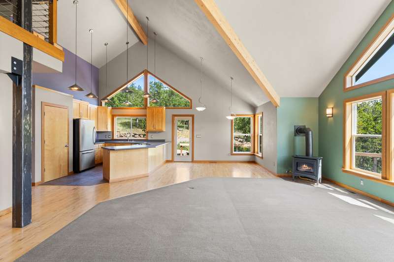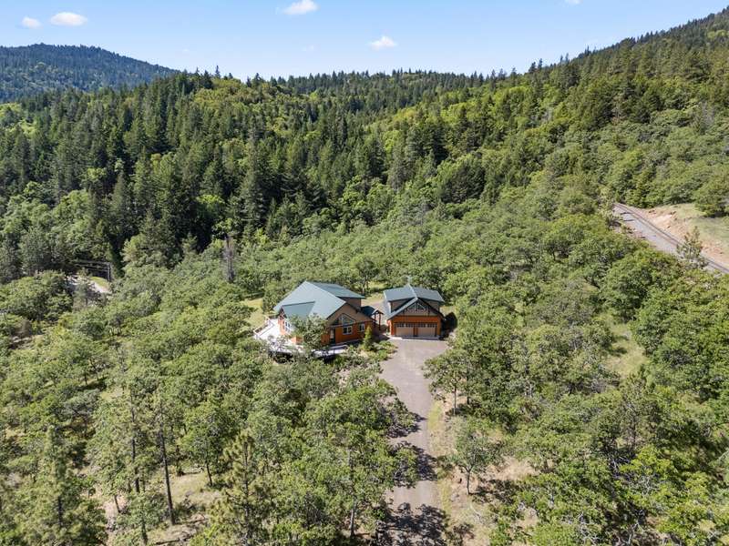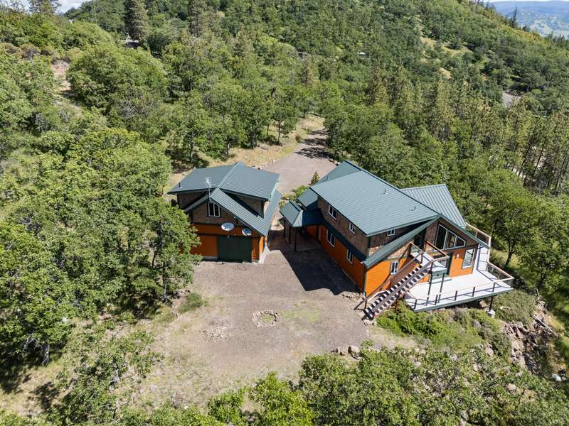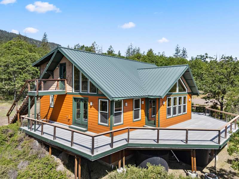 Serene mountain retreat with stunning views and natural light pouring in through huge picture windows. This light and bright home features an open-concept layout blending craftsman charm—wood trim and beams—with contemporary industrial touches like steel beams, metal corded railing and modern fixtures. Soaring vaulted ceilings enhance the airy feel. Main-level living includes the spacious primary suite with double vanity, walk-in closet, and access to the wrap-around deck. The open kitchen boasts built-in cooktop, stainless steel appliances, solid wood cabinets and pantry. Upstairs you'll find a versatile loft and full bath. 672 sqft of bonus living space above the 2-car garage includes its own full bathroom and laminate flooring—could be converted to legal ADU per Jackson County. 6.4 GPM well. Brand new exterior paint (2025), durable metal roof, and a rain catchment system complete this unique rural gem!