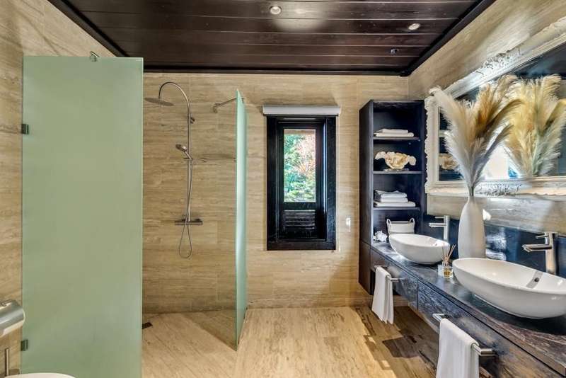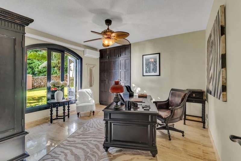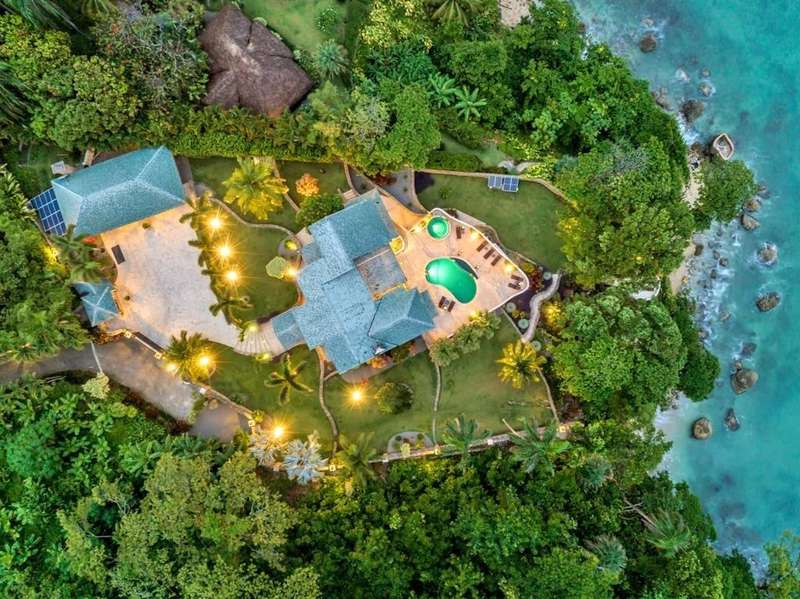 The property is fully surrounded by a 7-foot wall, a terraced tropical garden with local stone stairs, and plenty of exterior lighting. Fiber internet is in the villa and the garage. The property is a fully automated off-grid electrical system with solar panels, a battery bank, and a 17 kW generator. The pool and jacuzzi are solar-powered and the jacuzzi is heated.