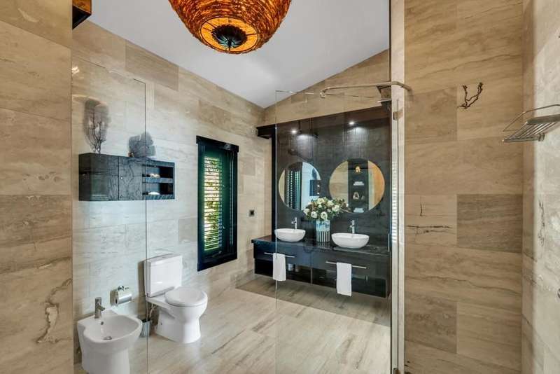 All woodwork such as windows, doors, interior wardrobes & cabinets, and kitchen, and bathroom cabinets are made of oak. Except the roof structures which are made of wood specific for roofs. The pool and jacuzzi are in high-quality Italian Bisazza mosaic and epoxy grout. Indoor and outdoor (under the roof) flouring in polished travertine.