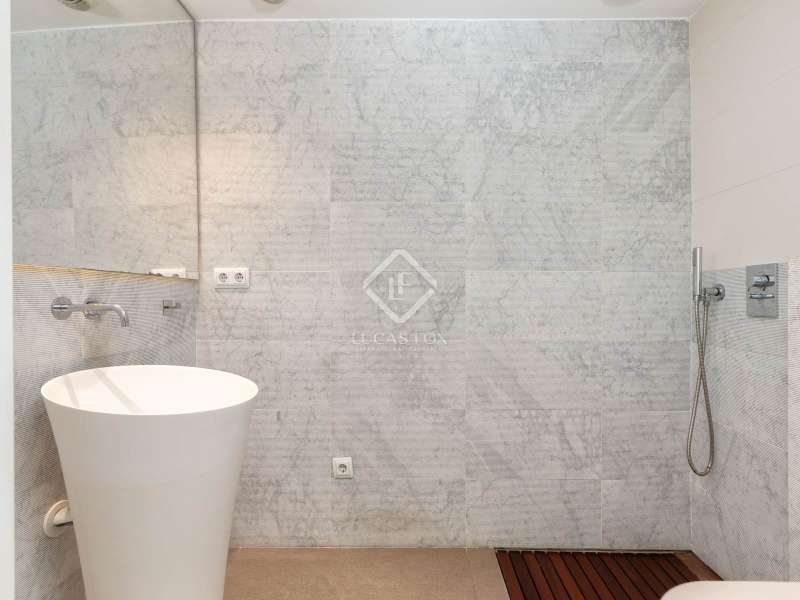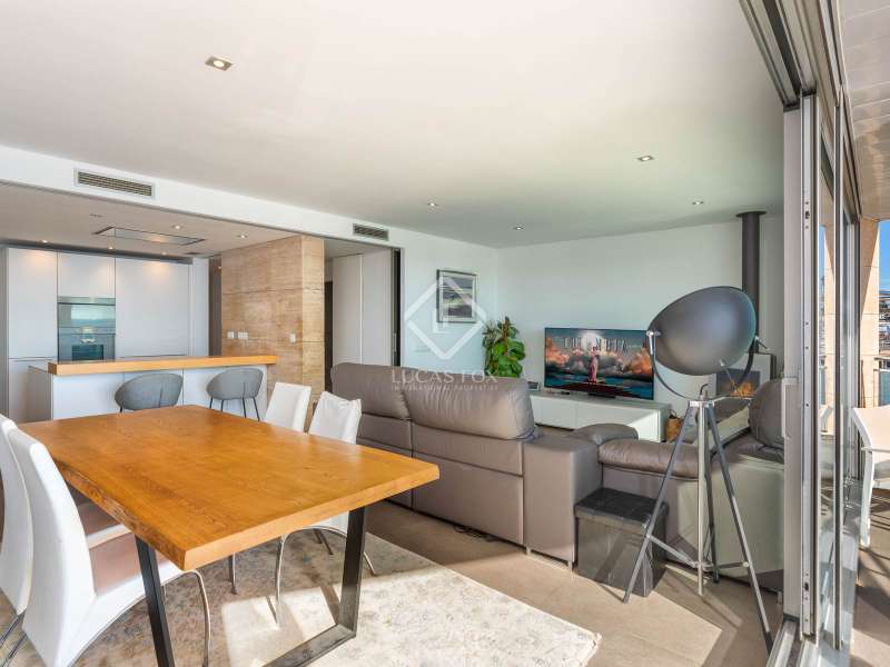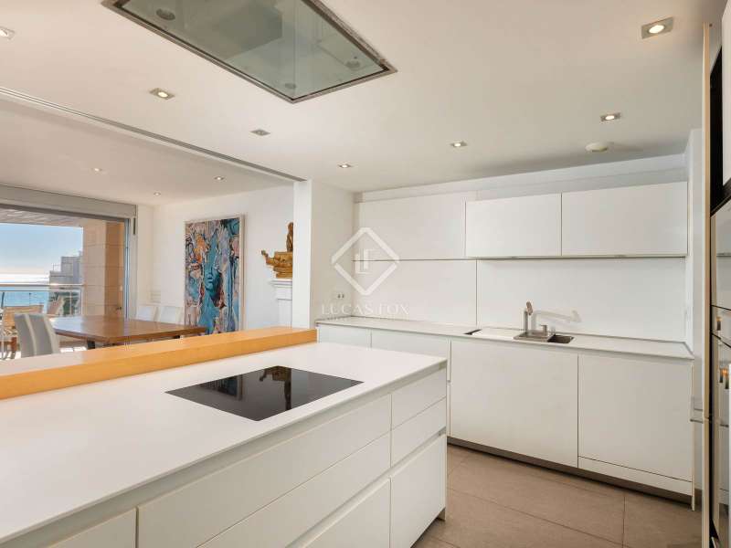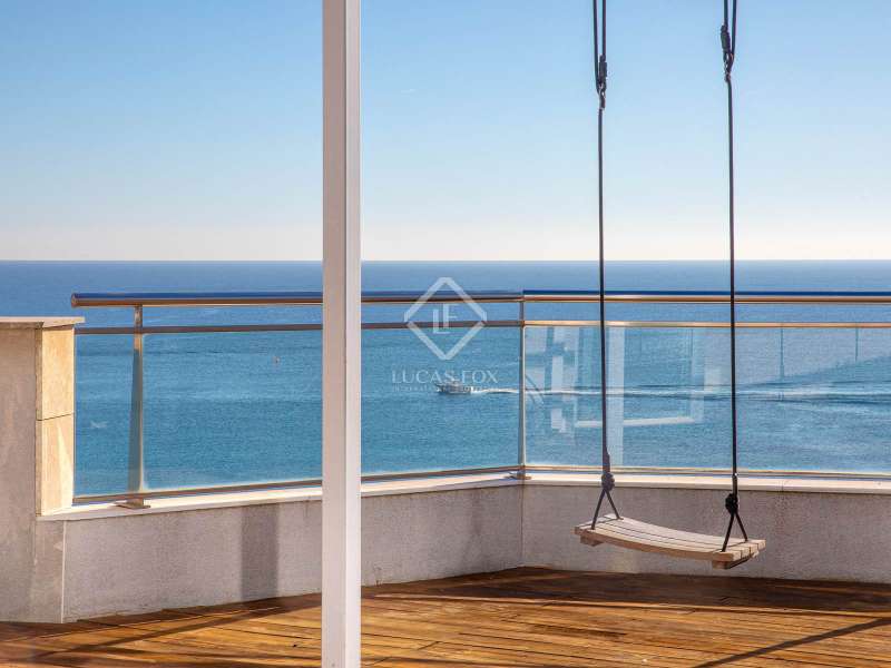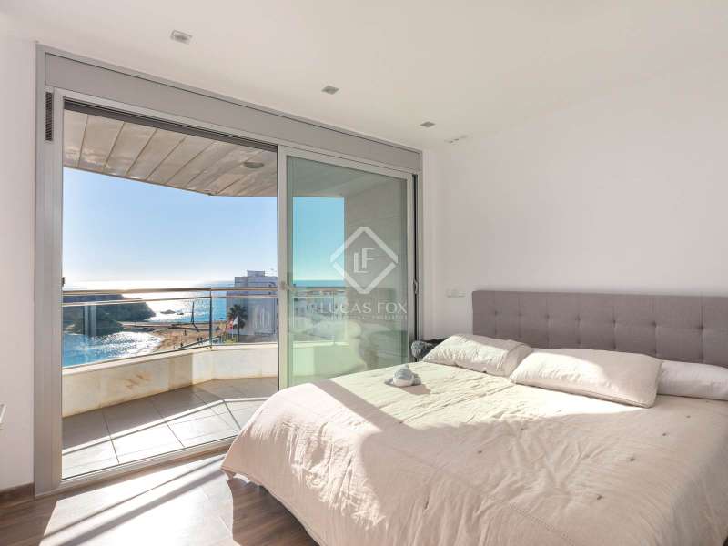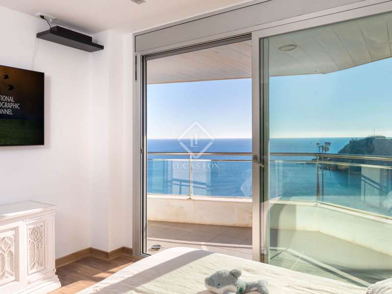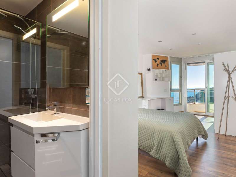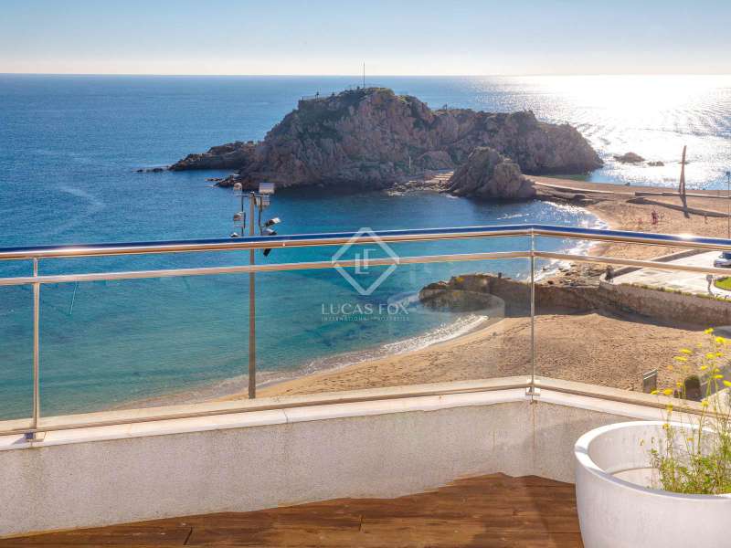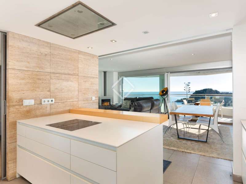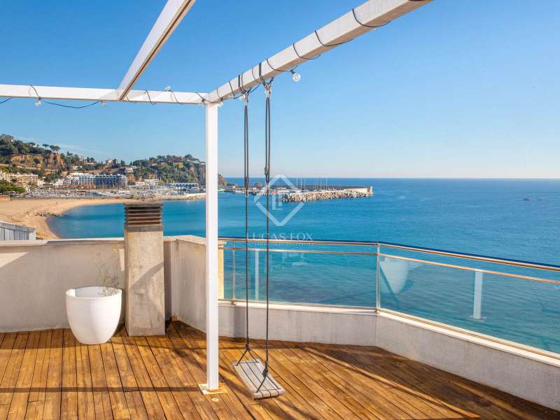Lucas Fox presents this spectacular triplex penthouse on the seafront in Blanes, with unparalleled views of the Mediterranean, Sa Palomera, and the port. This unique property stands out for its exclusive design, its luminosity, and its thoughtful layout over three floors. The first two are dedicated to the property, while the third offers an impressive sun terrace with the possibility of installing a private pool. From the moment you enter the penthouse, you'll immediately notice its exclusive character. On the main floor , a spacious and bright entrance hall leads to an elegant living-dining room with a fireplace and an open kitchen by the renowned Bulthaup brand, all with spectacular sea views. The kitchen connects to a terrace ideal for enjoying the views, as well as providing access to a practical laundry area and a guest toilet. On this same floor , there is an en-suite bedroom with a private bathroom and a west-facing terrace. The upper floor , accessible via both a private elevator and a modern staircase, houses a library area that connects the spaces. This is where the main bedroom is located, complete with a full bathroom , dressing room, study, and access to a private seafront terrace. This floor also features another en-suite bedroom with Mediterranean views and access to the same terrace. On the top floor, a spectacular sun terrace allows you to enjoy the sun and panoramic views in complete privacy. This space, already equipped for a pool, is ideal for relaxing, holding meetings, or simply admiring the landscape. The building, constructed in 2012, is in excellent condition. The property offers high-quality finishes: wooden floors, ducted air conditioning (hot/cold), a fireplace, several terraces—two of them with direct sea views—and a third facing the rear for greater versatility. This penthouse represents a unique opportunity for those seeking a modern, sophisticated property with an unbeatable location in the heart of Blanes. The presence of a private elevator between floors adds a unique value in terms of comfort and accessibility.