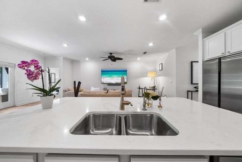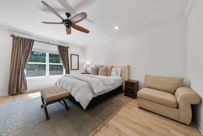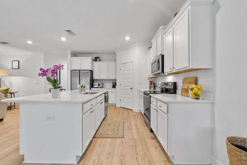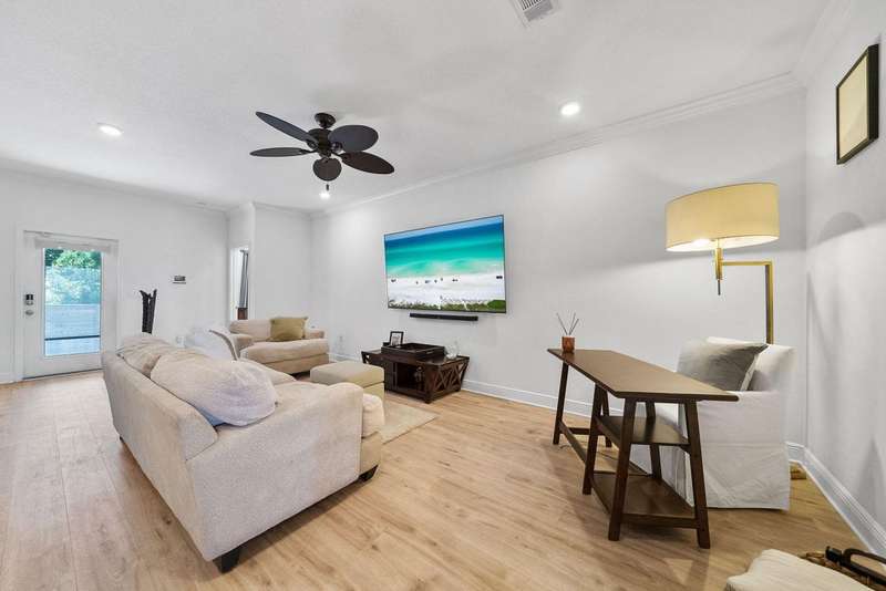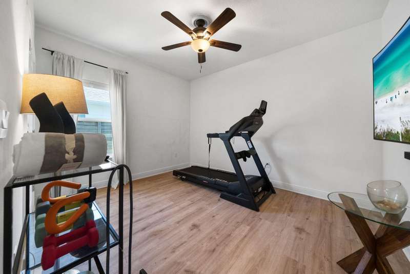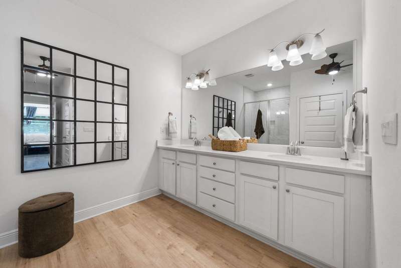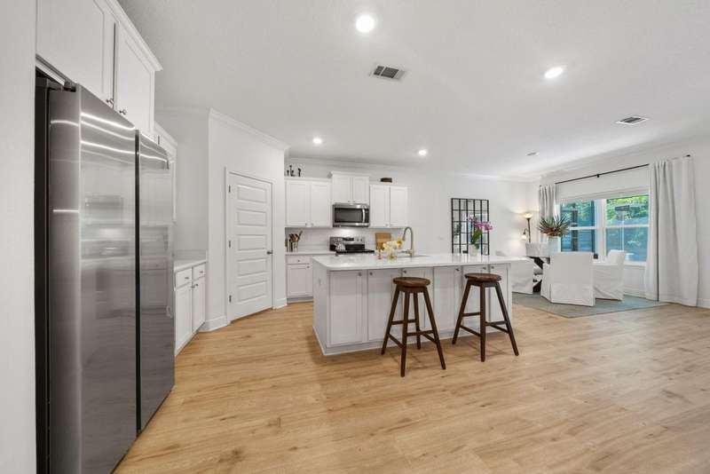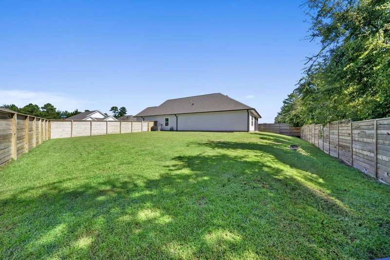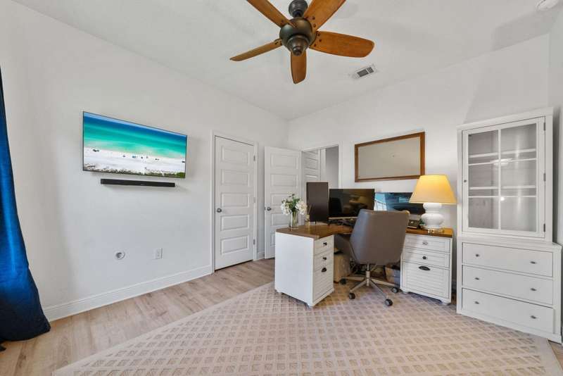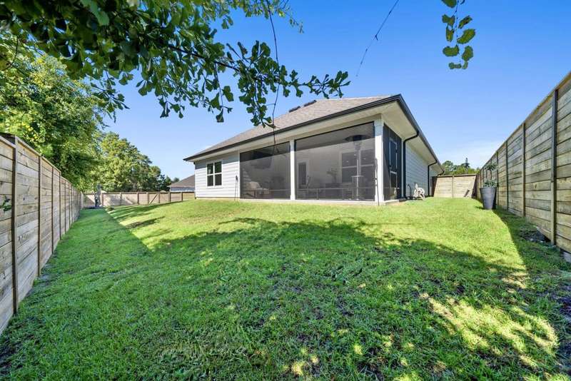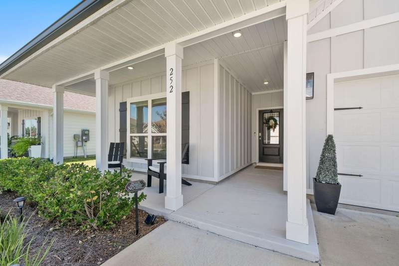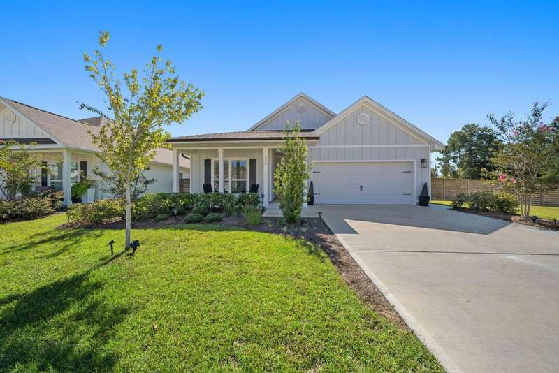 Modern farmhouse luxury meets privacy and potential on a rare 0.27-acre corner lot in The Preserve at Paradise Cove. With only one adjoining neighbor, a lush wooded preserve behind the home, and a fenced yard that is larger and more private than most in the community, this 4BR/2BA residence offers unmatched seclusion just minutes from 30A. The expansive yard is large enough for a pool, outdoor kitchen, or casita, and renderings are available to help buyers envision the possibilities (subject to HOA and county approval; pool quote available upon request). Designed for indoor-outdoor living, the home features inviting front and rear porches plus a custom black-framed screened patio with mounted TV, perfect for relaxing or entertaining. Inside, you'll find wide-plank LVP flooring (no carpet), quartz counters, a walk-in pantry, an oversized primary suite, and over $100K in thoughtful upgrades including custom closets, blackout shades, a whole-home air purifier, water filtration system, epoxy garage flooring, expanded driveway, attic storage, gutters, irrigation, and landscape lighting. Constructed in 2022, the home also offers smart features with Deako lighting, app/voice controls, and hardwired ADT. With sidewalks, a dog park, and easy access to Eden Gardens State Park, public and private schools, and the 30A beaches, this one-owner, no-pet home is better than new and move-in ready.