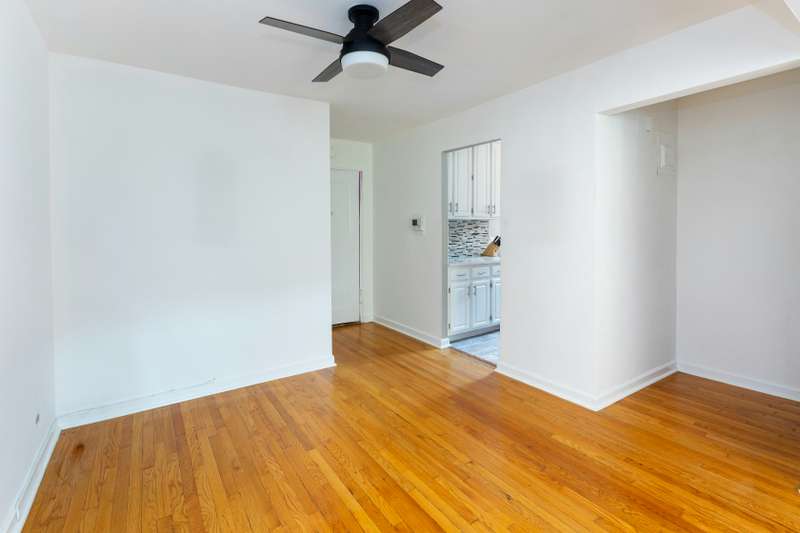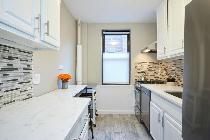 Retreat to the exceptionally quiet corner bedroom, which benefits from multiple exposures and is spacious enough to accommodate a king-sized bed, nightstands, and additional furnishings. The windowed bathroom has been tastefully updated with modern white wall tiles and gray flooring, completing the home's contemporary feel.