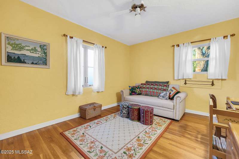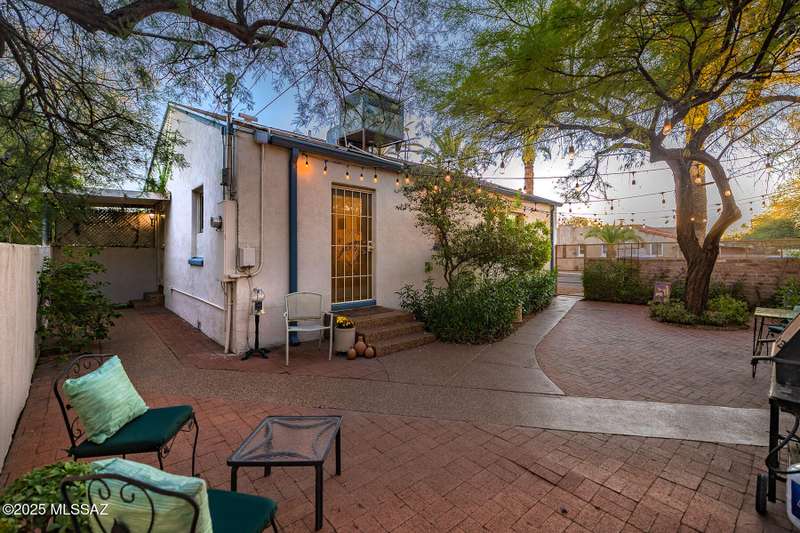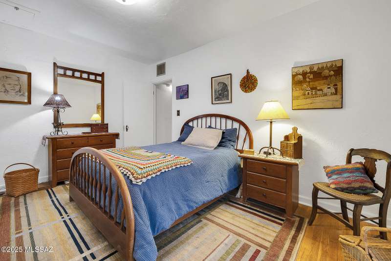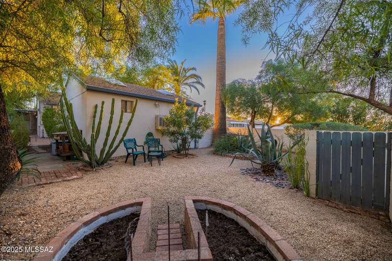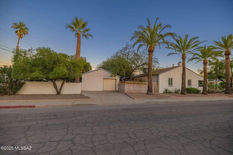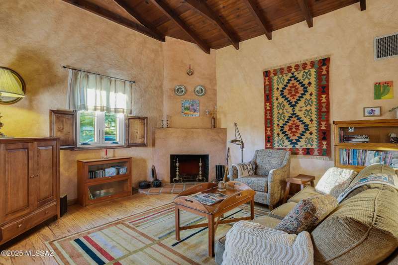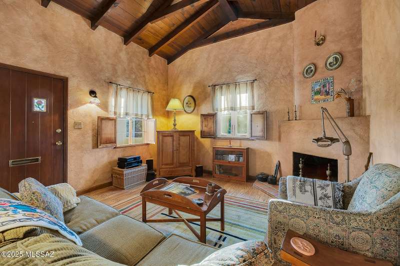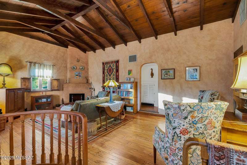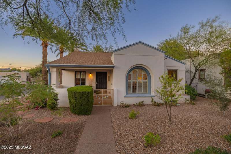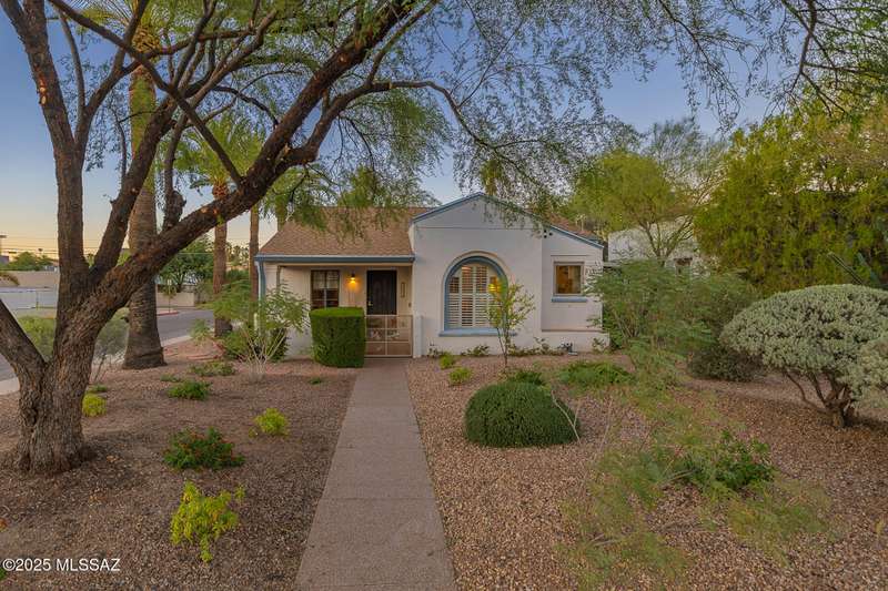 Sam Hughes exquisite interior, stunning living room w/ wood ceiling & floors, fireplace & wonderful, raised dining area w/ wood floors. Kitchen w/tile. Charming, private, walled, rear brick patio. Large garage w/ attached, wood floor studio storage. Very attractive corner lot large enough to add a guest house. 1 blk to Sam Hughes Place & restaurants/ shops. U of A is 2 blocks. Walk to Basketball/Football games. Qualifies for historic real estate tax reduction on primary home.