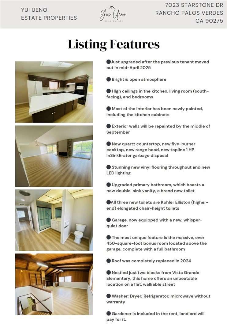 This spacious, potentially four-bedroom home has been thoughtfully upgraded, making it an ideal retreat for those seeking a fresh start. Step inside and be greeted by a bright, open atmosphere. The high ceilings in the kitchen, living room (south-facing), and bedrooms add to the home's already expansive feel. Most of the interior has been newly painted, including the kitchen cabinets, which now frame a gleaming quartz countertop, and a new five-burner cooktop, a new range hood. The entire home features stunning new vinyl flooring and new LED lighting, creating a seamless and vibrant living space. The upgrades extend to every corner, including the primary bathroom, which boasts a new double-sink vanity, brand new toilets, and the garage, now equipped with a new, whisper-quiet door. The most unique feature is the massive, over 450-square-foot bonus room located above the garage, complete with a full bathroom. While not an enclosed bedroom, its size and amenities make it perfect for a fourth bedroom, a home office, or a versatile family retreat. Nestled just two blocks from Vista Grande Elementary, this home offers an unbeatable location on a flat, walkable street. The owners, who have lovingly cared for this home, are seeking a qualified tenant to establish a positive, long-term relationship with. This isn't just a house; it's a place to call home!