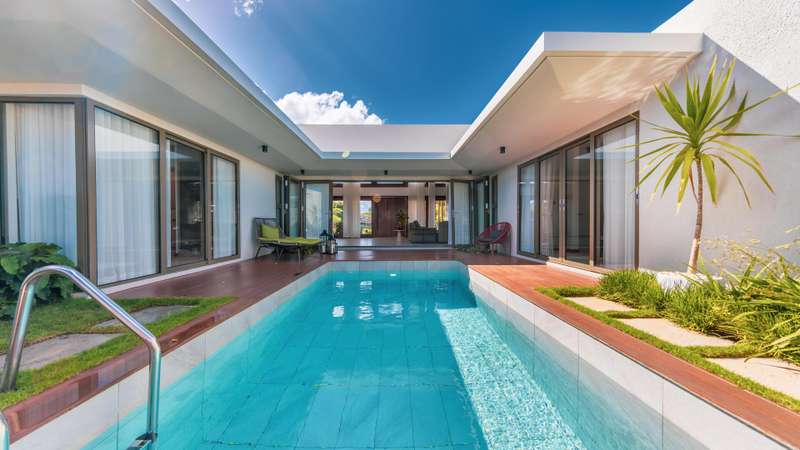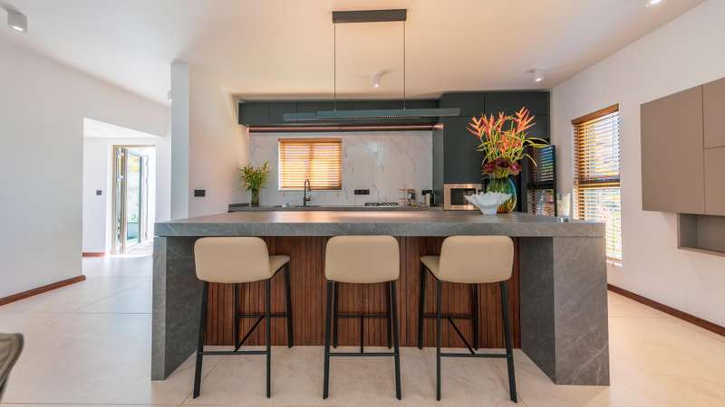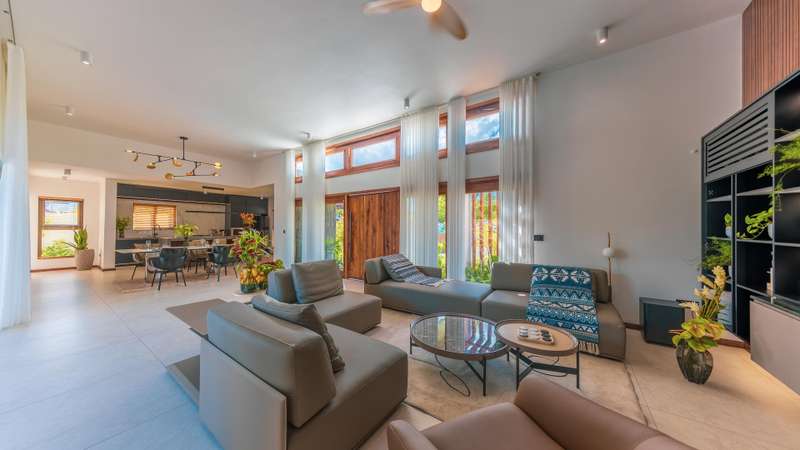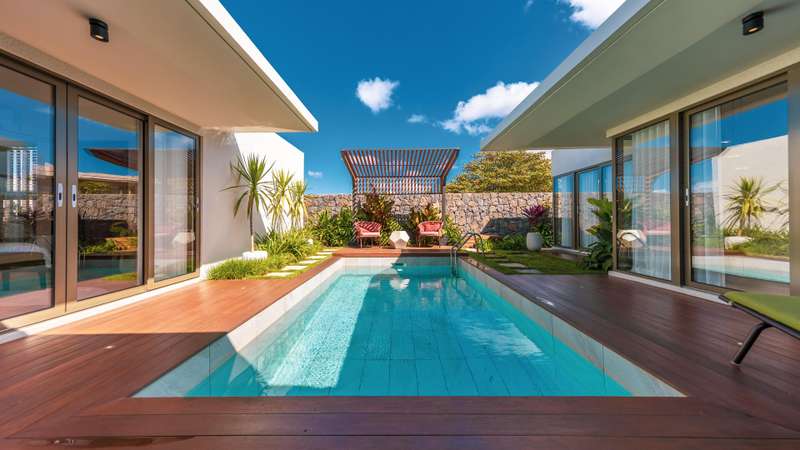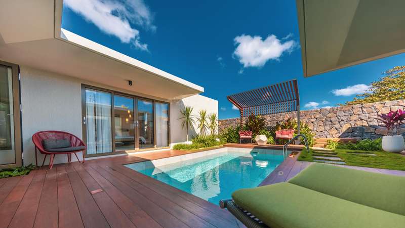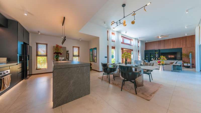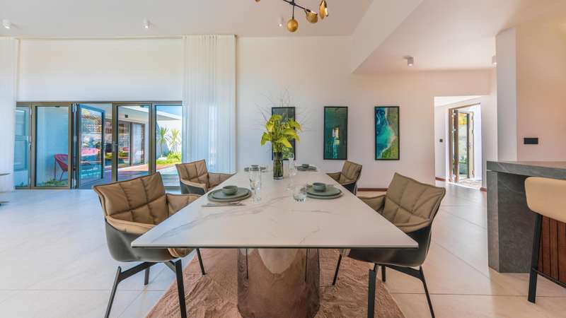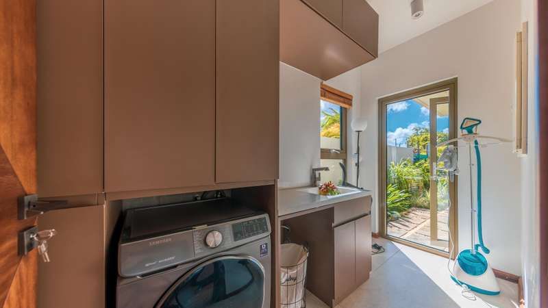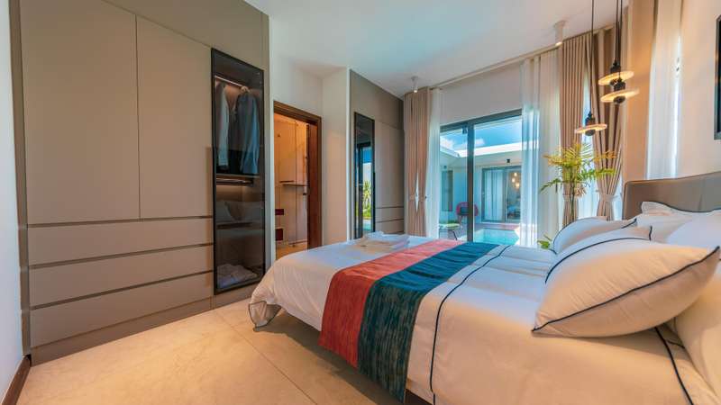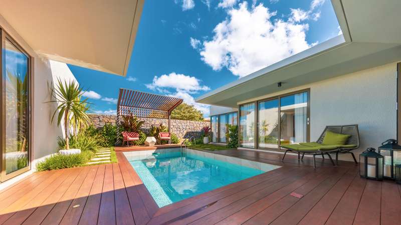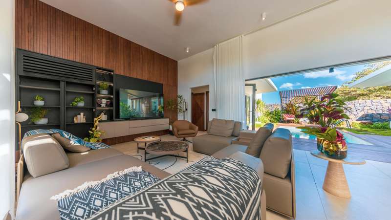Located within an exclusive and secure gated estate in Pointe aux Piments, this single-storey villa offers a refined tropical lifestyle in one of the most sought-after areas on the northern coast of Mauritius. Set on a plot ranging from 419 to 609 m², the villa boasts an interior surface of approximately 240 m², designed for both elegance and functionality. Inspired by traditional Asian courtyard homes and reinterpreted with a modern, minimalist aesthetic, the villa welcomes you into a bright, open-plan living space that flows seamlessly to the outdoors. Large sliding doors open onto a covered terrace, a lush landscaped garden, a private swimming pool, and a gazebo, ideal for alfresco dining and relaxation. The villa comprises three spacious ensuite bedrooms, including a master suite with a walk-in wardrobe, an outdoor shower, and direct access to the garden. The fully fitted kitchen features an island countertop and premium finishes, including Indian marble worktops and high-quality appliances such as an oven, microwave, gas hob, hood, and washing machine. Carefully selected materials and finishes add a touch of luxury throughout the villa: solid timber doors, ceramic tiling, concealed lighting, integrated storage, a guest WC, and a separate laundry area. All bedrooms and the living area are air-conditioned for year-round comfort. Key Features: 3 bedrooms / 3 bathrooms Built-up area: approx. 240 m² Land size: from 419 to 609 m² Private pool, gazebo, and landscaped garden Fully equipped kitchen, laundry room, outdoor shower Air conditioning in all bedrooms and living space 2 private parking spaces + guest parking Optional Deco Pack (furniture and accessories) Estate Amenities: Gated residence with 24/7 security Freehold ownership with permanent residency eligibility for foreigners Scheduled delivery: End of 2026 Easy access to beaches, 5-star resorts, golf courses, restaurants, clinics, and shopping malls This villa offers the perfect balance between tropical serenity and contemporary comfort, ideal as a primary residence, holiday home, or high-potential rental investment.