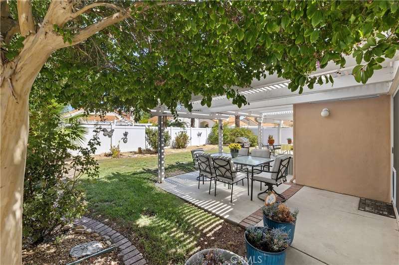 BACK ON MARKET. Buyer could not perform. Discover the perfect blend of comfort and convenience in this lovely single-story home located in the Palmilla on the Greens 55+ Senior Community. This home features 3 bedrooms, 2 baths with 1206 square feet of living space. The 3rd bedroom is versatile and being used as an exercise room with no closet. This residence offers soaring vaulted ceilings, an open floor plan, and a cozy fireplace for those relaxing evenings. The kitchen shines with natural light, quartz countertops and newer GE stainless steel appliances. Cozy breakfast nook eating area. Step outside to a private backyard retreat with newer vinyl fencing, a full-length covered patio, and fruit trees - an ideal setting for outdoor living and entertaining. Living in Palmilla on the Greens means access to a pool, spa, and clubhouse, plus all the Menifee Lakes amenities - including lakeside trails, a gym, golf, picnic areas, fishing and more. With its central location you are near lots of shopping and dining, Loma Linda Medical Center, Kaiser Medical Center, Temecula's award-winning wineries, and casinos - plus quick freeway access - every convenience is within reach. Menifee is the fastest growing city in California. Low taxes, low HOA. Come live the good life!