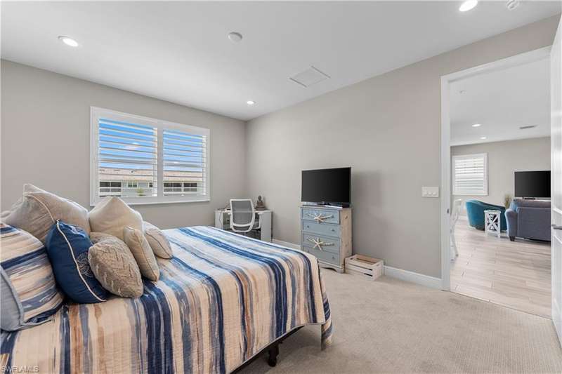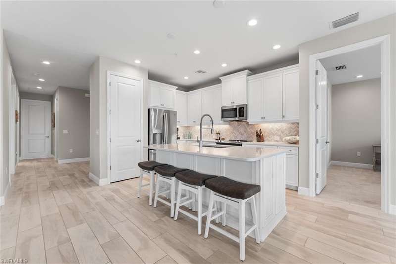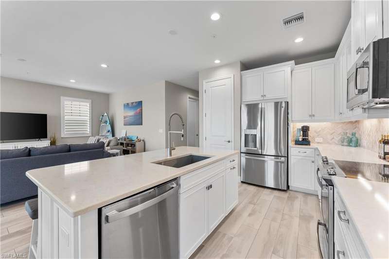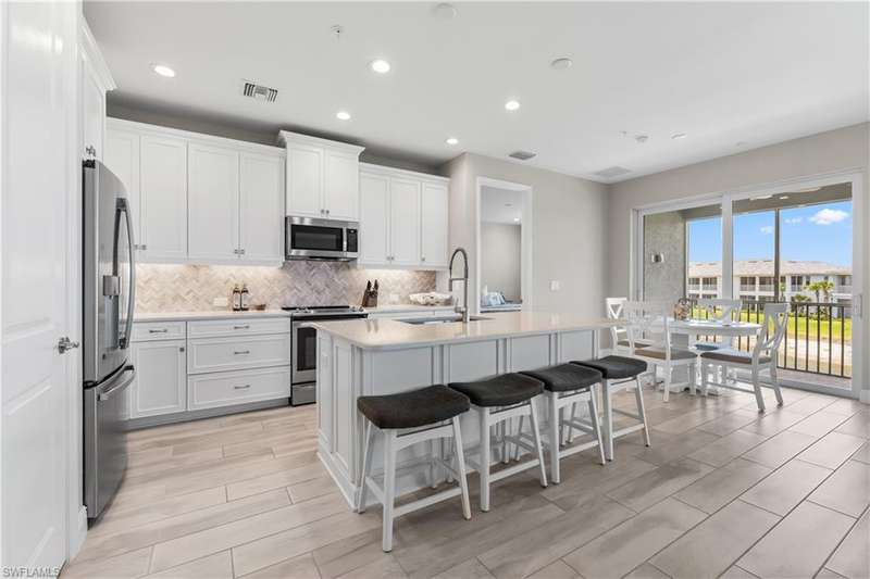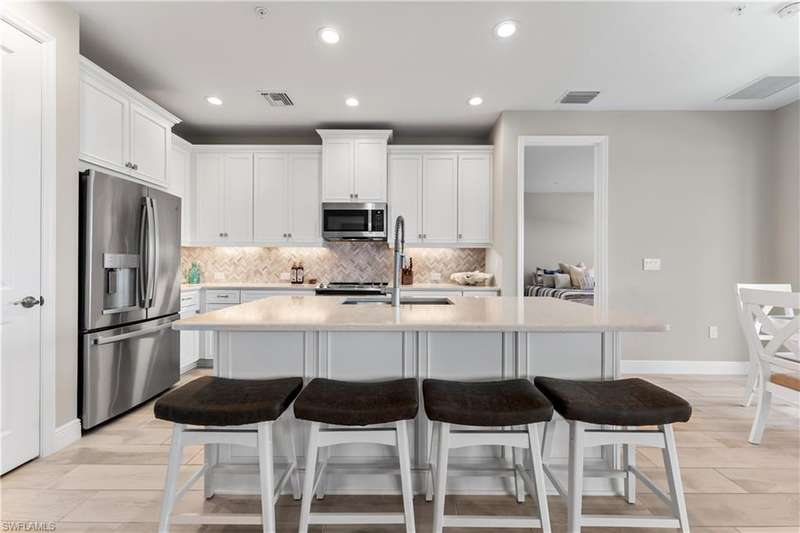 PRICED TO SELL! *South Facing - *Corner Unit - *Lakeview! Built in 2023 by the highly renowned Neal Communities, this condo features a stunning British West Indies design nestled in an amenity rich gated community located just minutes from Downtown Olde Naples. This light and bright open-concept corner unit is conveniently located within walking distance to the community pool and clubhouse and features 2 bedrooms and a large den which can easily be used as a third bedroom. Loaded with luxury features such as hurricane impact doors and windows, plantation shutters, contemporary quartz countertops, white shaker style soft-close cabinets, under mount cabinet lighting, designer backsplash, and premium stainless steel appliances. The spacious master bedroom features a sizable walk-in closet, frameless glass shower, and dual sinks with plenty of undercabinet storage. Enjoy the most sought after light & bright Southern exposure with picturesque sunsets over your long lake view. The centrally