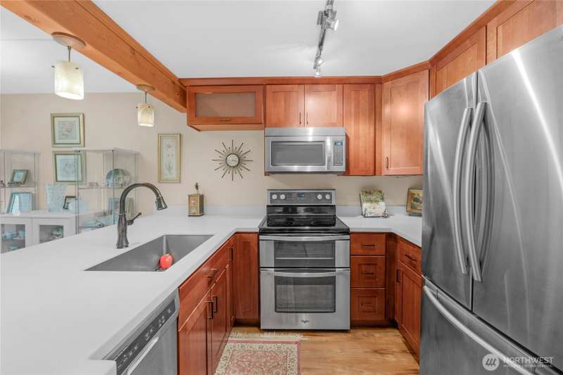 This beautiful, updated 1-bed, 1-bath Cascade Park condominium is ready for you! A charming elevated foot bridge guides you to this main floor, cozy condominium that boasts updated Kitchen and bath, newer flooring and a wood burning fireplace, perfect for ambiance and tranquility. Open kitchen and bar seating to entertain your guests with culinary creations. Take in the outdoors from your greenbelt facing quiet balcony that overlooks a beautifully landscaped lawn, trees and bubbling creek. Conveniently located with easy access to HWY 167, 405, and I-5 freeways, the property offers an assigned covered parking space and guest parking. It's also pet-friendly (40 lbs max each).