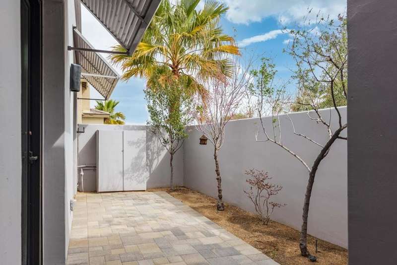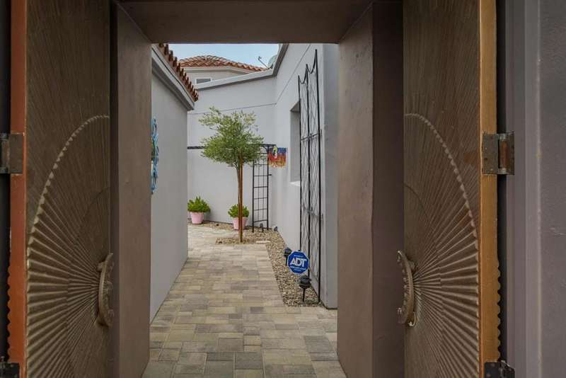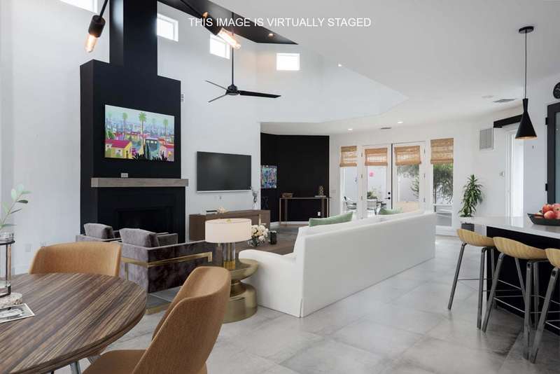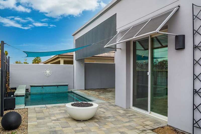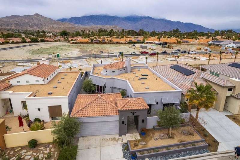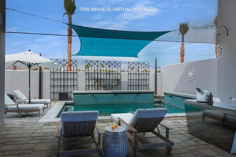 Located in the gated Rio Del Sol community, this former model home has been both remodeled and refreshed. Gifted with stunning mountain views from both inside and out, along with numerous original design features and additional custom finishes, this home is ready to move in tomorrow. The Eco-Block insulating concrete wall system makes it both energy-efficient and environmentally friendly. From the moment you pass through the double door entry, the great room welcomes you with an abundance of natural light from the 17 foot ceilings and clerestory windows. The remodeled kitchen is a chef's delight, with the upgraded appliances (Bosch &), a walk-in pantry, cabinets and tile to the ceiling, and an updated island and spacious countertops. There's enough room for more than one cook in the kitchen! The home is tiled throughout. With 2316 sq ft inside, a private courtyard in the center of the lot, a brand new spool and firepit area with an adjacent covered patio in the rear, this property is well-suited for entertaining. This exceptional home boasts 3 bedrooms, 3 baths, (all remodeled), and a 2 car garage. Each bedroom provides access to a patio outdoors with decorative Bermuda shutters and poolside, a canvas sail providing shade. This home is well situated in the community, away from the main gate, yet close enough to zip in and out. Rio Del Sol is a short ride from the shops and restaurants in Palm Springs, Cathedral City, Rancho Mirage, and Palm Desert. Your highly stylish, highly upgraded desert oasis just needs...you.