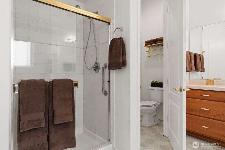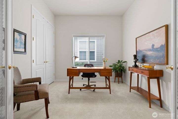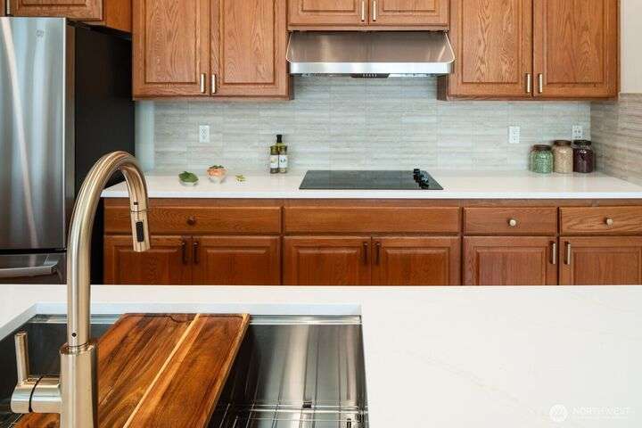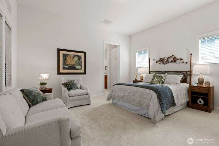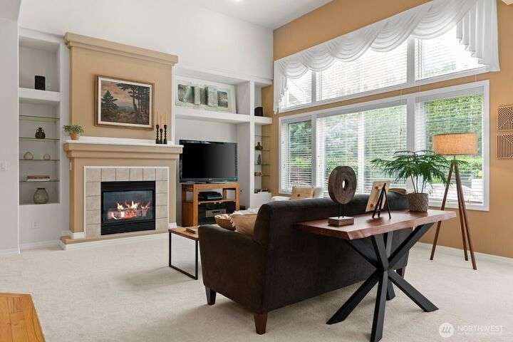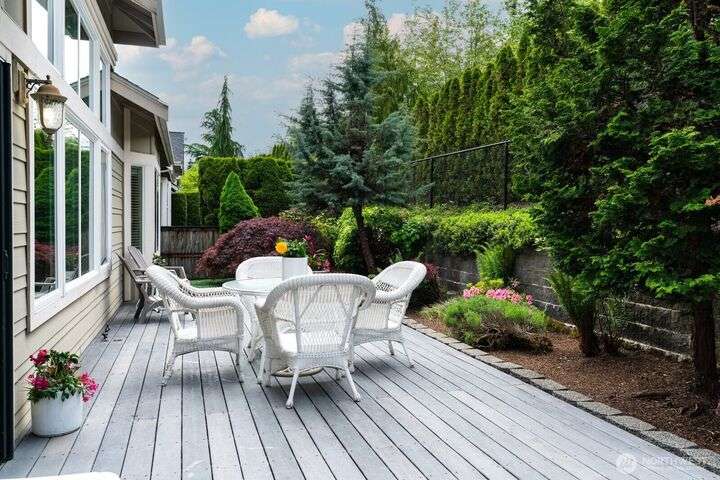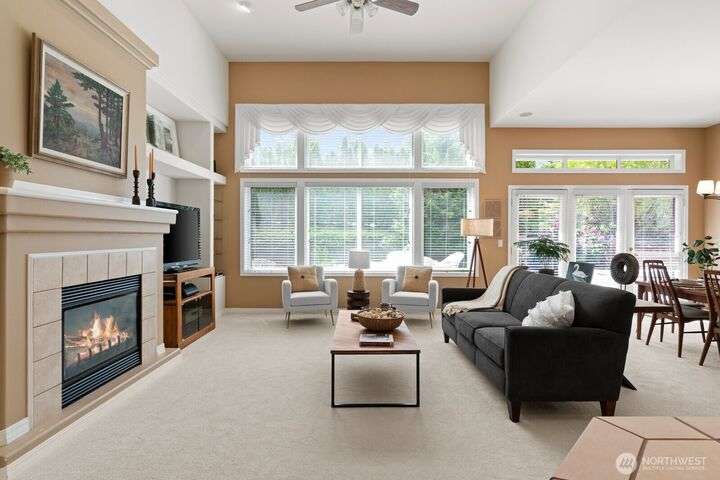 Beautiful updates such as New Roof, stunning quartz countertops and stainless appliances. Nestled in coveted Trilogy 55+ community, this desirable Hemlock plan is appointed with a two-story ceiling at entrance, and in great room, cozy fireplace and dramatic window wall, illuminating light. Formal dining room plus dining area off great room with backyard views and access to large deck and fenced yard. Chef’s kitchen provides a large island, an abundance of cabinets and counter-space, pantry and access to mud/laundry room off garage. Sizable bedrooms including primary suite with two walk-in-closets, a 5-piece bath, and guest en-suite with full bath and den with French doors. Third Car garage bay for golf cart. Close proximity to Club house!