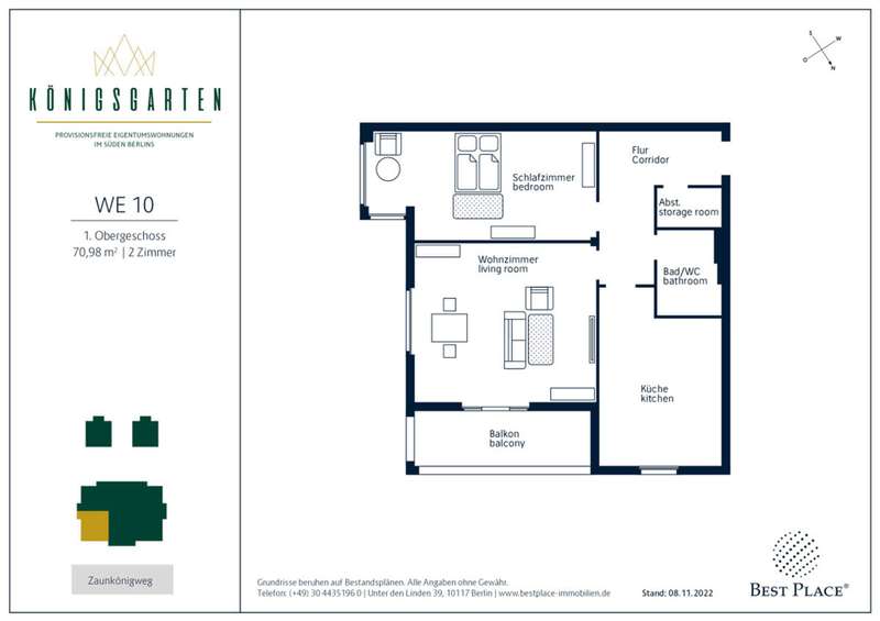 The ensemble in Zaunkönigweg rises on a spacious garden plot and consists of the street-side apartment building and the two detached houses on the quiet garden side. The Königsgarten project is an ideal capital investment and has 23 rented residential units with living areas between approx. 36 m² and approx. 156 m². Each unit has a balcony or terrace. A highlight are the private gardens to the flats on the ground floor and the spacious terraces to the maisonettes on the top floor. The two detached houses with gardens and direct access to the underground garage are particularly attractive. Optionally, a parking space can be purchased in the underground garage.