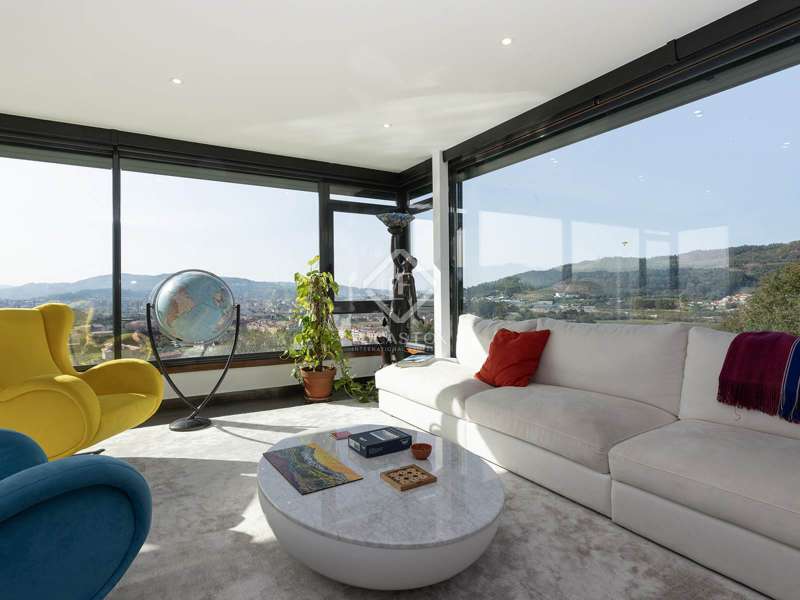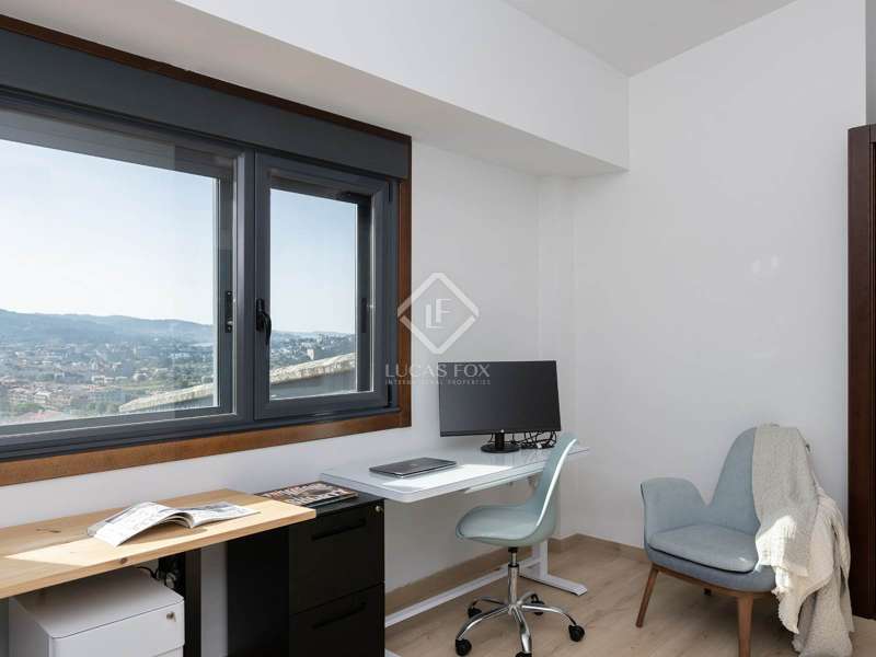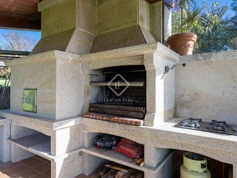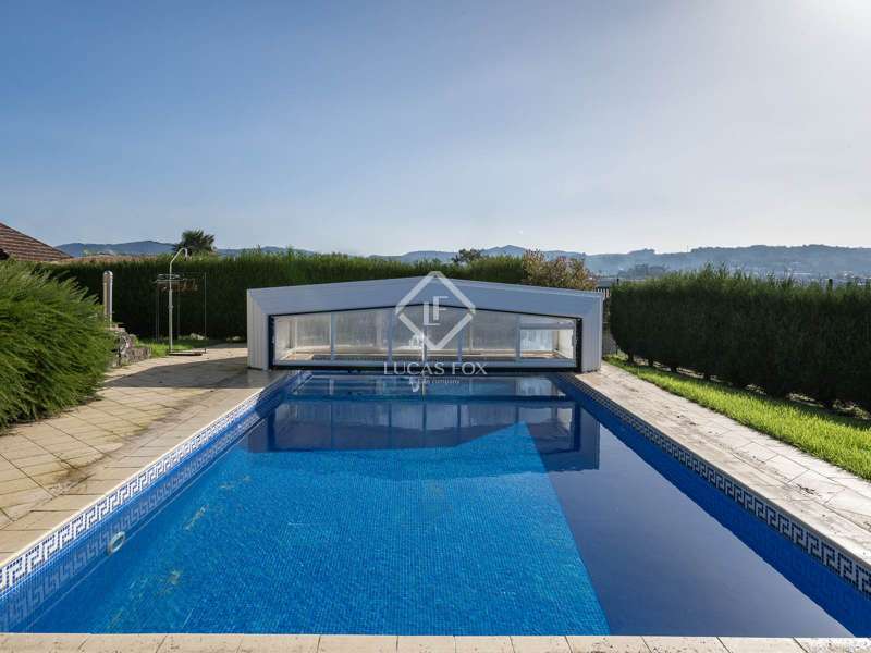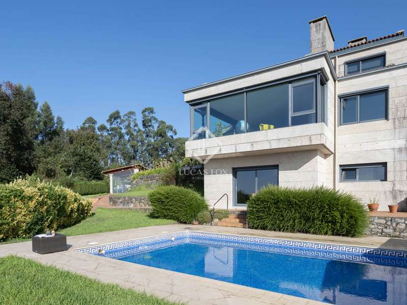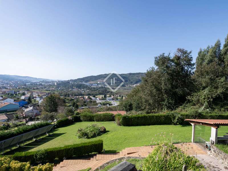 This modern house offers views over the monastery of Lerez, the estuary and city of Pontevedra as well as the hills beyond from its elevated vantage point, and features an open-plan layout with designer touches. Finished in traditional, locally sourced stone, this property was built in 2008 and has been upgraded through the years, with high-quality flooring and electric blinds both inside and out in most parts of the house. Views over Pontevedra are afforded by a panoramic window from the living room. Arriving up a driveway that winds its way up to the rear of the house, there is parking for a number of vehicles outside, as well as a two-car garage within the property. Once inside, we find a modern layout, with a large kitchen / diner with an island, airy and bright spaces with a lounge boasting a picture window out onto the Galician countryside, the monastery, and the town and river below. Heated flooring is installed throughout the ground floor, and there are also air conditioning units in the living area and all bedrooms. Completing the ground floor layout is a guest bathroom. Upstairs, on the first floor, we find two bedrooms which share a bathroom, another bedroom currently used as an office, plus the master suite featuring walk-in wardrobe and en-suite bathroom, as well as a terrace with fantastic views and an electric awning to keep you in the shade should you desire. Downstairs, there is also a liveable basement level with a large family / play room and another bedroom. Outside, there is a good mix of lawn and patio areas, as well as a covered swimming pool and of course the obligatory barbecue area for entertaining family and friends. This house would suit clients looking for a quality construction with a modern and airy layout, within a short drive to Pontevedra city centre and with easy links to the rest of Galicia both via road and public transport. It also benefits from a peaceful yet prominent location with views over the countryside and the town. Please contact us for further information.