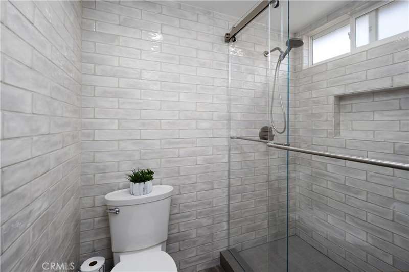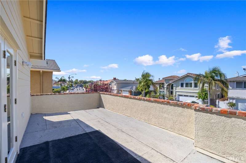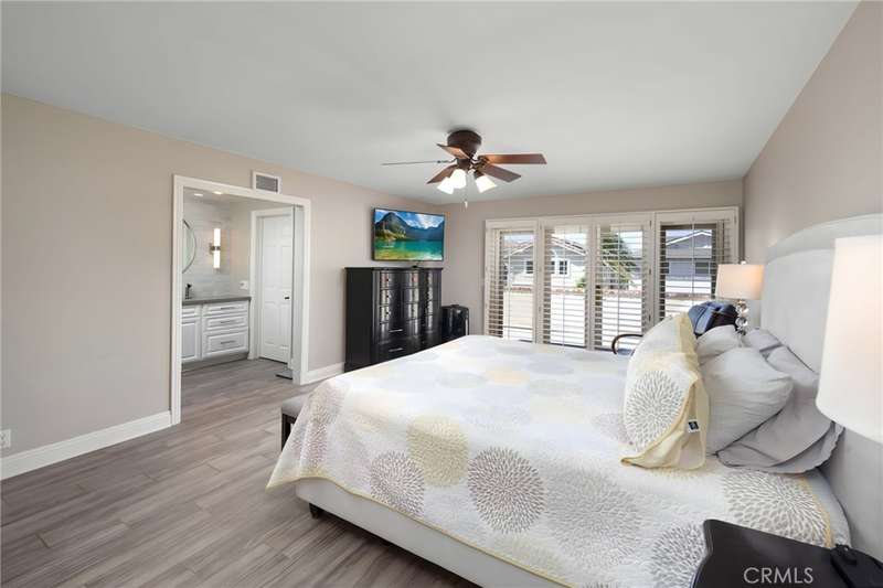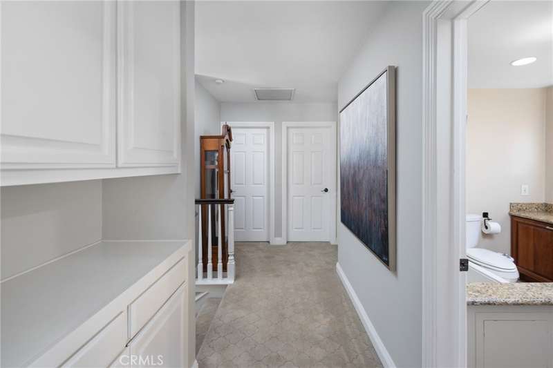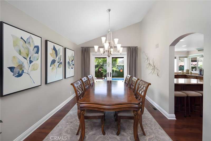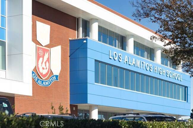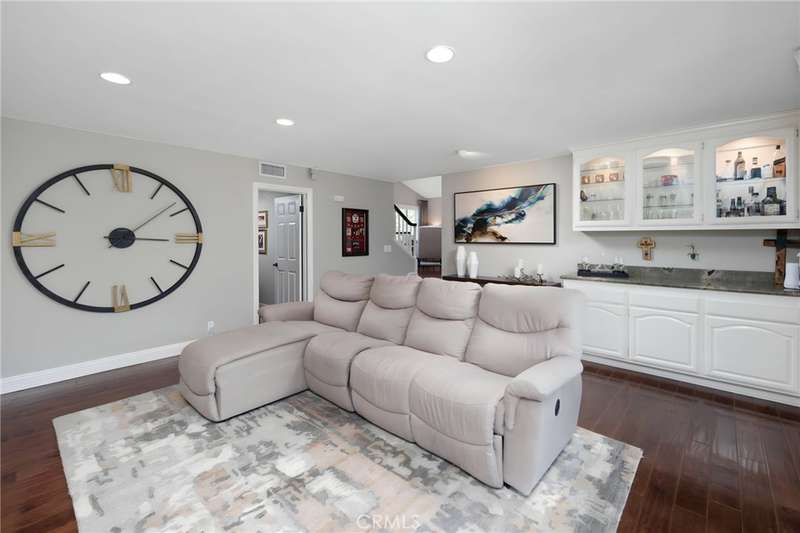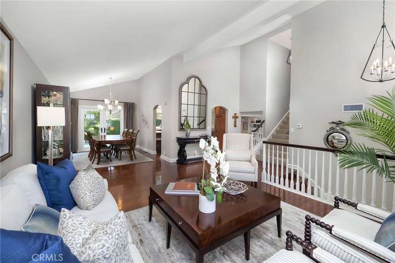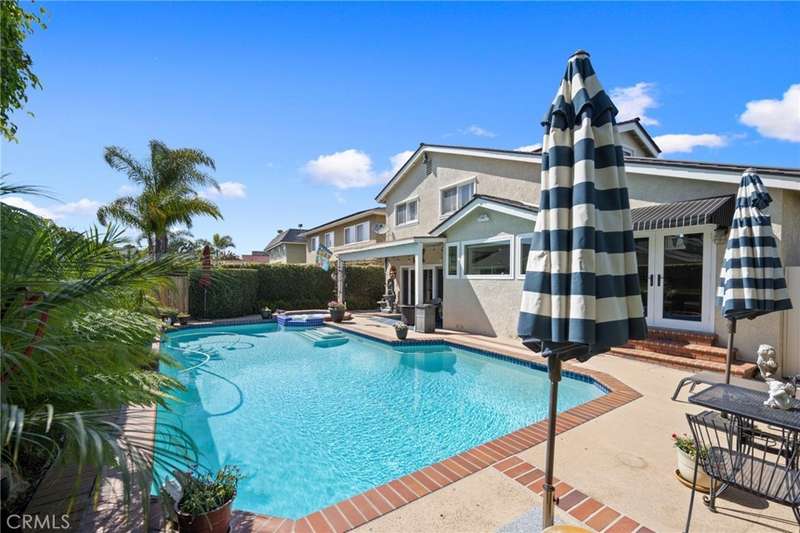 Stunning tri-level "Cornell" model pool home in the prestigious area of College Park East. The impressive double-door entry welcomes you into this remarkable home showcasing soaring vaulted ceilings in the living room and dining room creating a sense of spaciousness. The kitchen is truly a chef's delight... This gourmet kitchen is beautifully appointed with custom warm wood cabinetry, decorator tile backsplash, granite countertops, stainless steel appliances including a high-end GE Profile 42" refrigerator, microwave, oven, double-drawer dishwasher, 5-burner gas cook top and peninsula seating for casual dining...surrounded by dual pane windows providing an array of natural light. You'll love the family room giving center stage to the floor to ceiling built-in custom crafted white cabinetry with bookshelves and a stunning "whitewashed" brick fireplace & hearth, plus a built-in dry bar and glass-front display cabinet. French Doors lead out to a captivating backyard oasis, where a sparkling pool and spa (solar heated and paid for) with colorful mood lighting and cascading water features create a resort-like atmosphere. The lush shrubbery and raised planter add a touch of natural beauty to this enchanting space. A well-loved feature of this home is the downstairs bedroom with adjacent bath perfect for visiting guests or an in-home office. Upstairs you'll find two secondary bedrooms and a luxurious Primary Suite with 2 wardrobe closets and an outdoor balcony (offering space for future expansion). The recently remodeled Primary bath is gorgeous and has timeless appeal. Notable upgrades include; attractive wood flooring, updated baths, central air, copper plumbing, smooth ceilings, recessed lighting, designer light fixtures, new interior doors, Plantation shutters, indoor laundry & storage, 200 amp electrical panel, solar pool heating, roll-up garage door, a durable integrated tiled garage floor, and a 50amp plug for Electric Vehicle, and built-in storage cabinets and so much more! Highly acclaimed Los Alamitos School District. Truly a one-of-a-kind GEM!