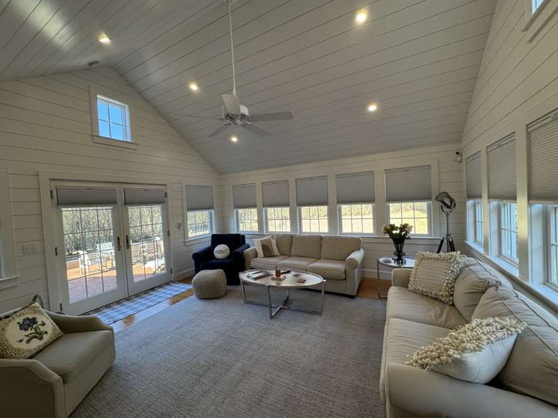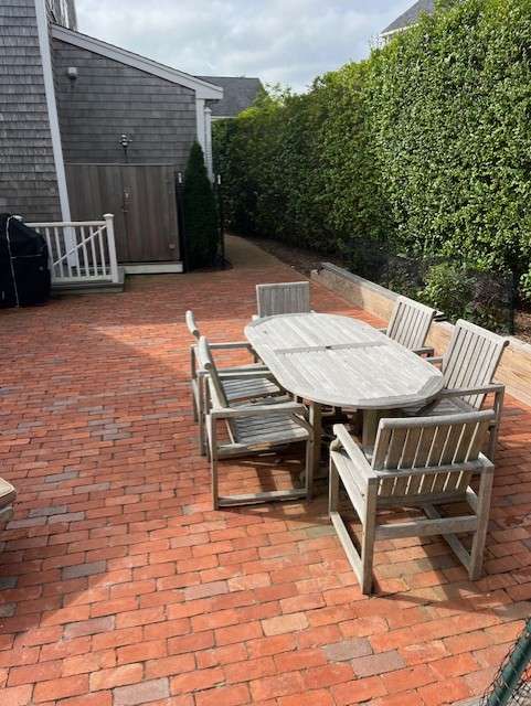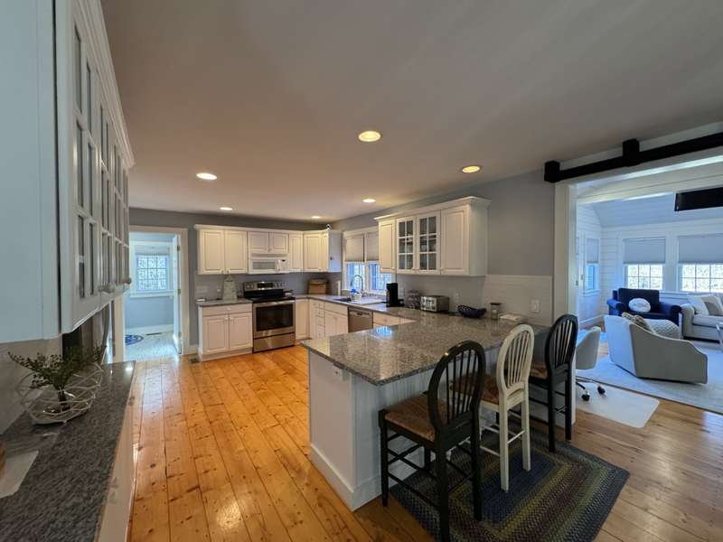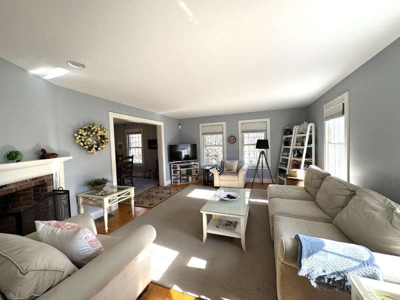 Welcome to this delightful four bedroom, two full and two half bath home nestled in the highly sought-after Naushop community of Nantucket. This residence offers an inviting blend of spacious living and comfort across three levels. As you enter, you're greeted by the front living room, complete with a cozy fireplace, offering a warm and welcoming space to unwind. The mudroom and laundry room are just off the beautifully appointed kitchen featuring white cabinetry and a breakfast bar, perfect for casual dining. The adjacent dining area boasts sliding glass barn doors that open into the expansive great room, showcasing a vaulted ceiling, shiplap walls and access to the outdoor brick patio through French doors, ideal for entertaining or al fresco dining. The primary suite on the second floor is a true sanctuary, featuring his and her closets and a full bath with tub/shower combination. Two additional bedrooms share a hall bath (tub/shower), while an inviting staircase leads to the spaciou