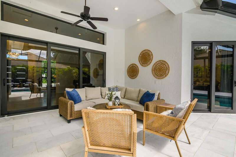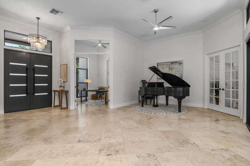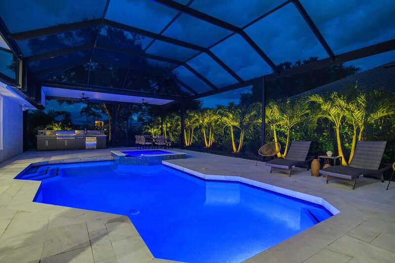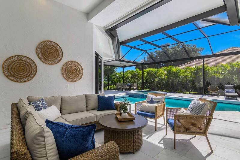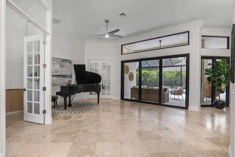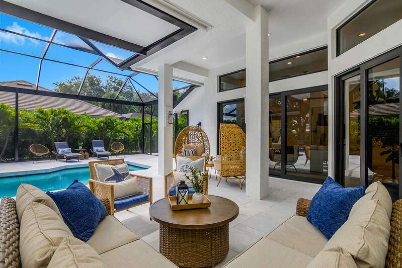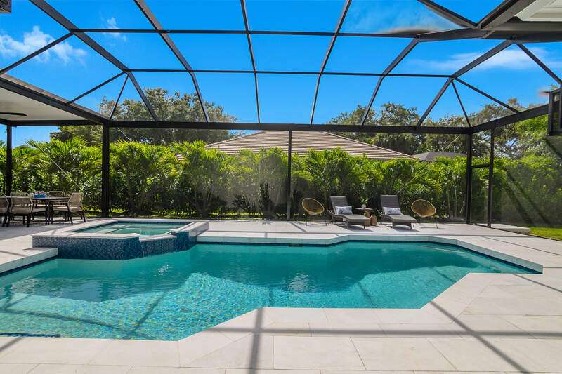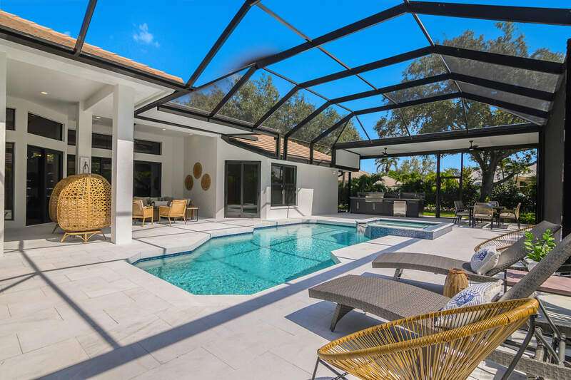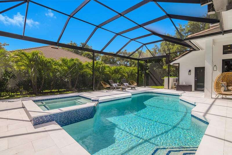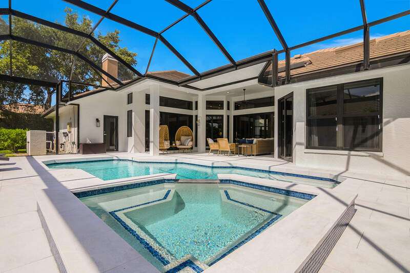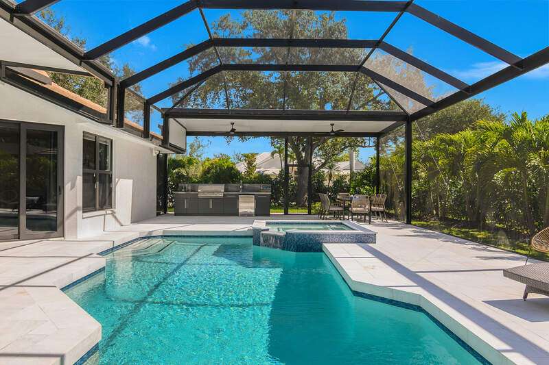 Luxurious, private, and serene, this beautifully renovated home is an oasis nestled in a desirable, quiet location within the heart of the coveted neighborhood of Monterey. Thoughtfully updated & meticulously maintained both inside and out, this home enjoys an abundance of light with soaring 11.5 foot ceilings, top-of-the-line finishes and premium appliances. At the heart of the home, a custom 11 foot island anchors the well-equipped chef's kitchen with sleek floor-to-ceiling custom cabinetry with NEW JennAir RISE appliances, including 48" refrigerator, gas range and double wall oven with convection/microwave. The renovated bathrooms have been gorgeously updated with Taj Mahal quartzite countertops and custom cabinetry. A dedicated office with floor-to-ceiling custom built-in cabinetry offers a stylish and functional work/flex space. Step outside to your own private sanctuary, complete with NEW stunning picture-window screen cage with unique & functional shade/rain protection roof systems, NEW outdoor kitchen, & NEWLY refinished pool/spa, all framed by lush hedges and tropical palms with dramatic landscape lighting. Countless upgrades provide efficiency as well as peace of mind, including NEW impact windows & doors, NEW A/C, NEW instant hot water heater, NEW pool equipment, NEW paver driveway, newer roof and more! With 24-hour gate guard, 3 har tru tennis courts, community pool/clubhouse, sport/pickleball court, neighborhood events & just minutes to beaches, downtown, shopping, & schools - Make this your next move!