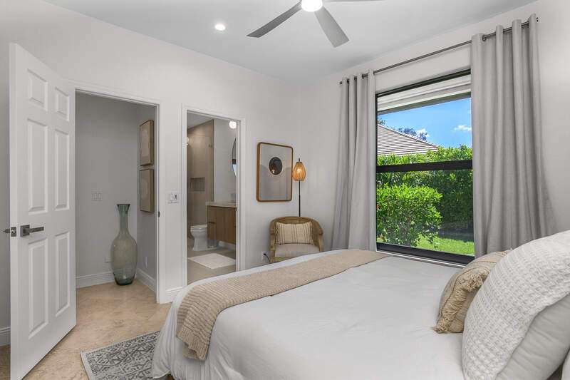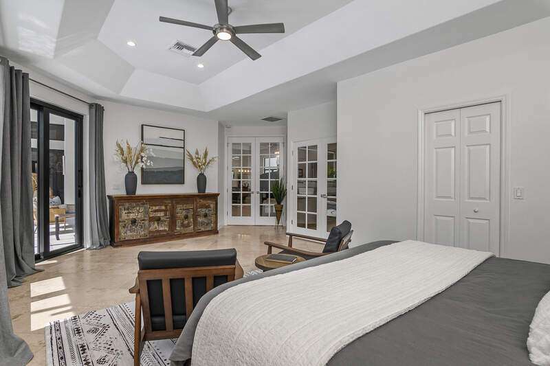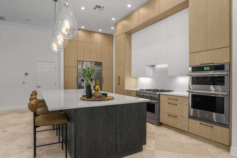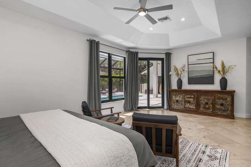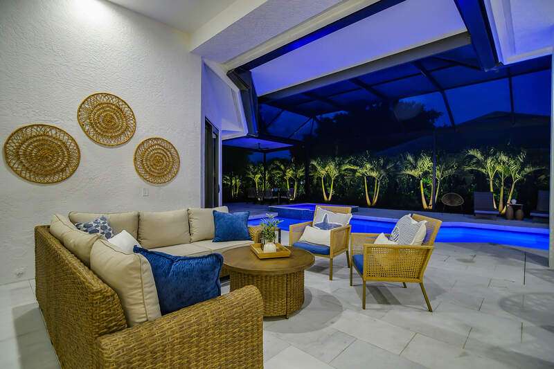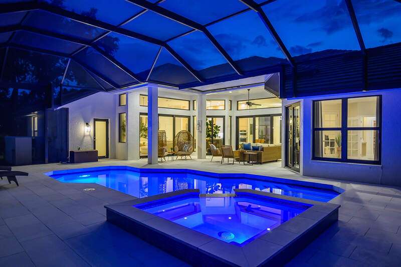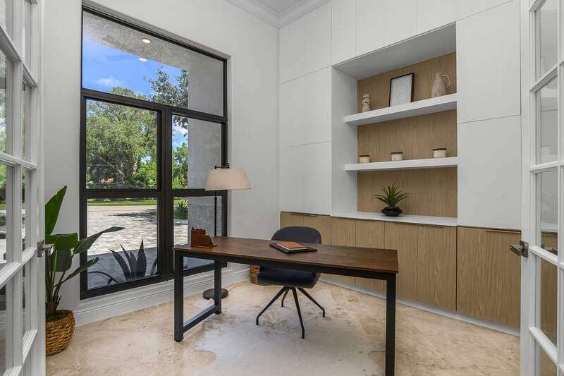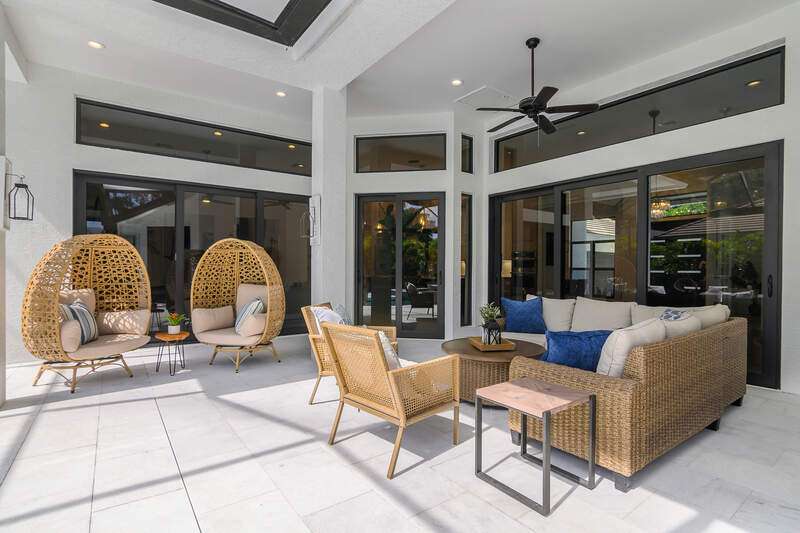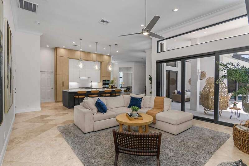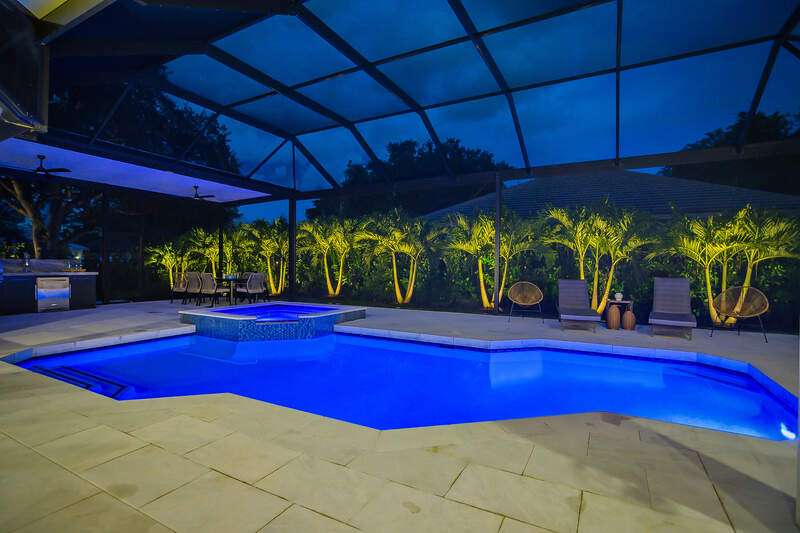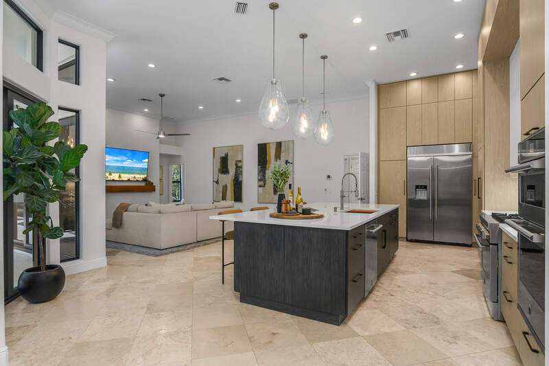 Luxurious, private, and serene, this beautifully renovated home is an oasis nestled in a desirable, quiet location within the heart of the coveted neighborhood of Monterey. Thoughtfully updated & meticulously maintained both inside and out, this home enjoys an abundance of light with soaring 11.5 foot ceilings, top-of-the-line finishes and premium appliances. At the heart of the home, a custom 11 foot island anchors the well-equipped chef's kitchen with sleek floor-to-ceiling custom cabinetry with NEW JennAir RISE appliances, including 48" refrigerator, gas range and double wall oven with convection/microwave. The renovated bathrooms have been gorgeously updated with Taj Mahal quartzite countertops and custom cabinetry. A dedicated office with floor-to-ceiling custom built-in cabinetry offers a stylish and functional work/flex space. Step outside to your own private sanctuary, complete with NEW stunning picture-window screen cage with unique & functional shade/rain protection roof systems, NEW outdoor kitchen, & NEWLY refinished pool/spa, all framed by lush hedges and tropical palms with dramatic landscape lighting. Countless upgrades provide efficiency as well as peace of mind, including NEW impact windows & doors, NEW A/C, NEW instant hot water heater, NEW pool equipment, NEW paver driveway, newer roof and more! With 24-hour gate guard, 3 har tru tennis courts, community pool/clubhouse, sport/pickleball court, neighborhood events & just minutes to beaches, downtown, shopping, & schools - Make this your next move!