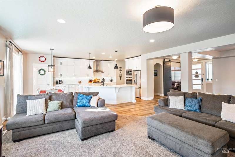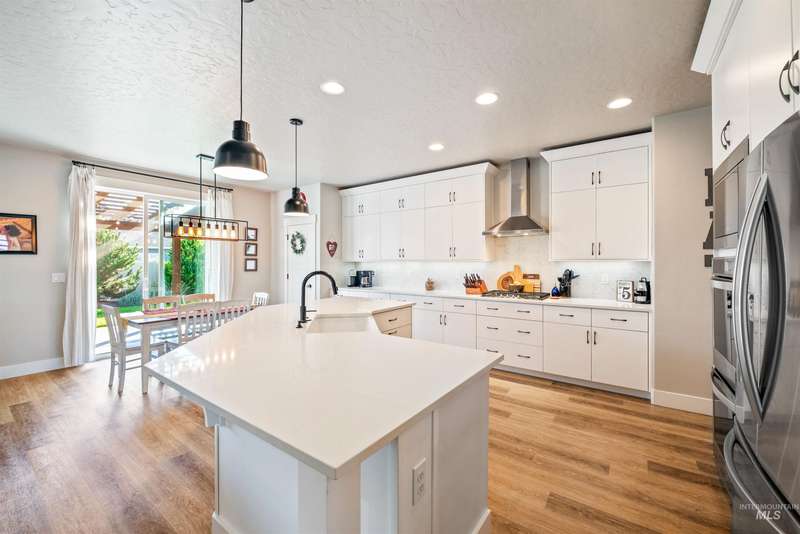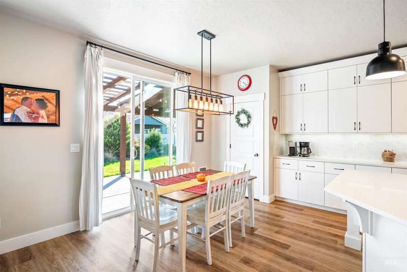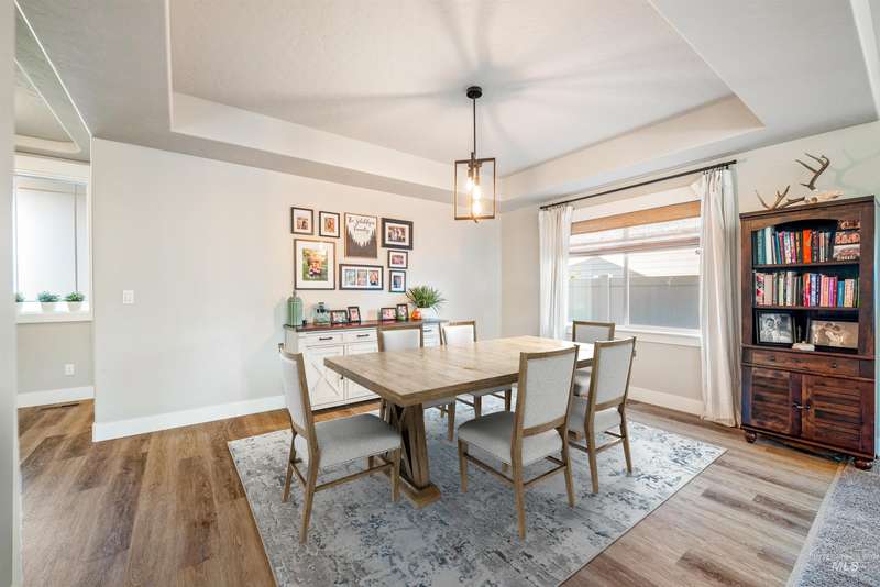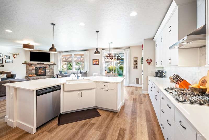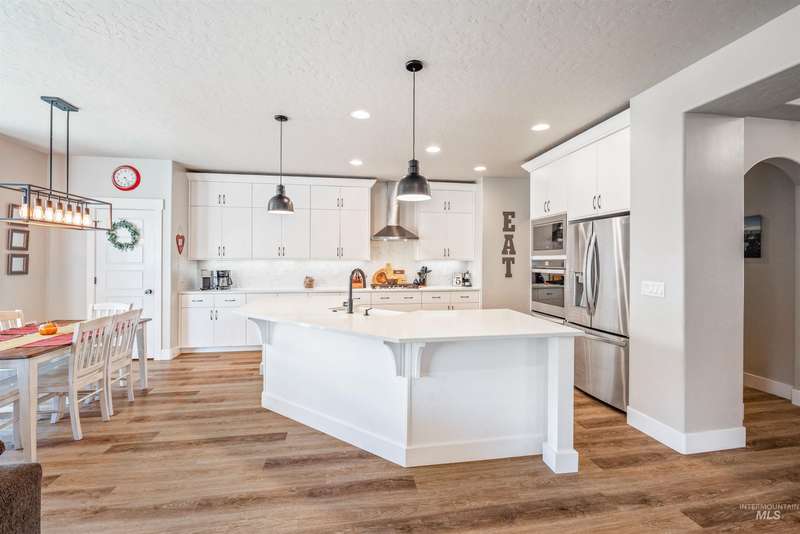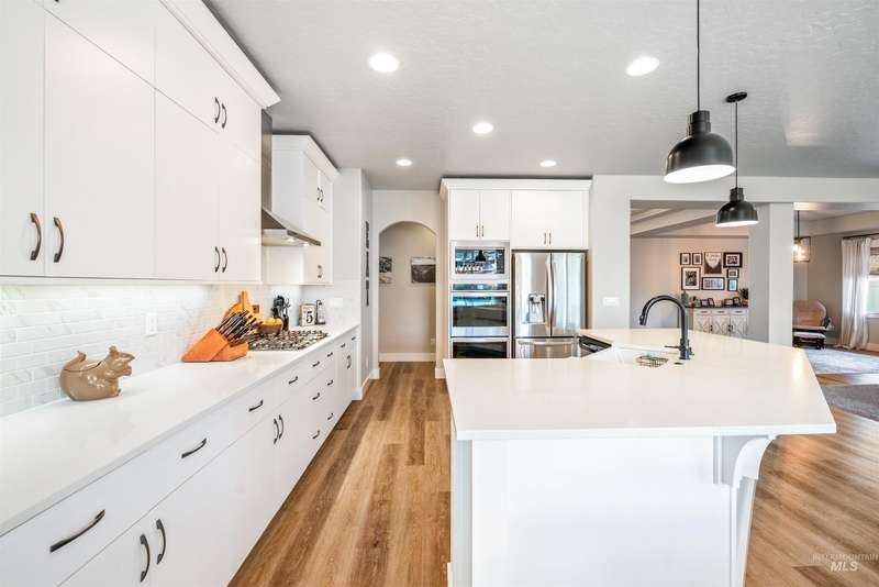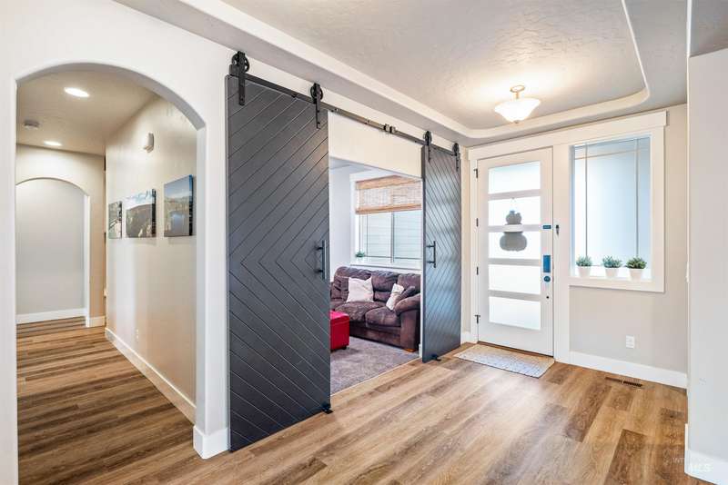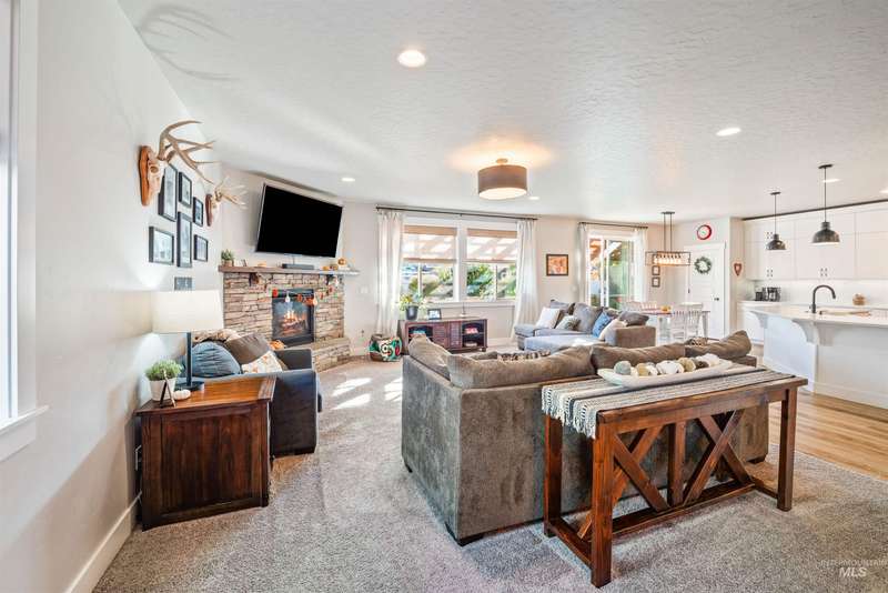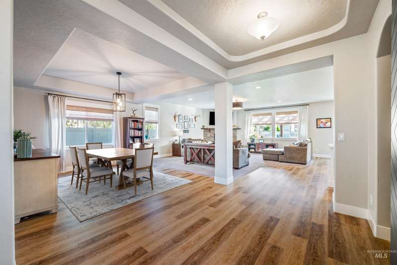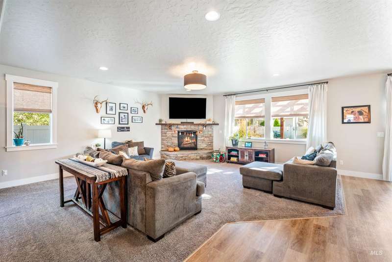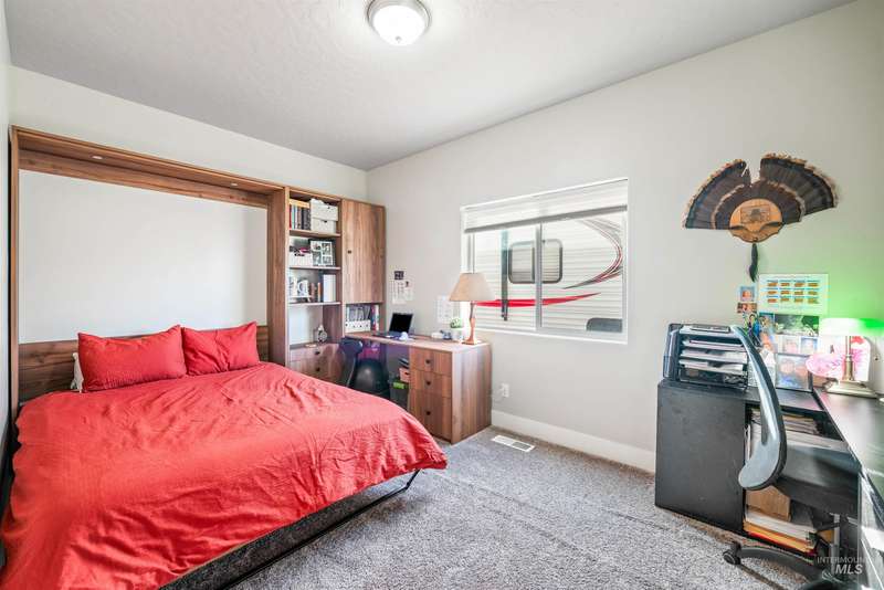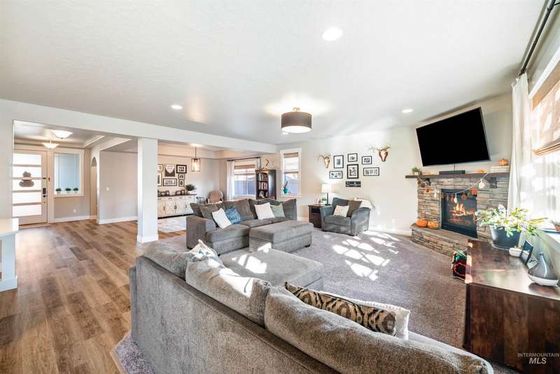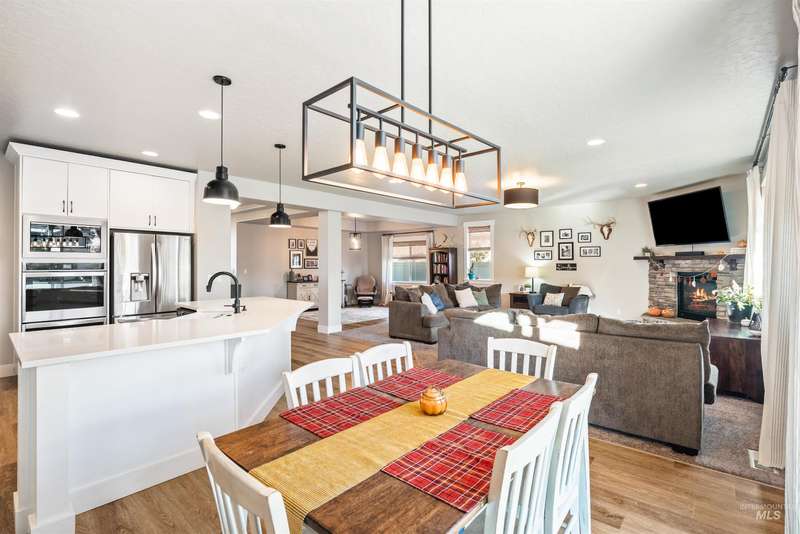 Stunning Single-Level Home with Modern Comforts and Timeless Style - Discover this beautifully designed single-level home offering a split-bedroom floor plan and an inviting open concept layout perfect for both everyday living and entertaining. The spacious great room features a cozy gas fireplace, seamlessly connecting to the gourmet kitchen with quartz countertops, farm sink, stainless steel appliances, double ovens, gas cooktop, and a large pantry—a chef’s dream! This home includes four bedrooms, with one featuring a convenient Murphy bed, plus a dedicated office and a formal dining room. The primary suite is a true retreat with two walk-in closets, dual quartz-topped vanities, a tiled walk-in shower, soaker tub, and private access to the covered patio. Enjoy indoor-outdoor living with a covered porch, expansive patio, and a fully fenced backyard—perfect for gatherings or quiet evenings. Additional highlights include RV parking, LVP flooring throughout, and access to a community pool and park. Conveniently located close to shopping, dining, and amenities, this home combines luxury, comfort, and functionality in one perfect package.