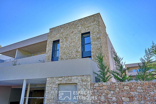 On the ground floor, the residence offers an architecture that combines natural stones and modern materials with beautiful natural through light.