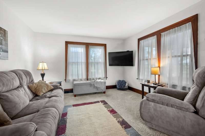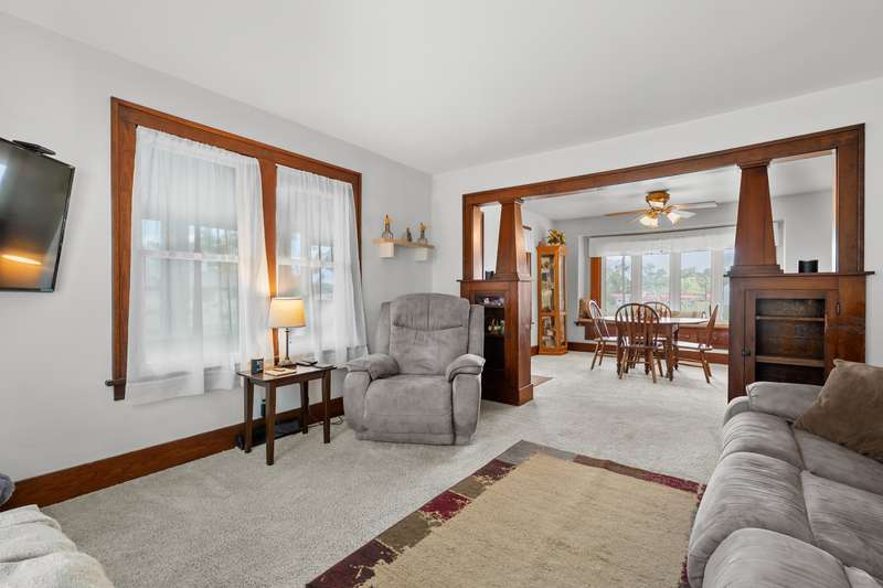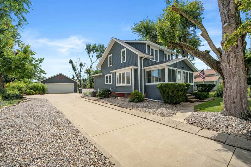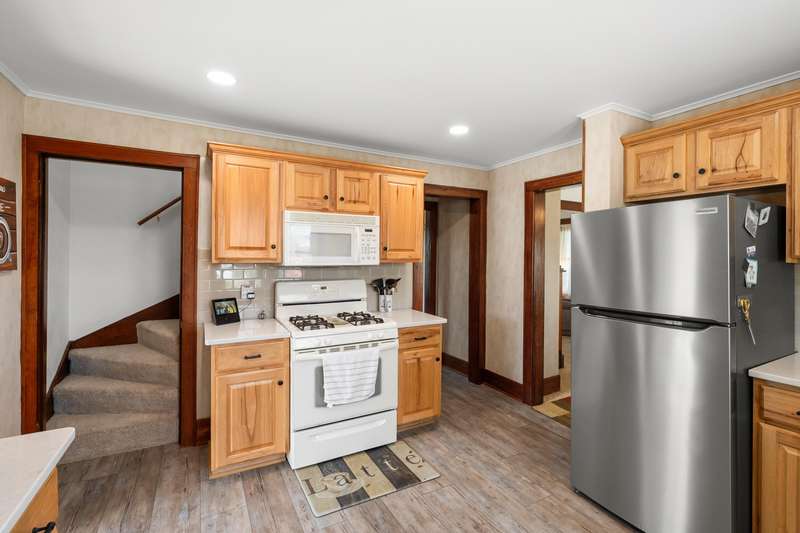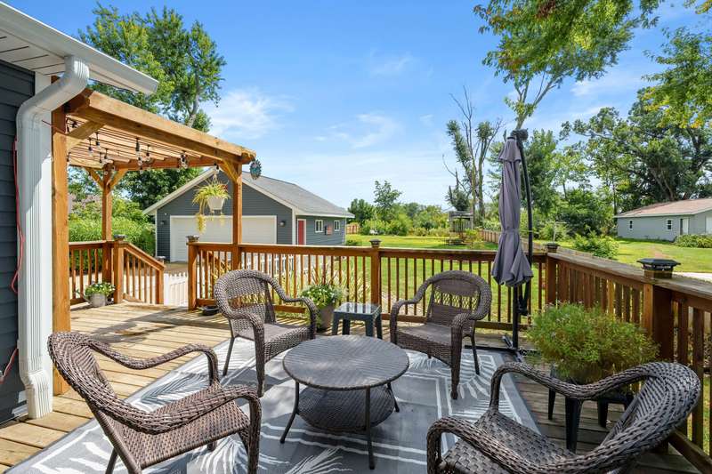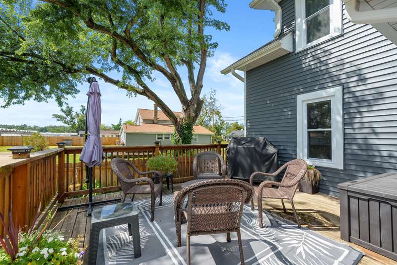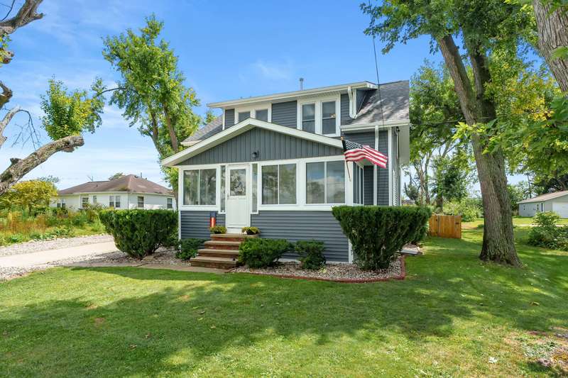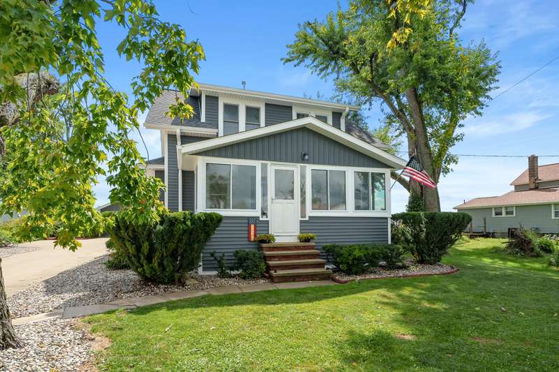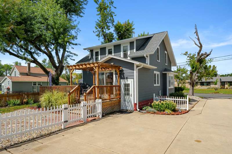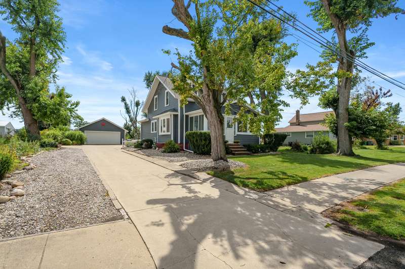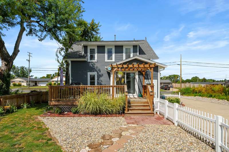 This charming Portage home is move-in ready with thoughtful updates throughout. The kitchen features hickory cabinets, granite countertops, vinyl plank flooring, a custom pantry, and all appliances. Enjoy the open dining room with a cozy bench seat, large windows, and an inviting living room with built-ins and original woodwork. The enclosed front porch adds 3-season living space. The main floor includes a versatile bedroom or office. Upstairs offers three bedrooms and a full bath. The freshly finished basement adds extra living area, a new drop ceiling, and a half bath-ideal for entertaining or a home gym. Recent updates: 2024-new roof, soffit, Tyvek wrap, siding, gutters, patio slider, 24 windows, central A/C, water heater, washer/dryer; 2023-kitchen & bath remodel, sump pump; 2017-deck & pergola. Outside features an oversized 2-car garage, new 12*16 shed, and a rare 1/2-acre fenced lot near schools, shopping, and conveniences.