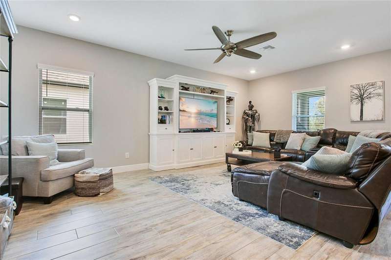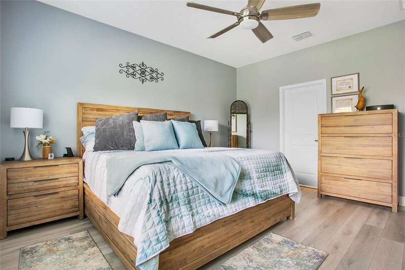 Built in 2023 and situated in the Hampton Oaks neighborhood, the home offers a peaceful oasis that backs up to a conservation area with a lake, providing a relaxing water view. Start your mornings with coffee or unwind in the evening with a glass of wine or dinner from the comfort of your screened lanai, which is plumbed for an outdoor kitchen. The split floor plan provides privacy, while the open-concept living and dining area is perfect for everyday living and entertaining. At the heart of the home, the kitchen boasts a large walk-in pantry, a spacious island, and a well-appointed chef's kitchen, making it ideal for hosting family gatherings. Many builder and homeowner upgrades, including epoxy floors in the garage and on the lanai, a Tesla charger, whole-house surge protection, and more, make this home a standout. Located in Volusia County, just 25 miles from the ocean and conveniently situated between Orlando and Daytona Beach, the area is ideal for those who appreciate nature trails, community events, and a more relaxed lifestyle away from the city's hustle and bustle.