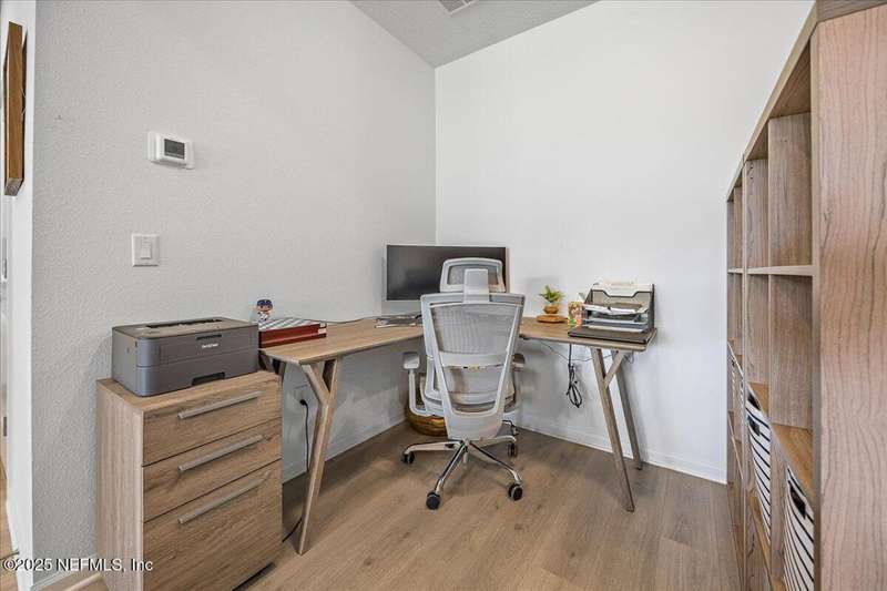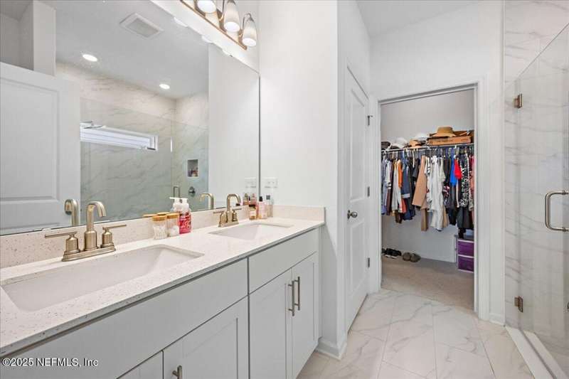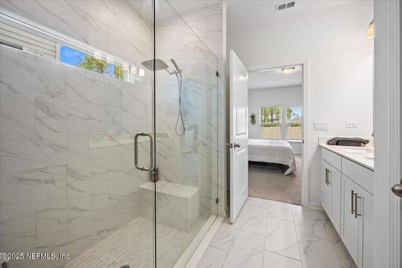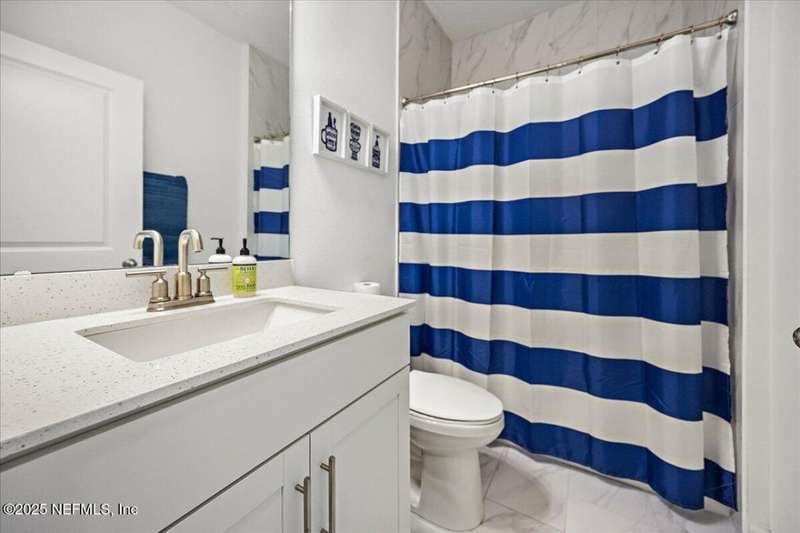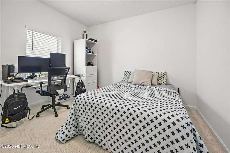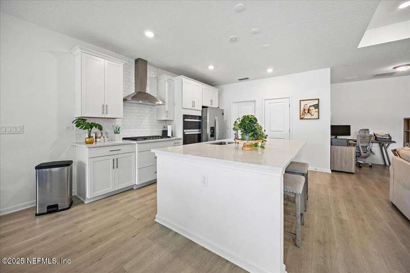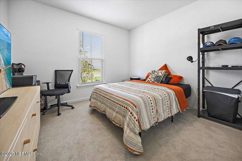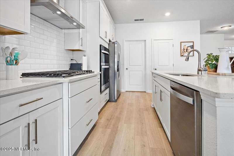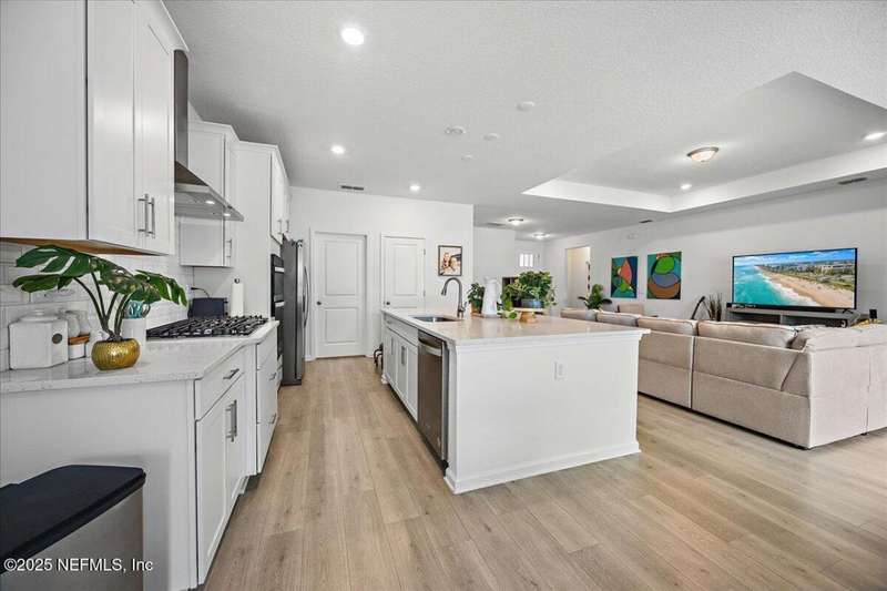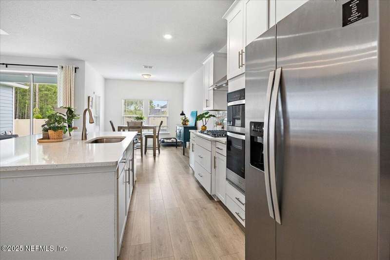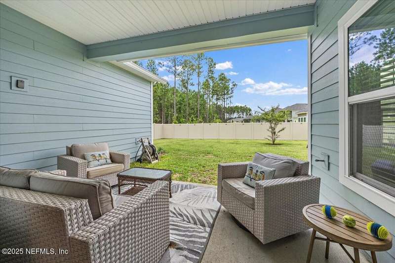 Don't miss this opportunity to own a beautifully upgraded 3-bed, 2-bath single-story home with a 2-car garage in St. Johns County! This home features an open-concept living and elegant, modern finishes throughout. Step inside through double front doors into a bright and airy space featuring luxury vinyl plank flooring, white cabinetry, and quartz countertops. The gourmet kitchen includes a large island, stainless steel natural gas cooktop, wall-mounted hood, built-in oven tower, and a full backsplash extending to the ceiling for a sleek, contemporary look. The family room boasts a tray ceiling, and the layout flows seamlessly to a covered lanai, ideal for outdoor relaxation or entertaining. The fully fenced backyard includes solar lighting and a side gate. Gutters around the entire home for added convenience. Epoxy Garage Floors. This home blends luxury, comfort, and unbeatable location-schedule your private showing today! Move-In Ready! Stunning Camden Plan in Beacon Lake on 53' Lot. Retreat to a luxurious owner's suite with a frameless glass shower, tile extended to the ceiling, seating, transom window, and a spacious walk-in closet. Bathrooms feature quartz vanities, Moen fixtures, and upgraded undermount sinks. Other highlights include: Natural gas tankless water heater. Water softener loop with outlet in garage, Energy Star appliances, 2 eco white blinds throughout, upgraded carpet in bedrooms, Nobleza Astorga tile in baths, laundry, and HVAC closet. Located in a resort-style, natural gas community, Beacon Lake offers world-class amenities including a 43-acre lake, clubhouse, fitness center, pool, splash park, tennis and pickleball courts, playgrounds, and top-rated St. Johns County schools.